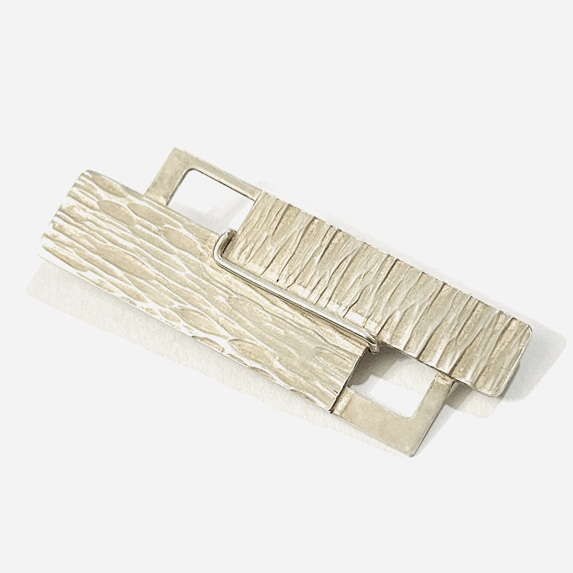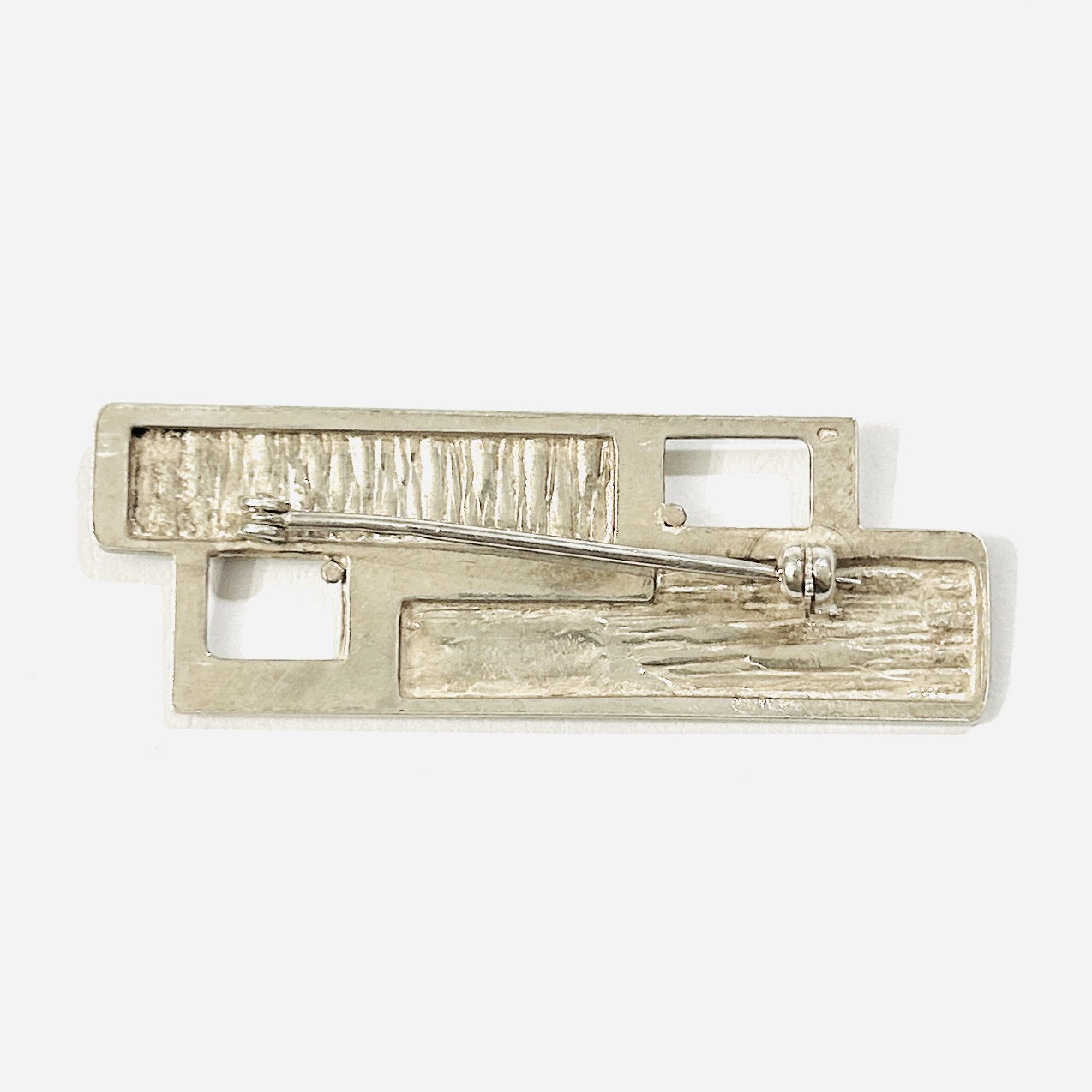 Nevšední, nadčasová brož ve stylu brutalismu, kompozice těla složena z obdélných částí. Povrch hladkého kovu v kontrastu s organickým plastickým dekorem odkazující k otisku betonového bednění, prostorově propojeno dvěma průhledy. Originální design malosériové produkce, solidní práce československého klenotnického družstva Znak či Zlatokov z 1. poloviny 70. let 20. století. Sběratelsky zajímavé.