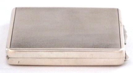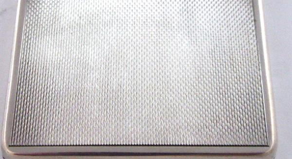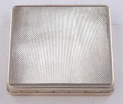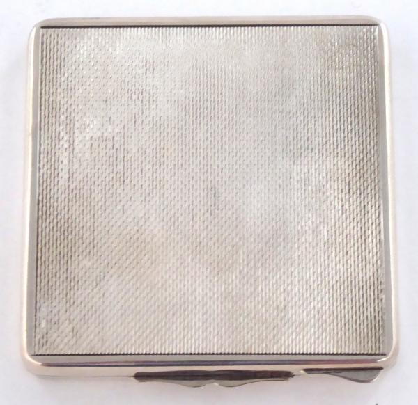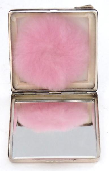 Leštěné stříbro. Ryzost Ag 800 / 1000. Celková hmotnost 60,65 gramů. Čtvercového tvaru. Zdobená gilošováním na čelní a spodní straně. Odklopné víčko zespodu s vsazeným zrcátkem zdobeným broušenými fazetami. Uvnitř ve spodní části sítko na pudr a labutěnka. Značená: ryzostí 800, nezřetelnou puncovní značkou. Rozměr 6 x 6 cm. Evropa, minulé století. Osvědčení Puncovního úřadu.