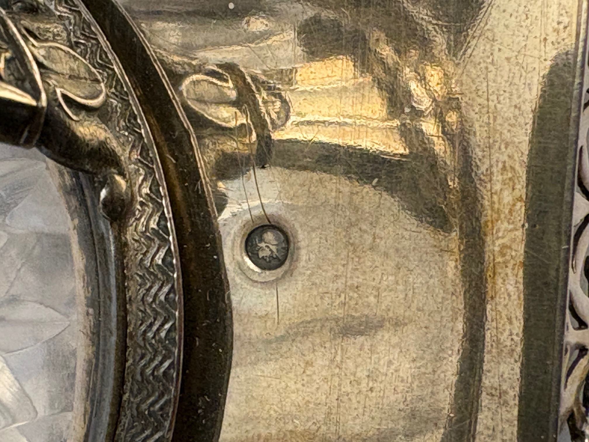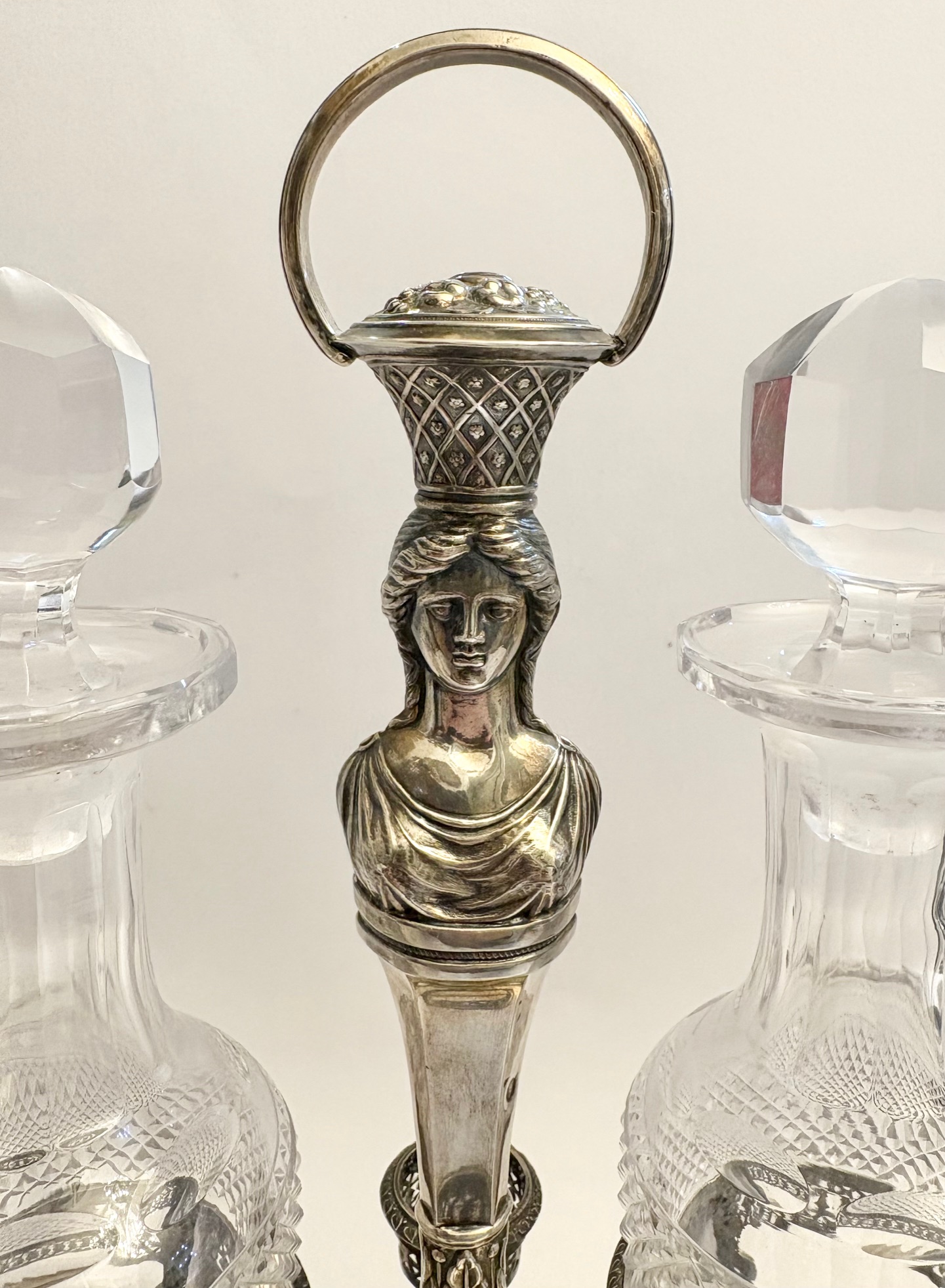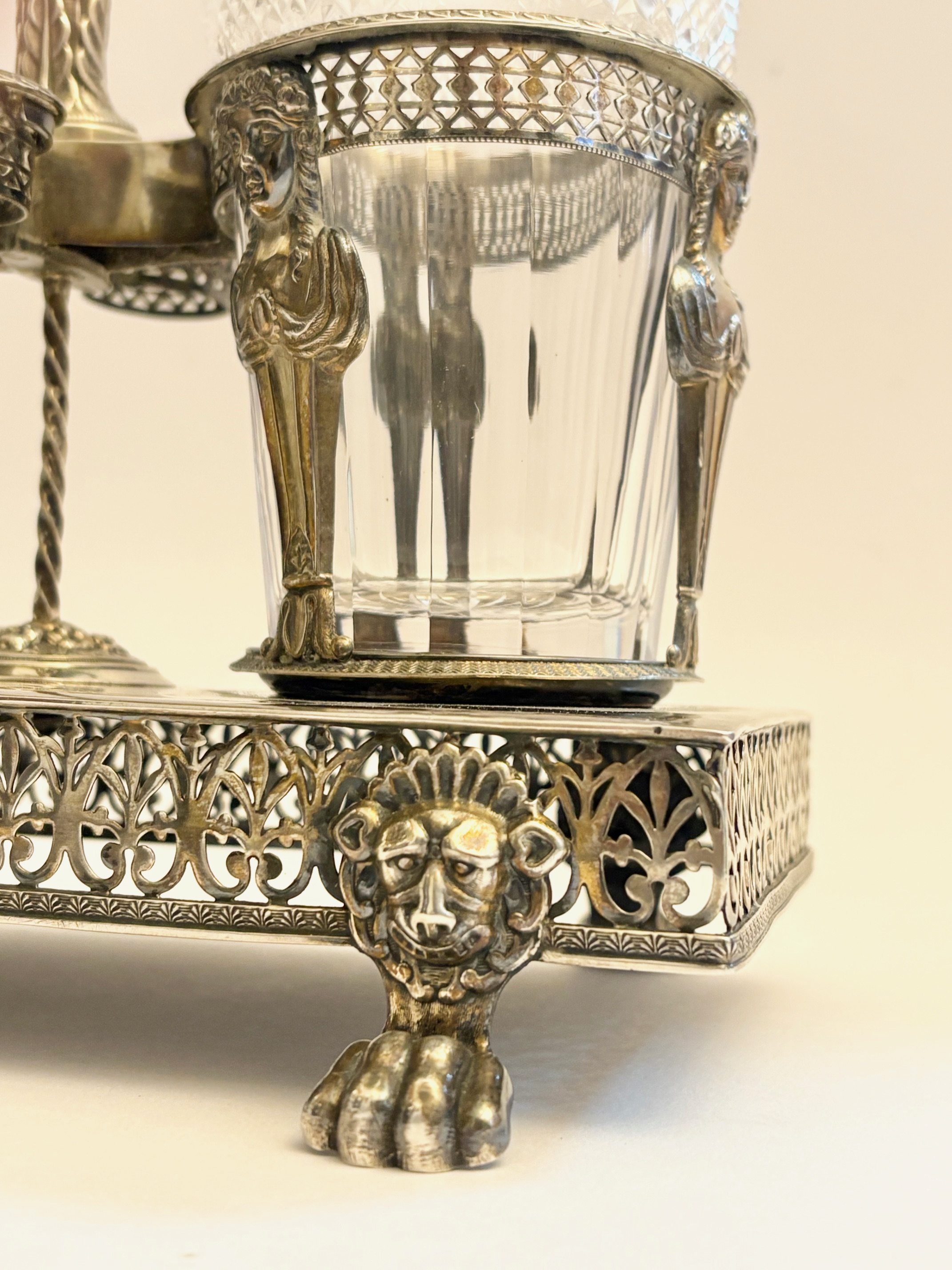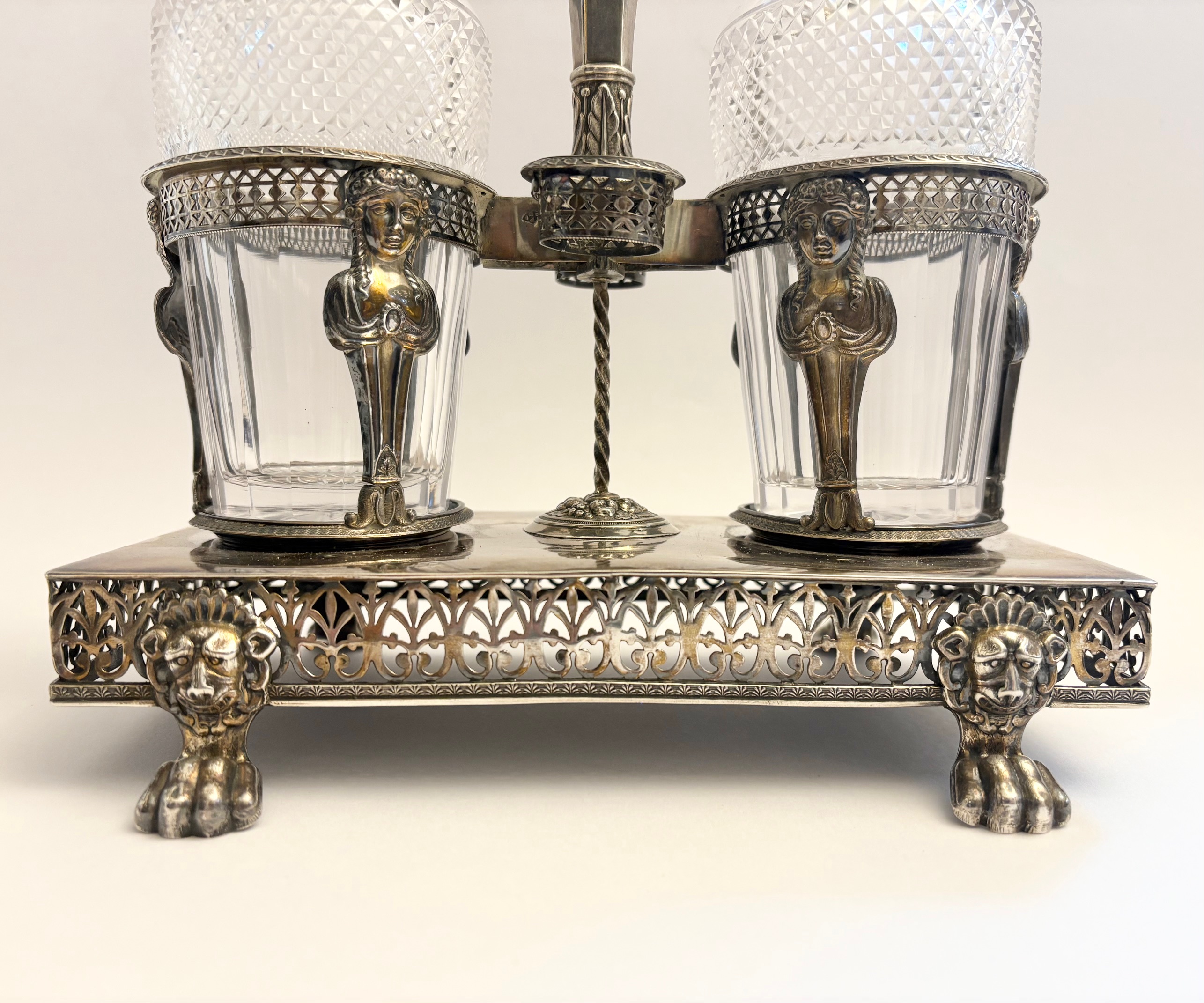 Stříbrná Empírová menáž Na olej a ocet Ag 950/1000 Broušené sklo Francie kolem roku 1820 Rozměry: 33 x 21,5 x 11 cm Hmotnost: 570,15 g