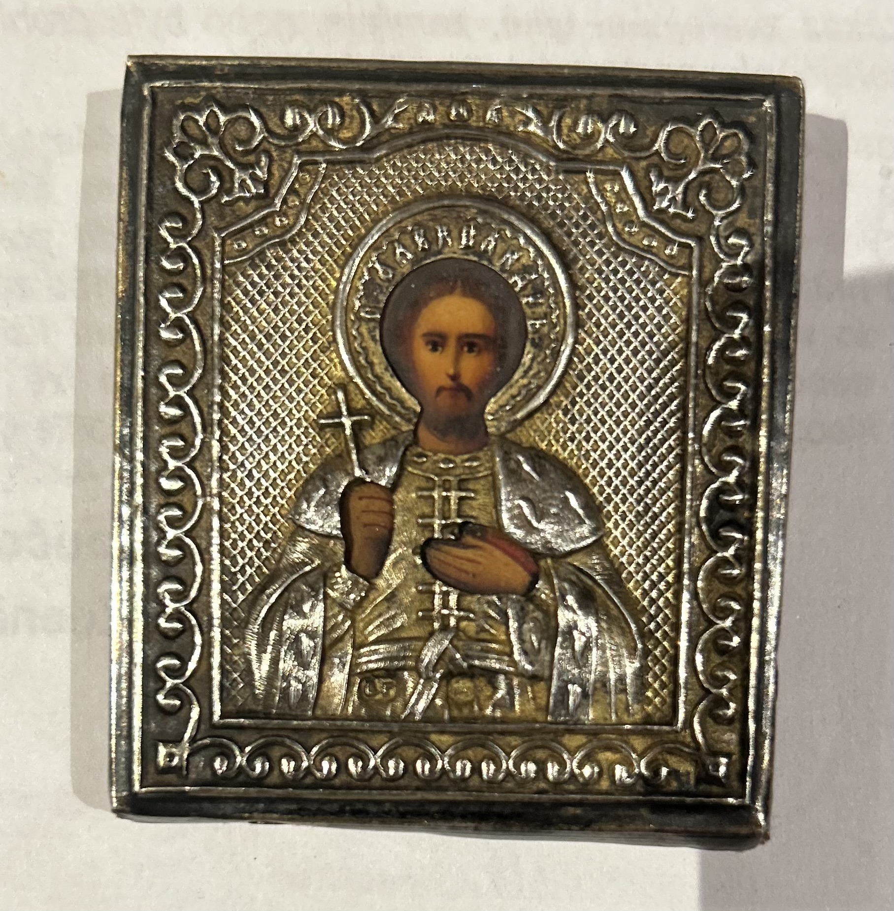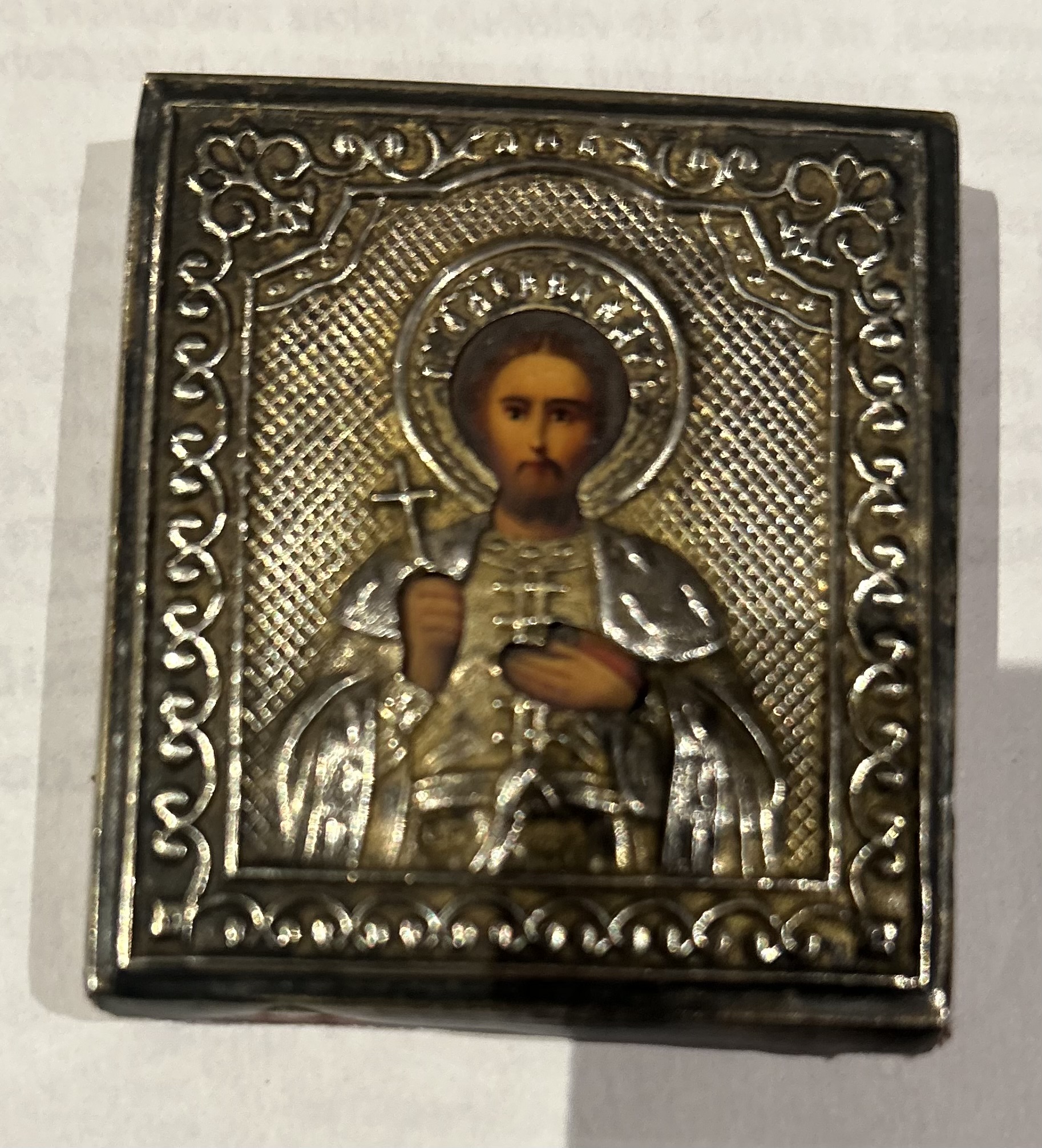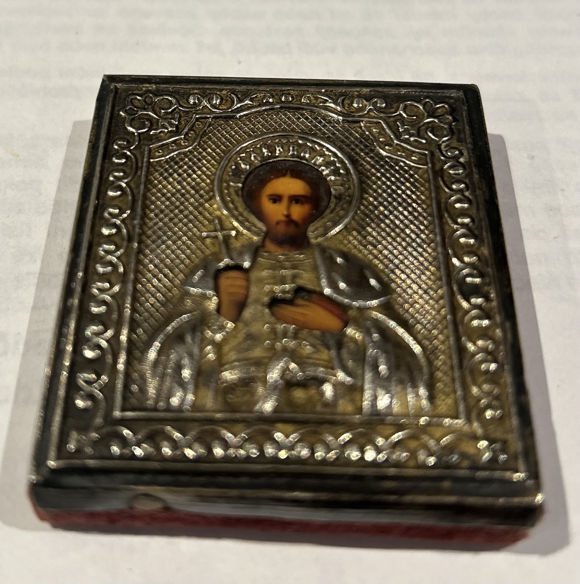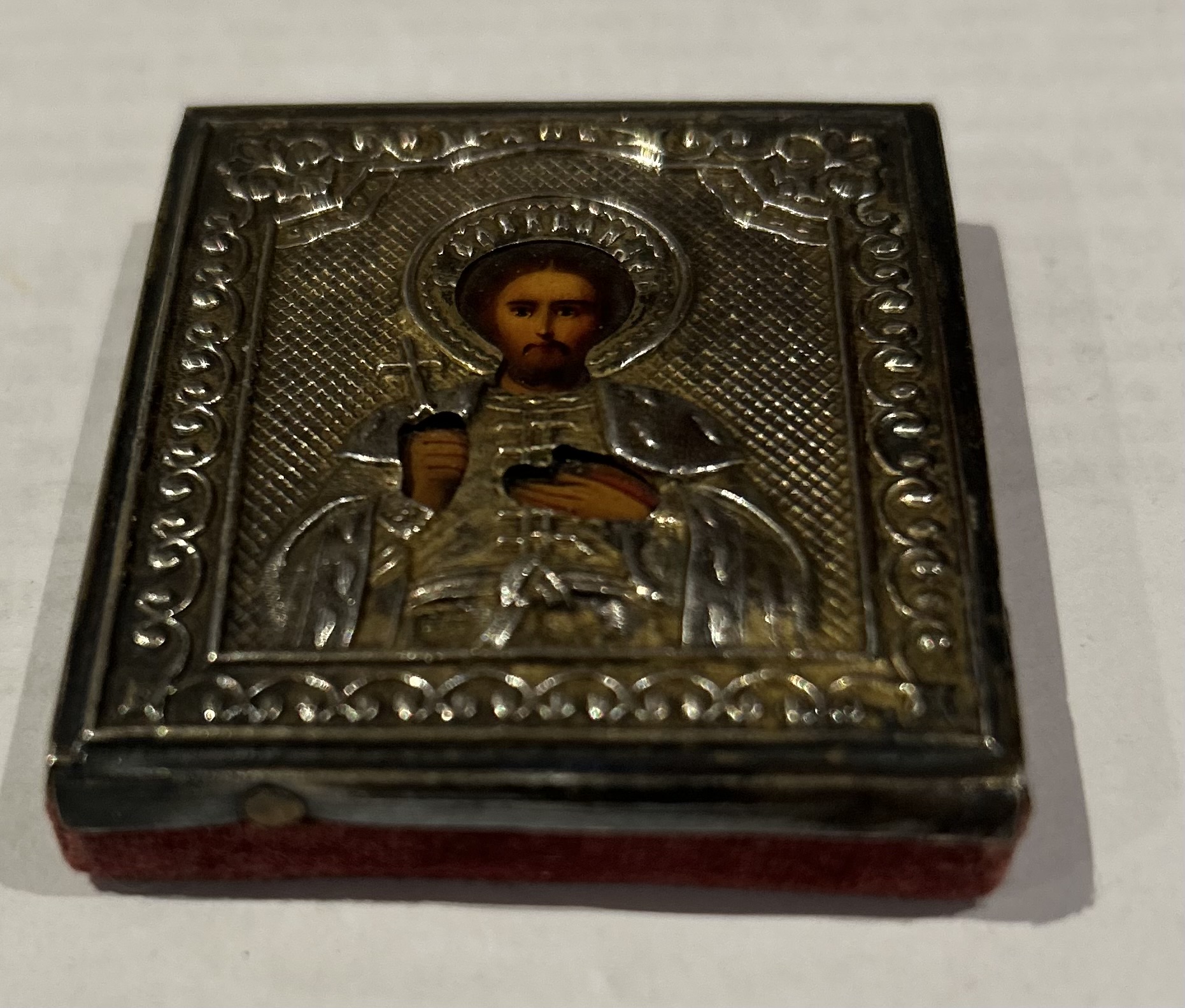 Krásná stříbrná pravoslavená ikona zobrazující Krista Pantokratora/Vševládce,jedná se o velmi významný typ ikony,jedná se o typ,který mohl mít majitel stále u sebe,má červený podklad,stříbrná část nemá punc