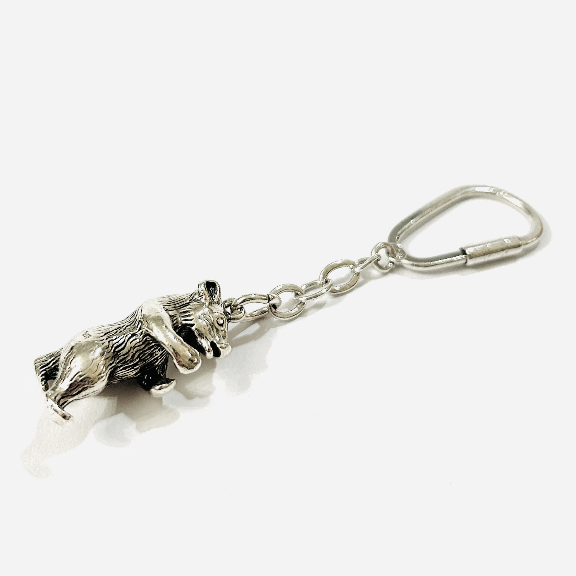 Masivní klíčenka s ověskem ve tvaru stojícího medvěda, plasticky vyvedené detaily. Solidní německá práce z 2. poloviny 20. století.