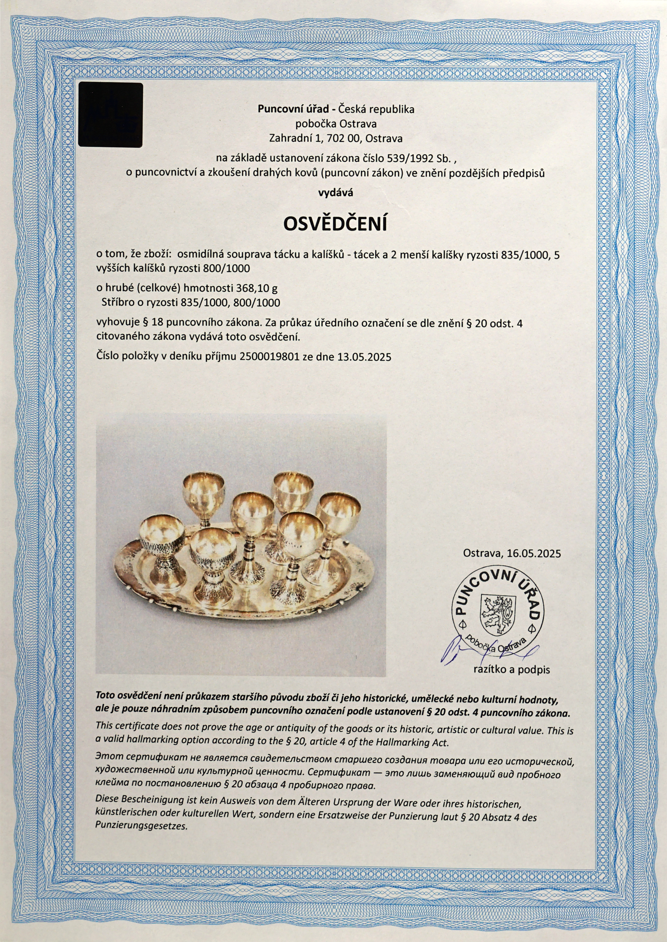 Váha 368,08 g / 800. Puncováno. Výška: 8,5 cm, šířka: 13,5 cm, délka: 25 cm, váha: 368,08 Stav: Dobrý