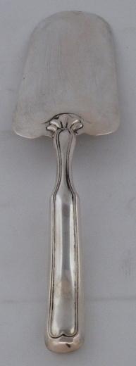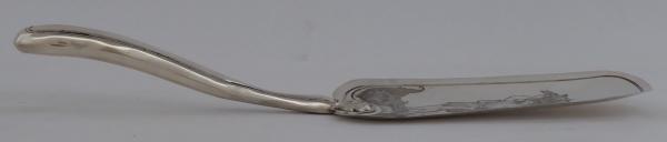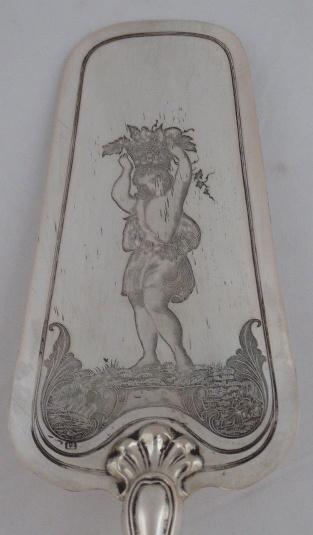 Leptané a gravírované 12 lotové stříbro. Ryzost Ag 750 / 1000. Hmotnost 50,20 gramů. Obdélná plochá mírně klenutá lopatka. Zdobená motivem chlapce s košíkem ovoce na hlavě. Ve spodní části zdobný ornament listů. Oválná dutá obloukovitě tvarovaná rukojeť zakončená u lopatky ornamentem mušle. Značená: číslo 12 v rámečku. Německo 1860 – 1885. Zespodu u úchytu lopatky příčná prasklina. Osvědčení Puncovního úřadu. Délka 28 cm.