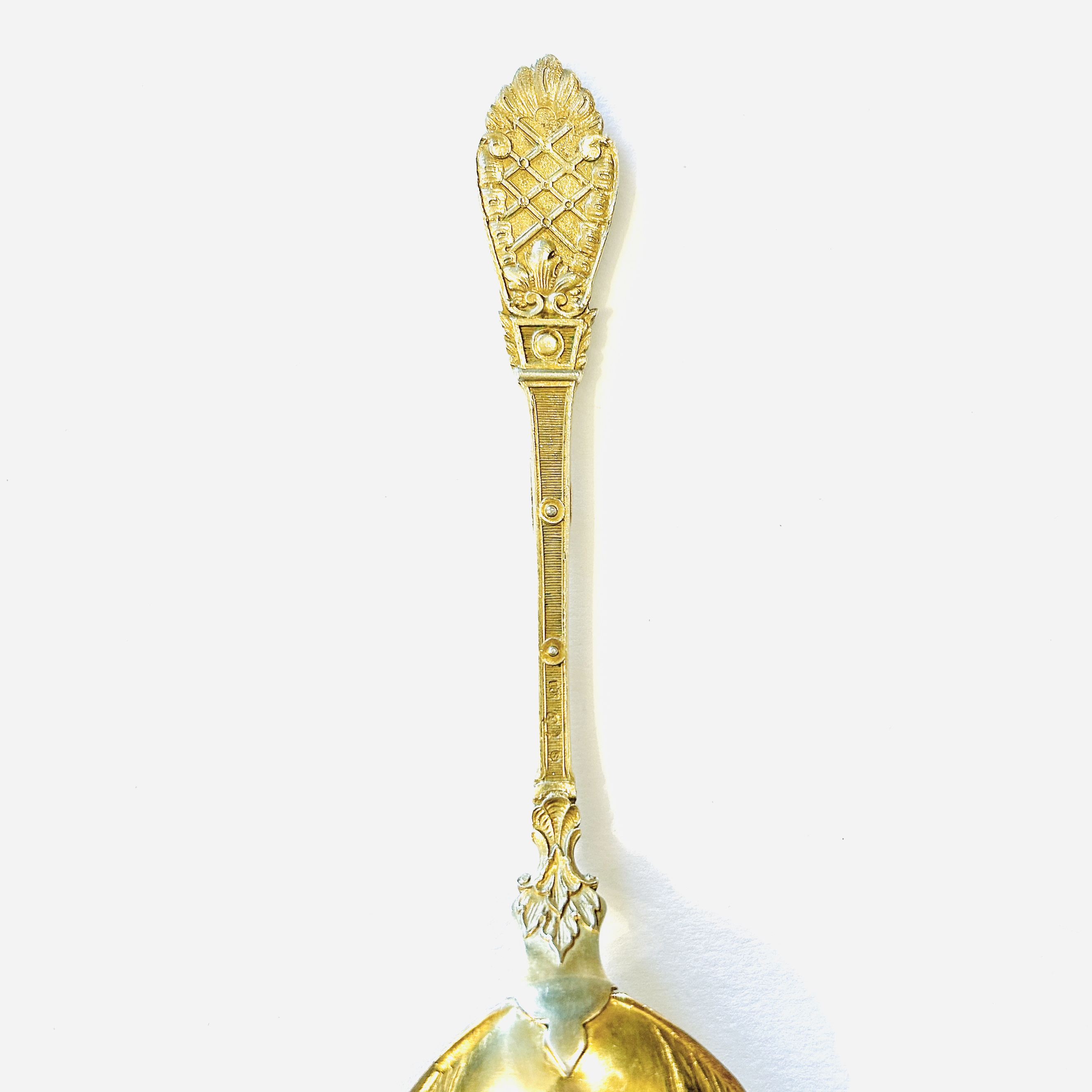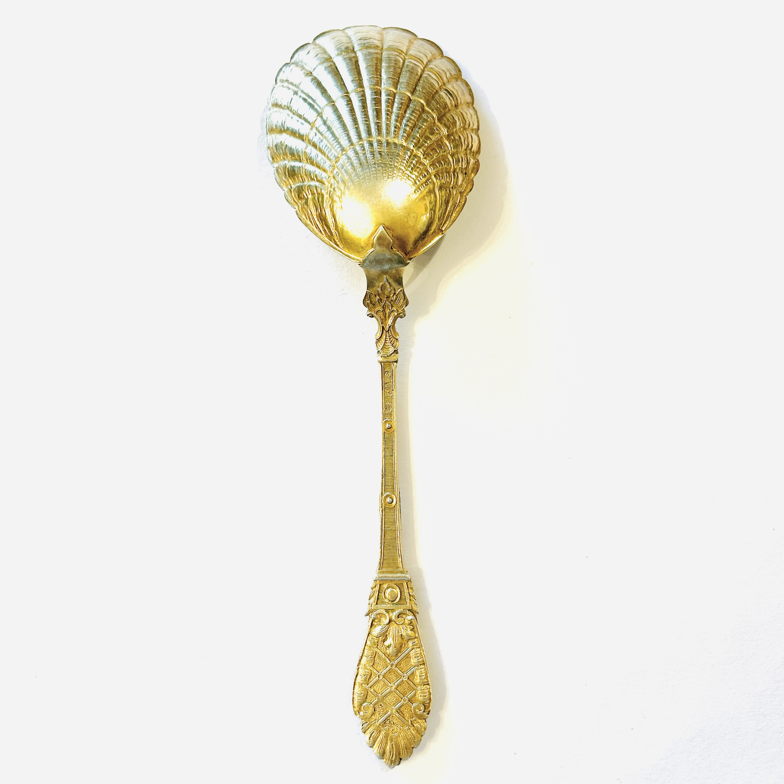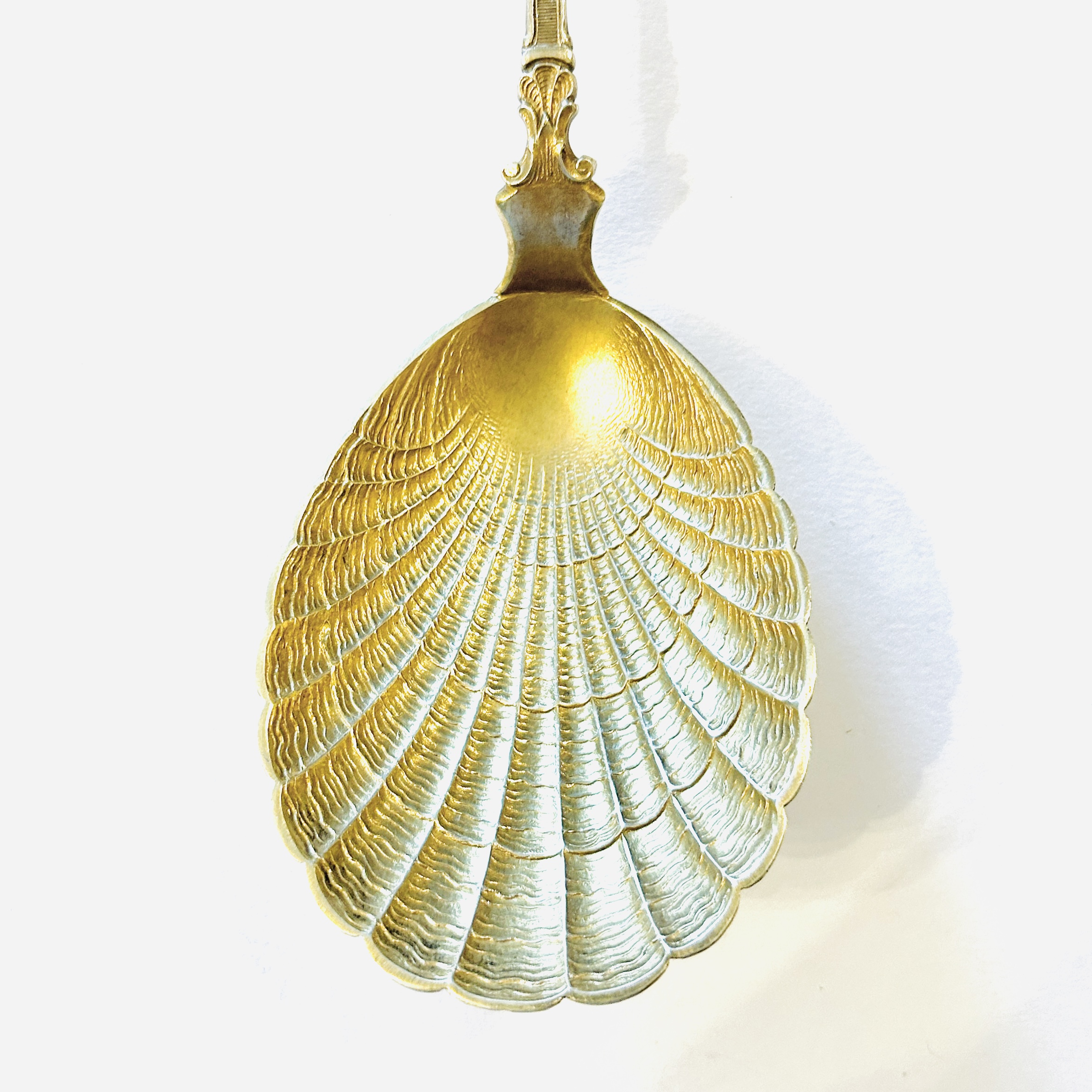 Dekorativní servírovací lžíce v novorenesančním stylu, střenka plasticky zdobena rokajovými a florálními motivy s hlavou andílka s křídly, miska ve tvaru detailně tvarované lastury. Honosný kousek stolního stříbra ze 70. až 80. let 19. století, mistrovská stříbrnická práce berlínské dílny Franze Gustava Davida Vollgolda (1810-1880) a syn, od roku 1860 německými dvorskými zlatníky.