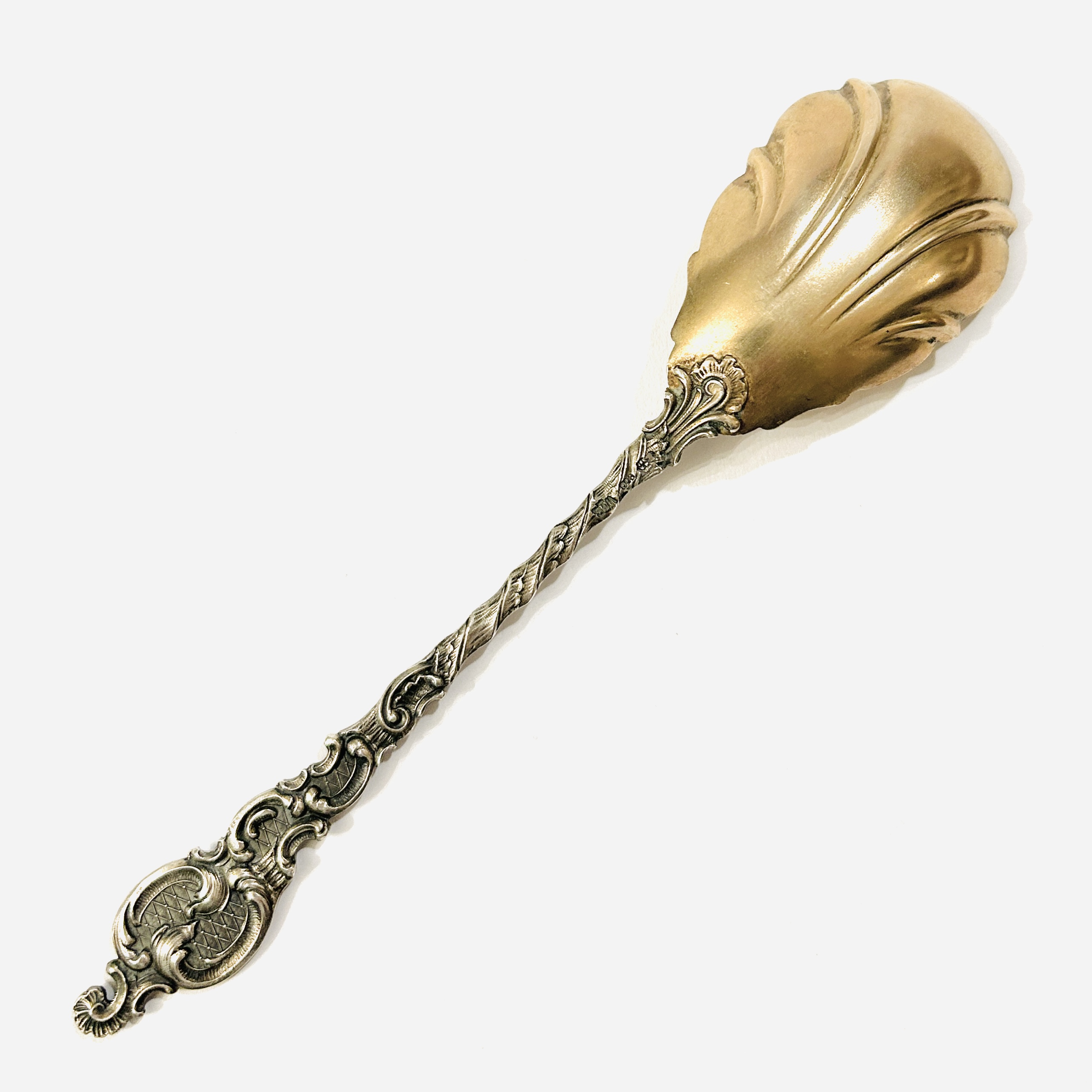 Dekorativní servírovací lžíce, miska ve tvaru lastury kontrastně matně zlacena, střenka s oboustranně plasticky vyvedena s výrazným rokajovým tvaroslovím. Honosný kousek stolního stříbra, mistrovská stříbrnická práce, možná z dílny Wilhelma Bindera ze Schwäbisch Gmünd z poslední pětiny 19. století.