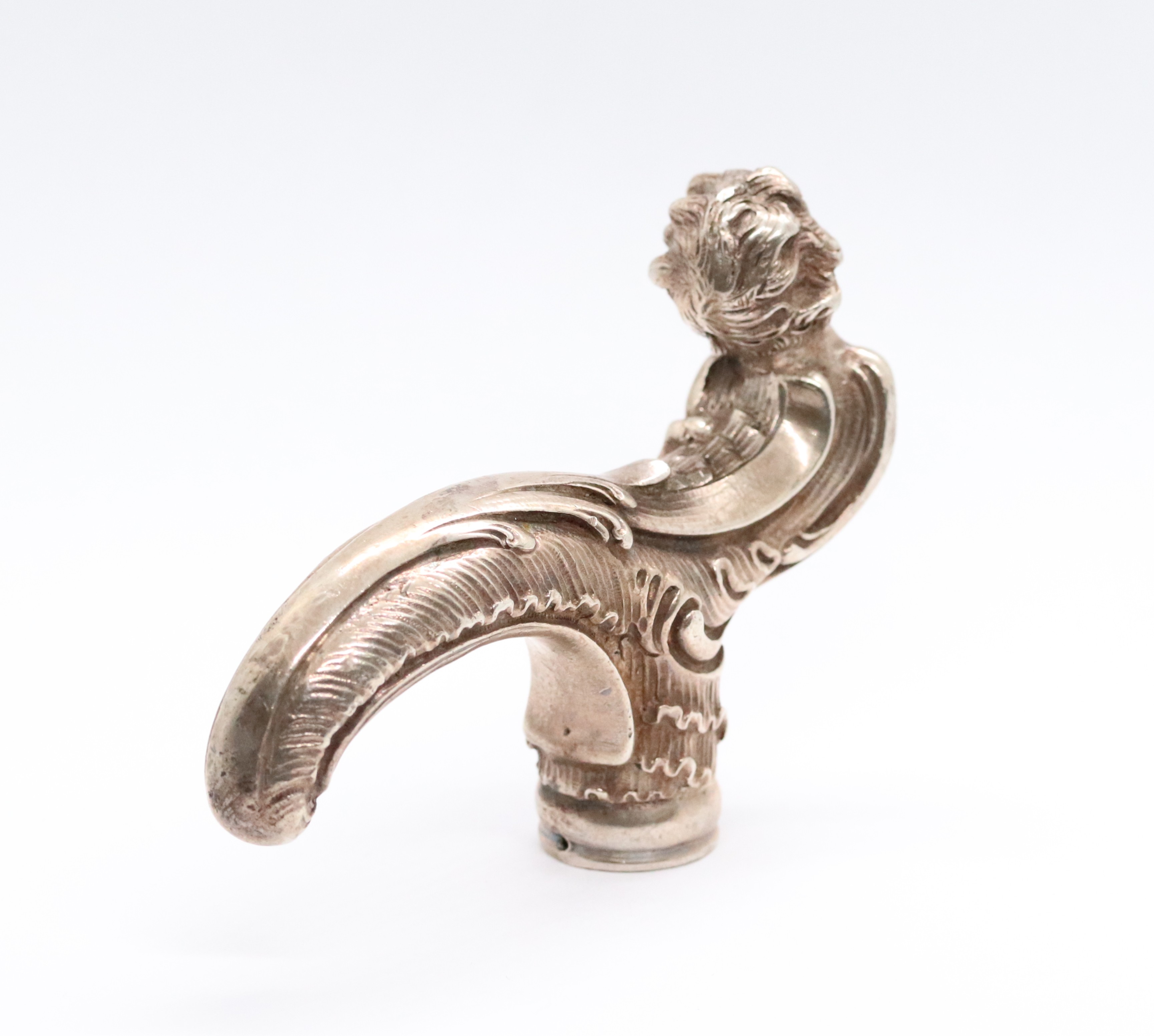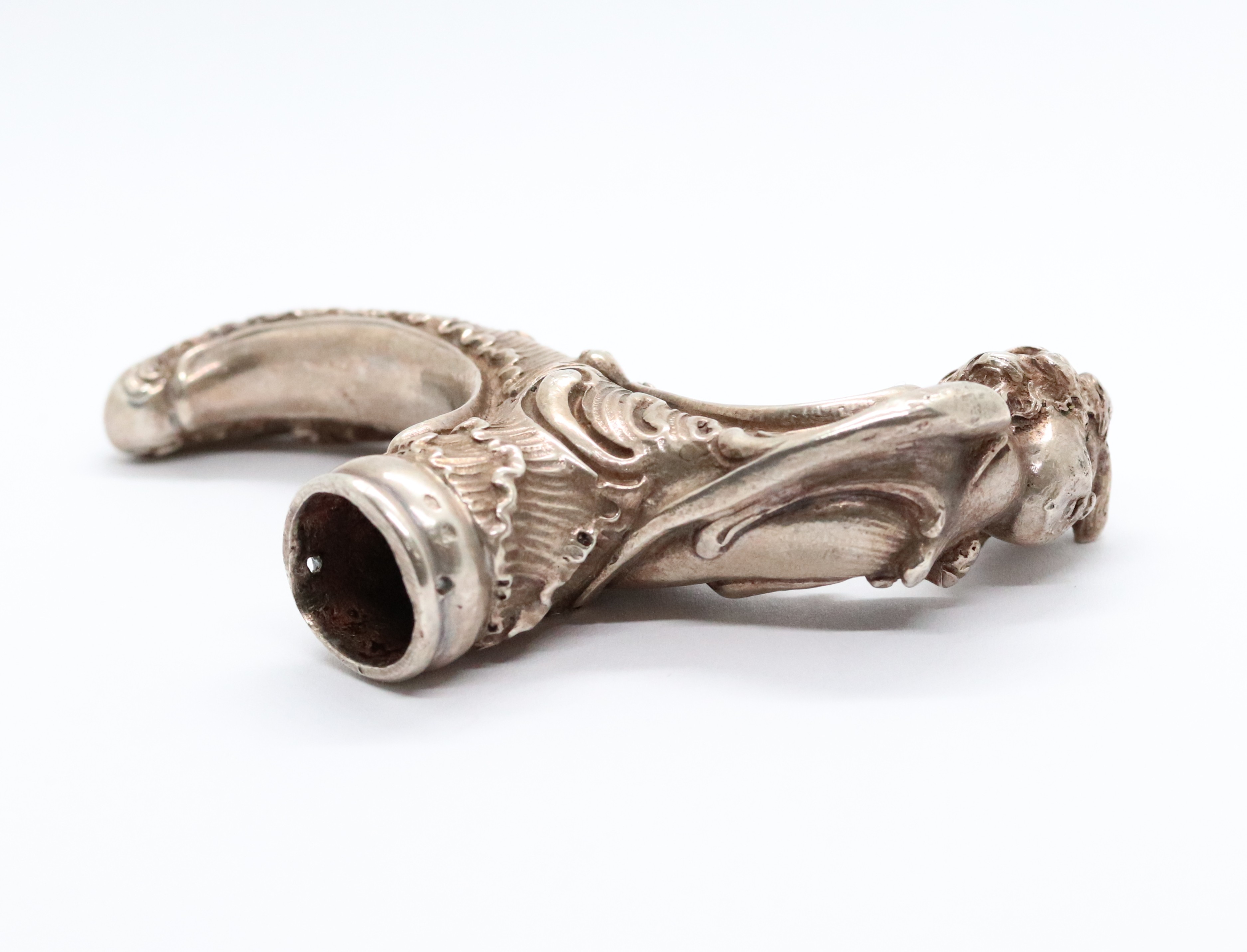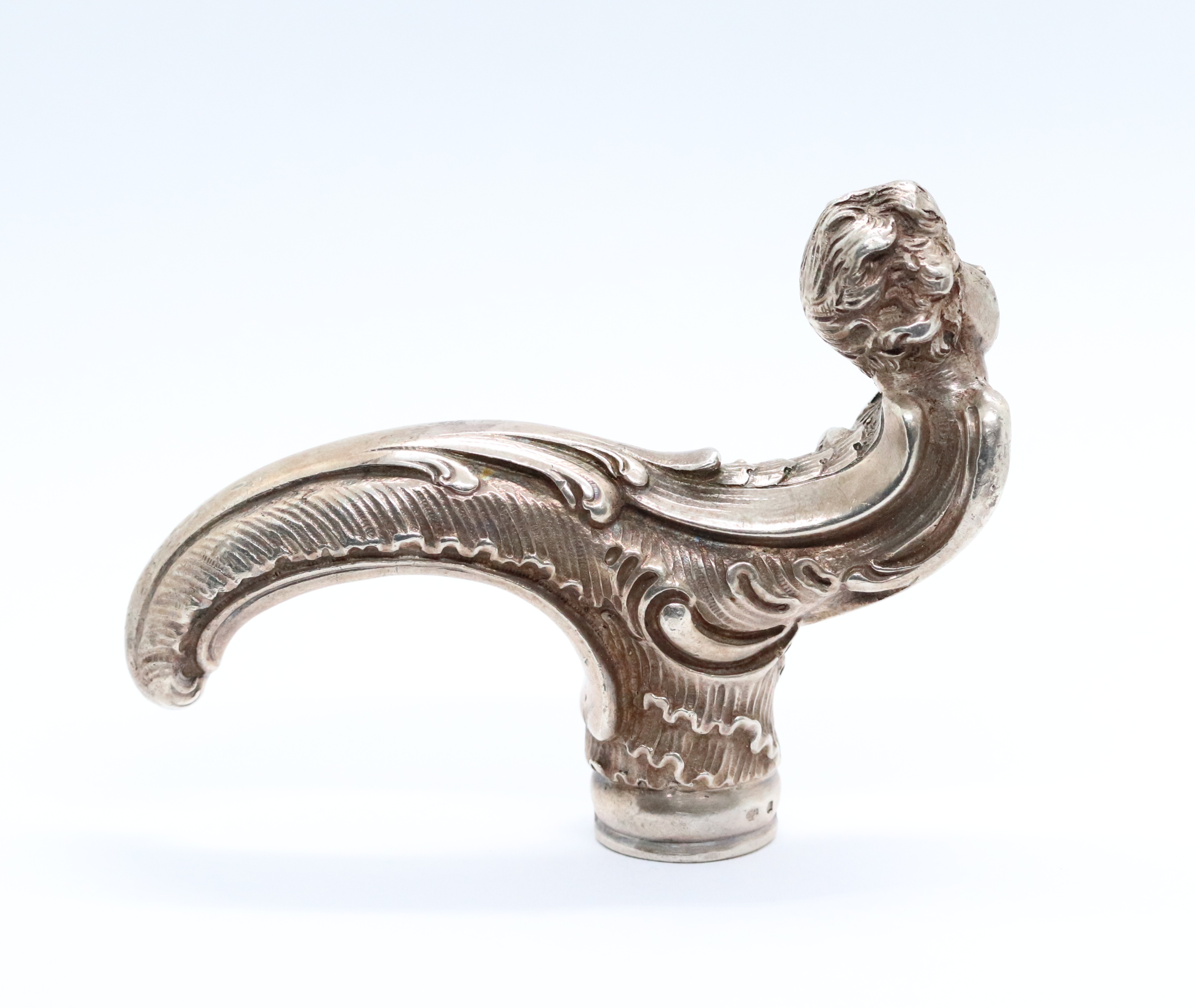 Stříbrná, neobarokní, bohatě zdobená rukojeť k hůlce, Ag 156,62g/750/1000, Rakousko-Uhersko, Praha, kolem roku 1880; délka 10,5 cm, průměr otvoru na hůlku 1,9 cm