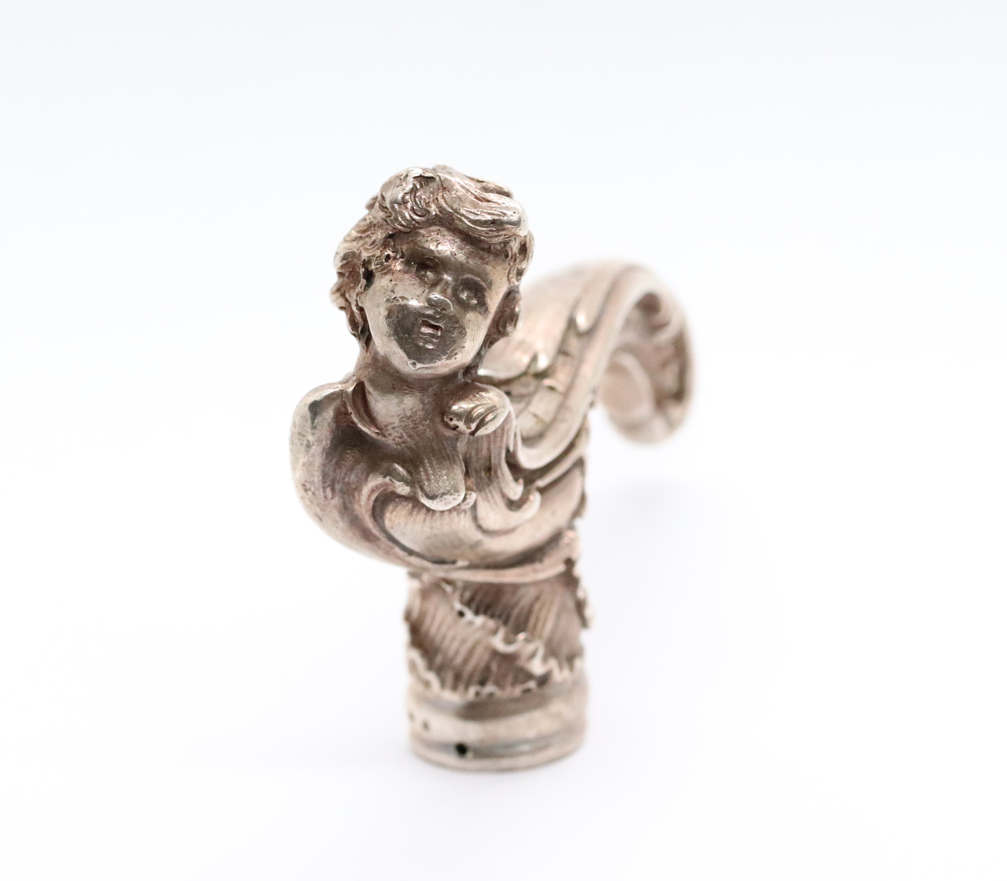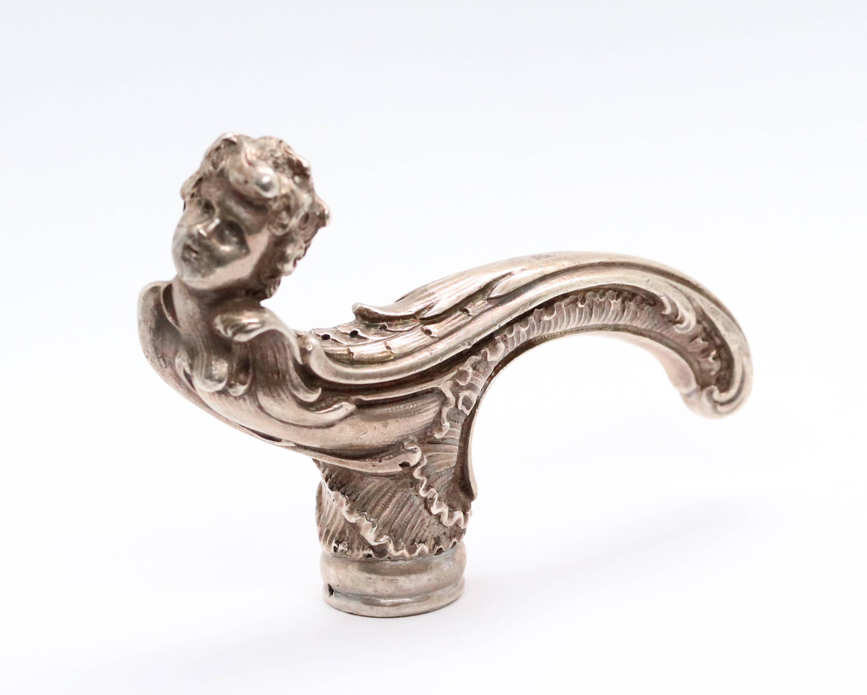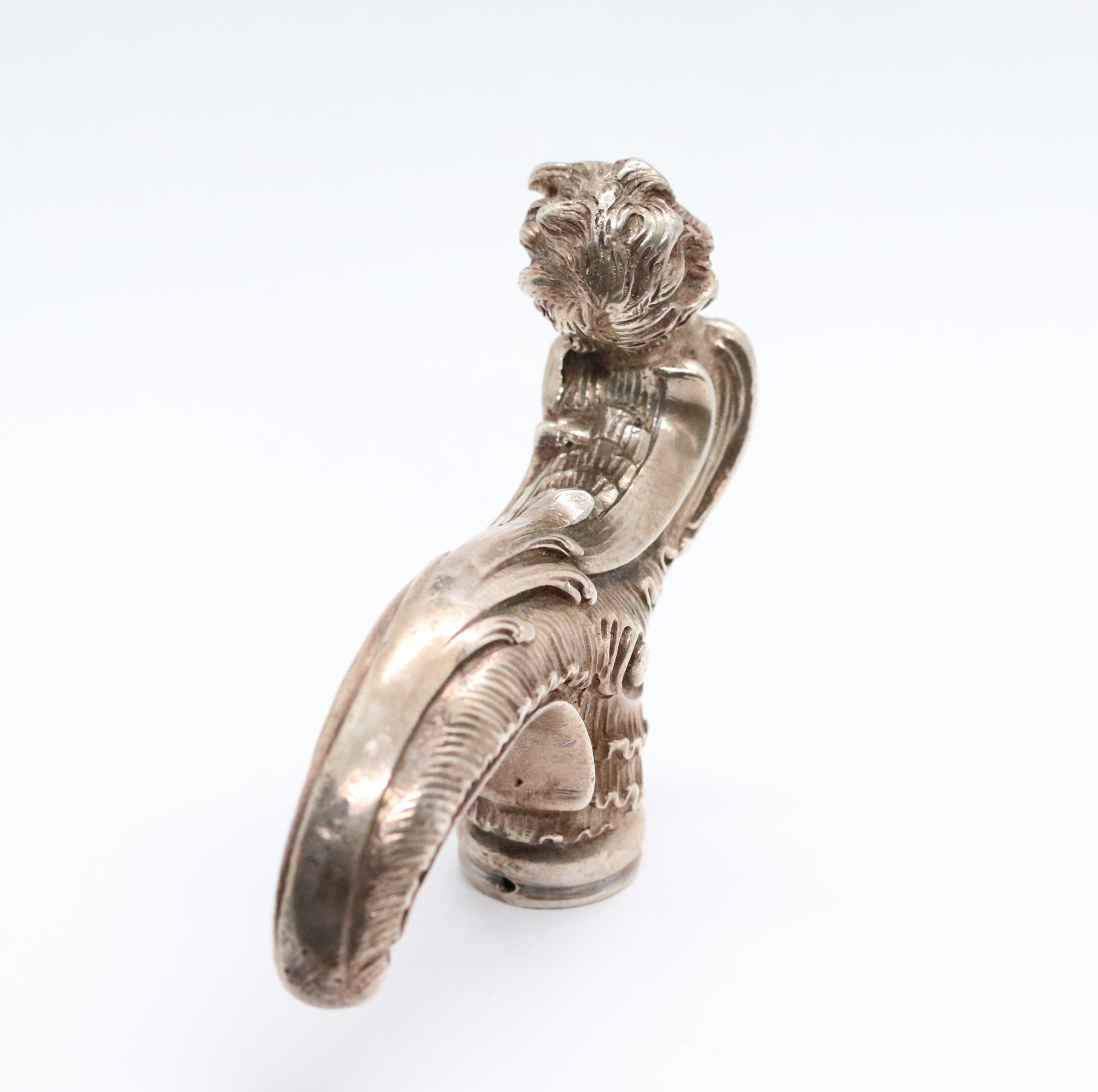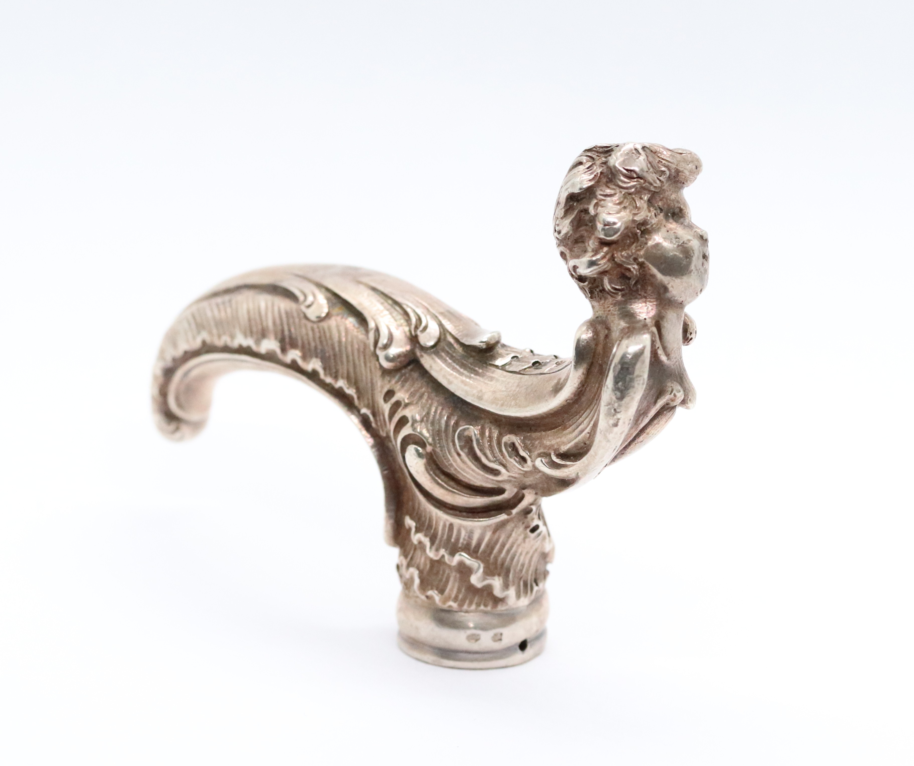 Stříbrná, neobarokní, bohatě zdobená rukojeť k hůlce, Ag 156,62g/750/1000, Rakousko-Uhersko, Praha, kolem roku 1880; délka 10,5 cm, průměr otvoru na hůlku 1,9 cm