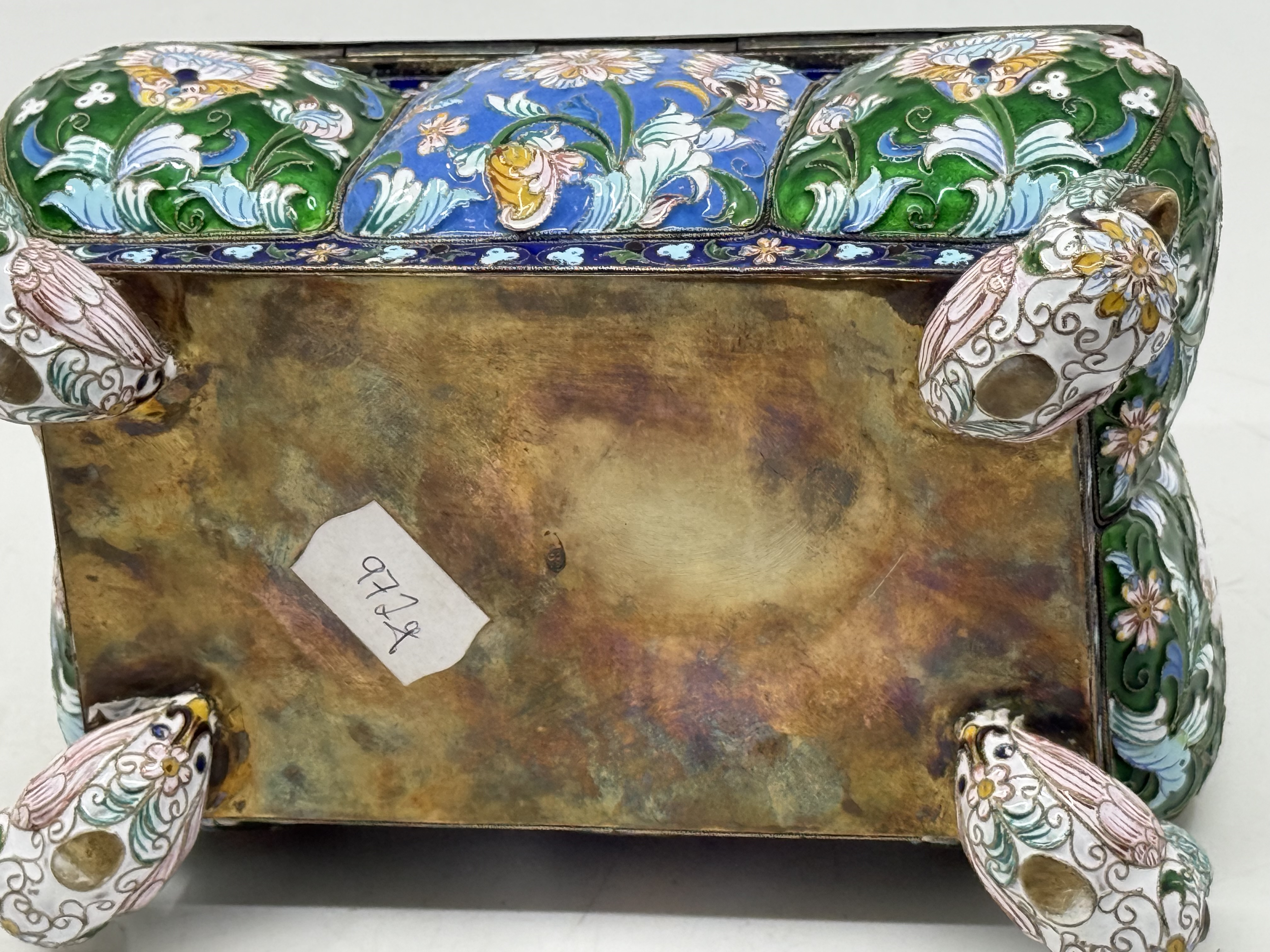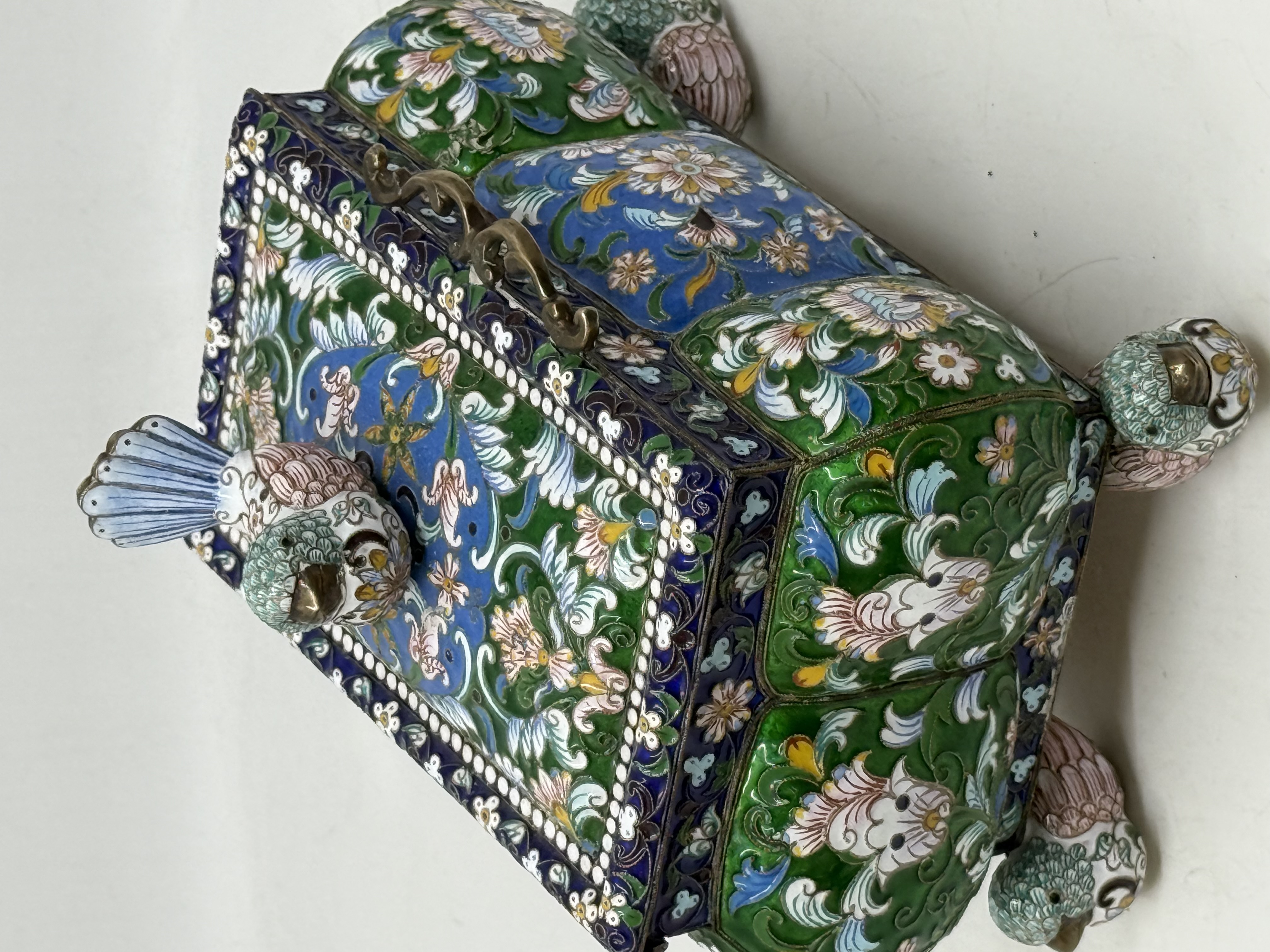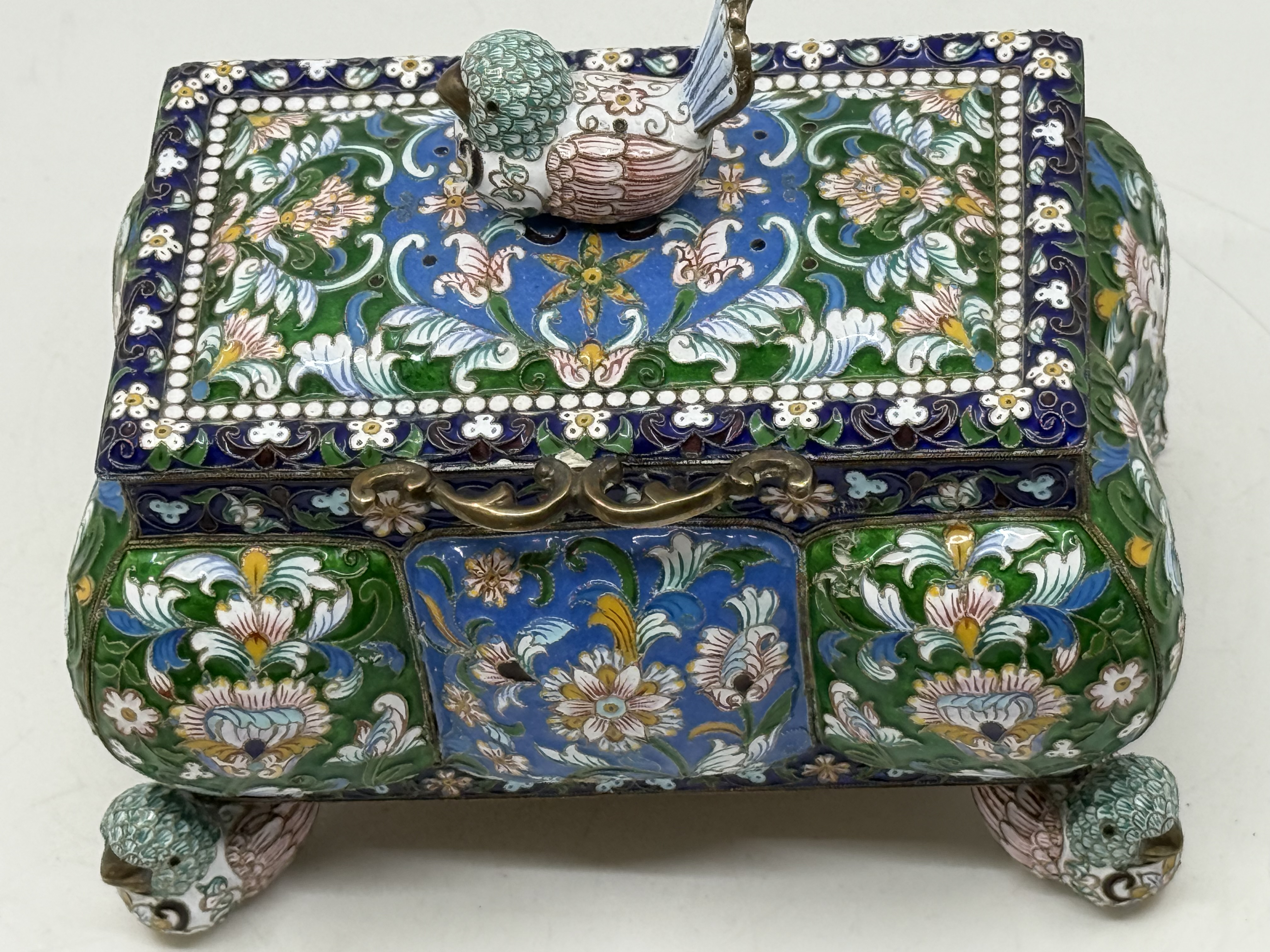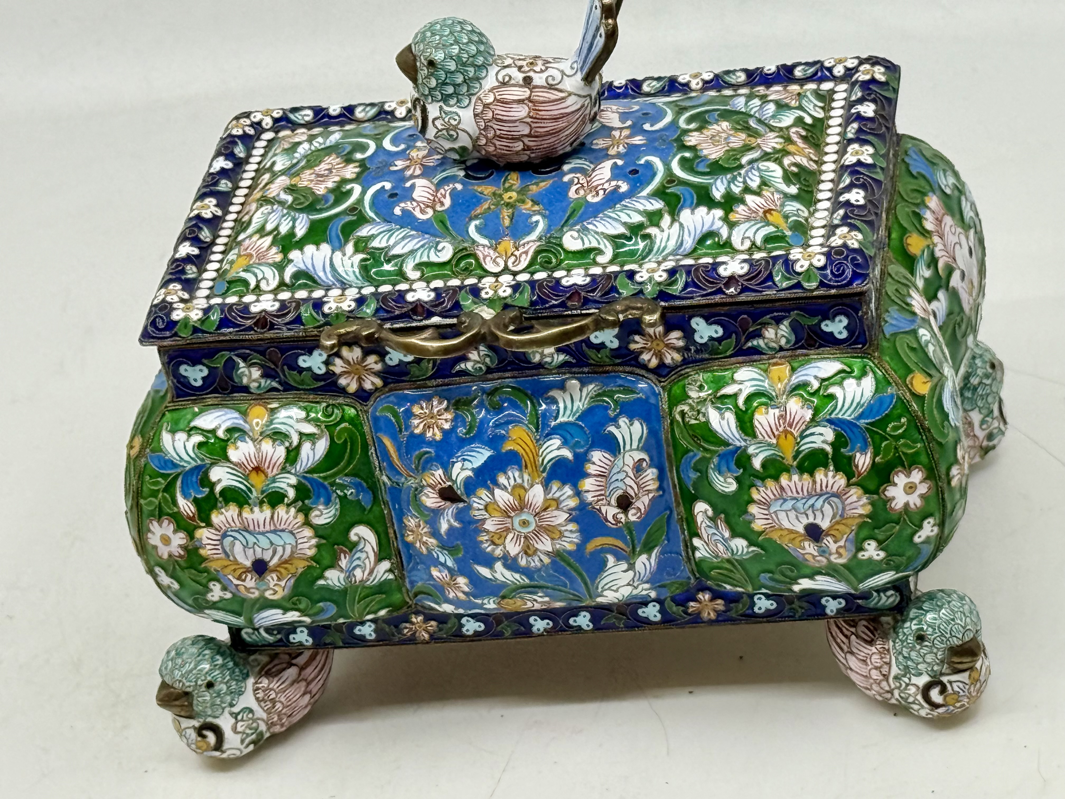 Krásná kazeta – dóza – krabice s víkem v barevném smaltu, s figurkou ptáčka místo úchytu . Punc 84 – 875/1000 Rusko. Na čtyřech zdobných nožkách ve tvaru ptáčků. Váha 972 g. Skvělá investiční nabídka.