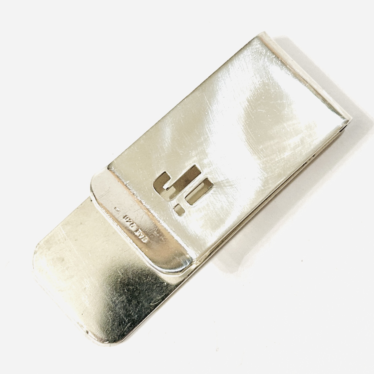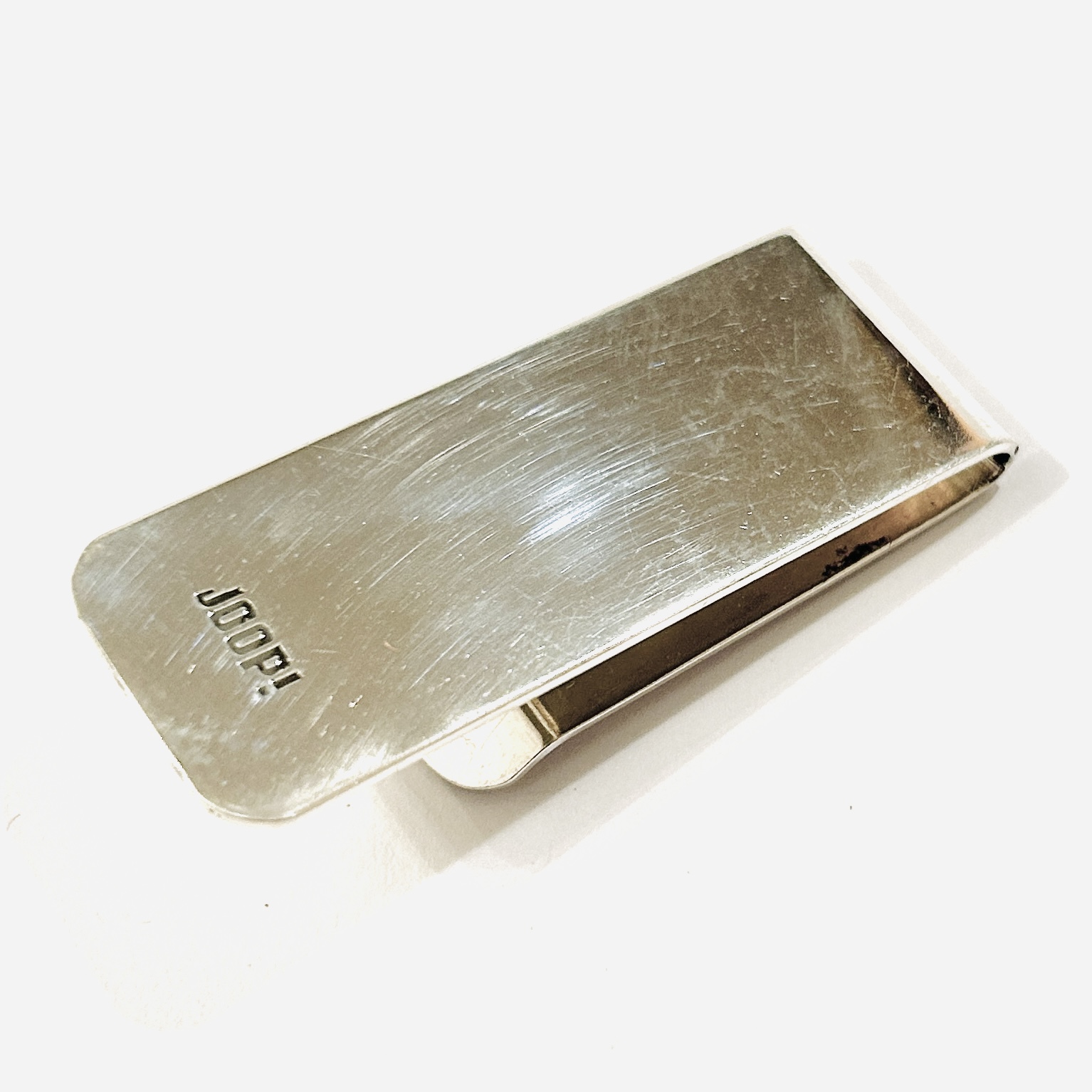 Moderní, masivní spona na bankovky od známé německé módní značky JOOP!, jejíž logo je vyraženo z přední strany a zkratka prořezána zezadu. Minimalistický design, značkový kousek praktického kapesního stříbra, solidní patrně německá stříbrnická práce z počátku 21. století.