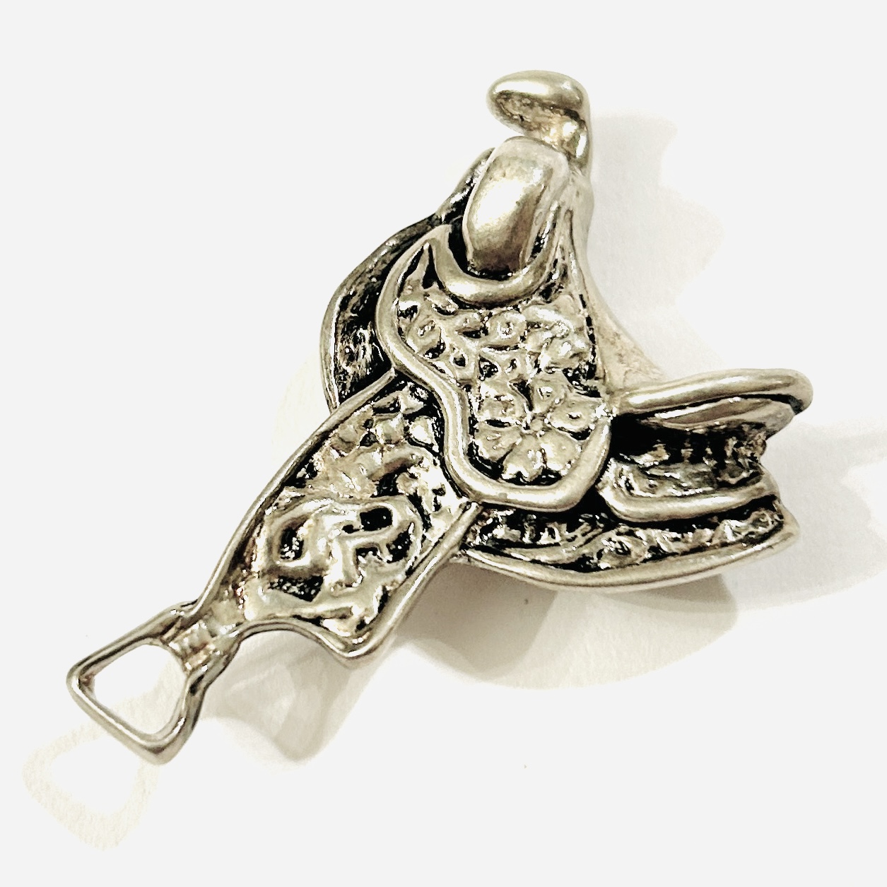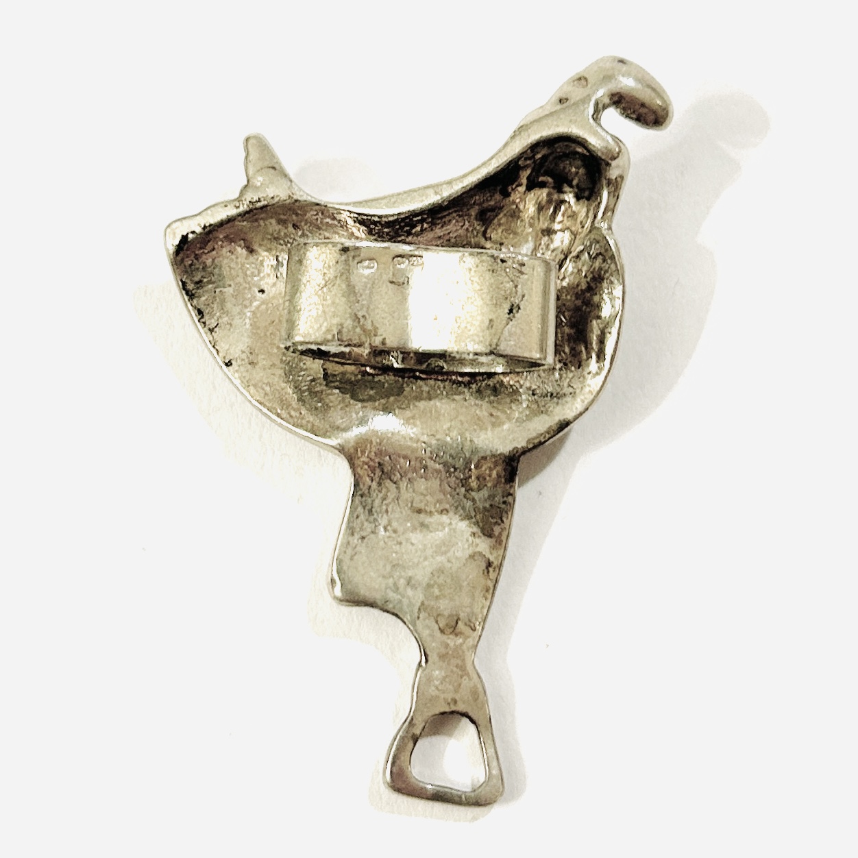 Nevšední spona na šátek v podobě koňského sedla s plastickými detaily. Nápaditý šperk s oblíbenou tematikou, solidní tuzemská zlatnická práce z první pětiny 21. století.