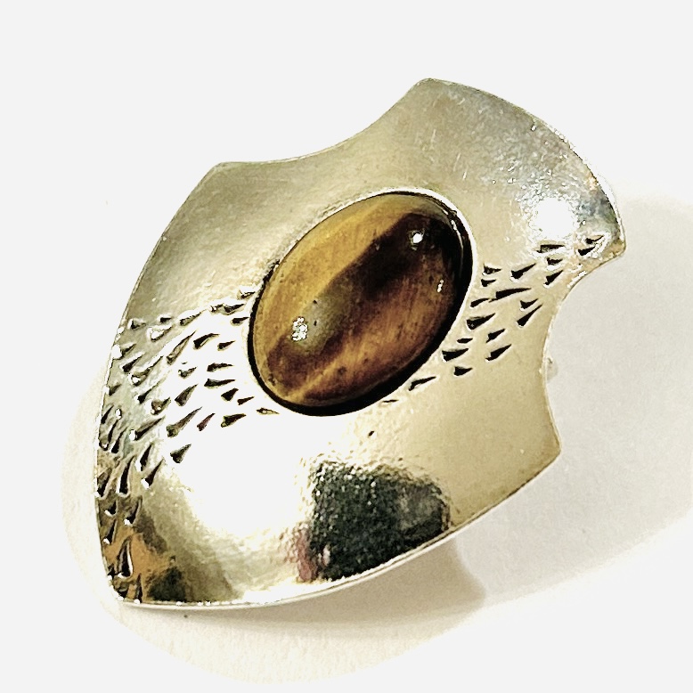 Moderní spona na šátek ve tvaru štítu, ve středu osazeno oválnou muglí přírodního tygřího oka, zdobeno vinutým gravírováním připomínající cestu ze stop. Nápaditá tuzemská zlatnická práce z první pětiny 21. století.