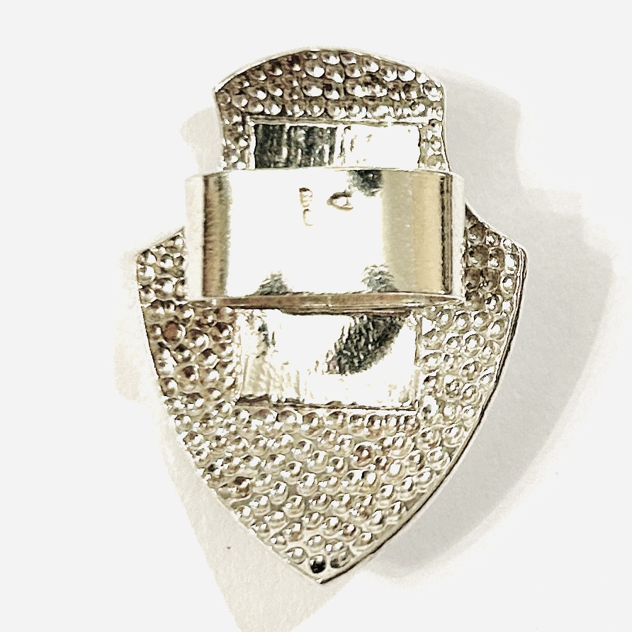 Zhotoveno z nezlaceného stříbra o ryzosti 925/1000; punc S-61 (kozlík 2), ryzostní číslo a mistrovská značka \“BEN\“ na průvleku. Hmotnost 7,65 g, délka 31 mm, šířka 24 mm, délka průvleku 16,5 mm. V novém, tedy nenošeném stavu.