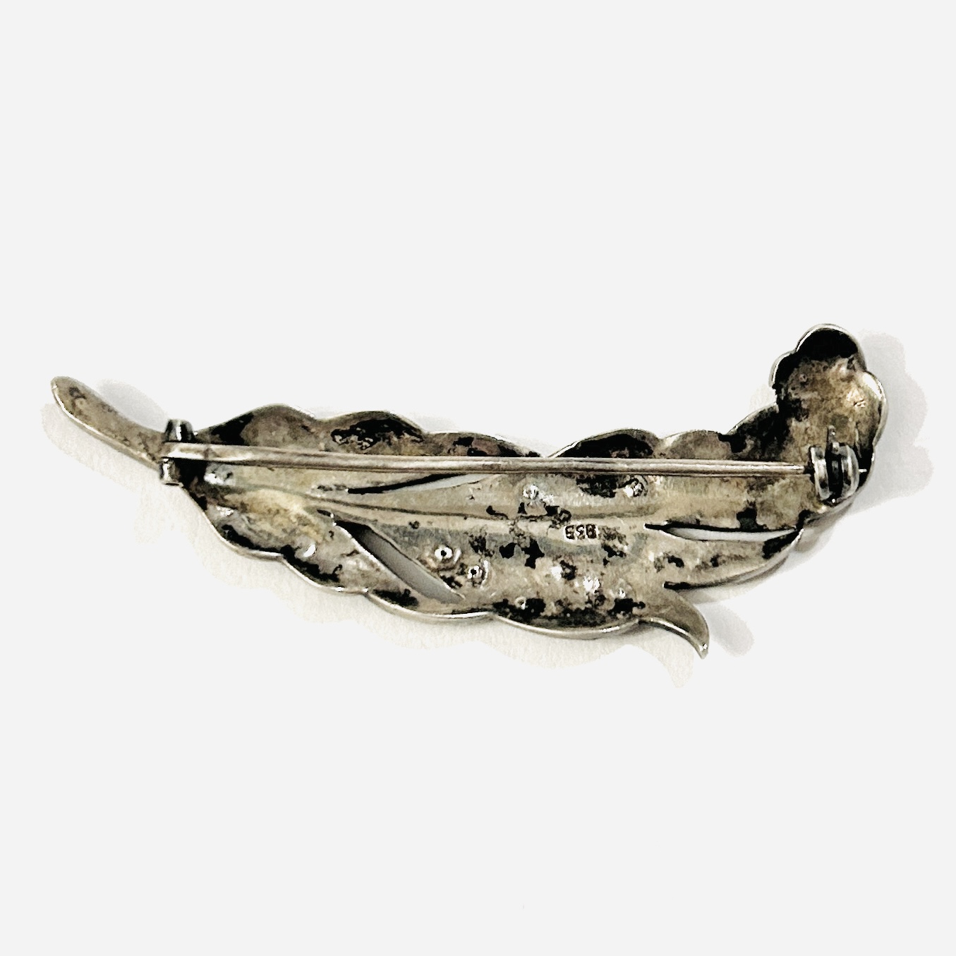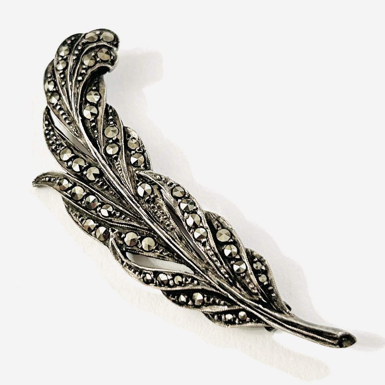 Půvabná, starožitná brož ve tvaru peříčka, pečlivě plasticky tvarované tělo osázeno přírodními markazity kulatého hvězdicového brusu, fasováno a zušlechtěno technikou zrnkování. Nadčasový design, kvalitní, patrně německá zlatnická práce z 50. let 20. století.