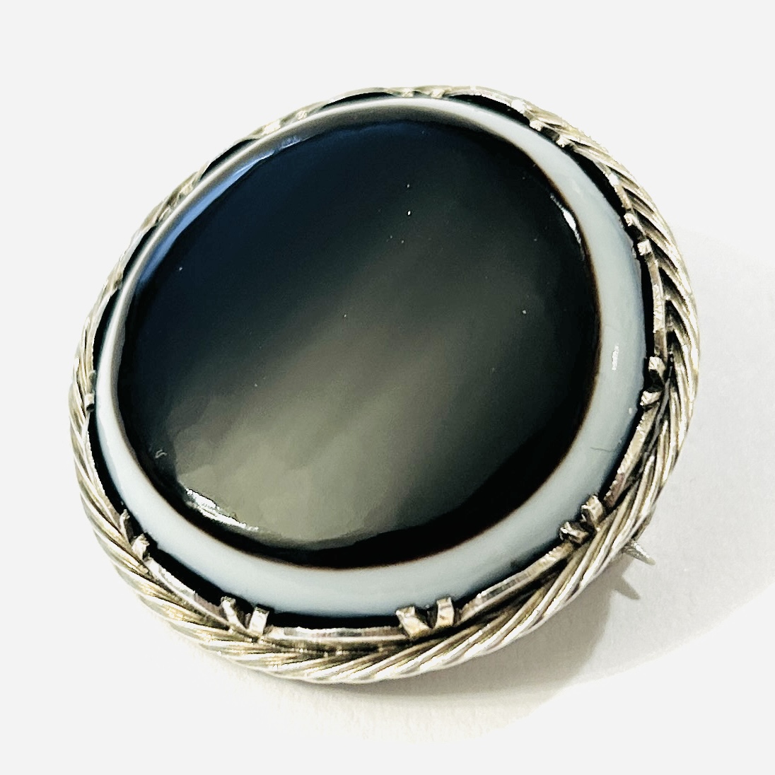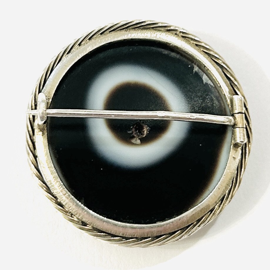 Nevšední brož jíž vévodí kulatá plochá mugle přírodního hnědo-bílého achátu, fasováno zdvojenými krapnami, rámováno pletencem. Solidní západoevropská zlatnická práce z 2. třetiny 20. století.