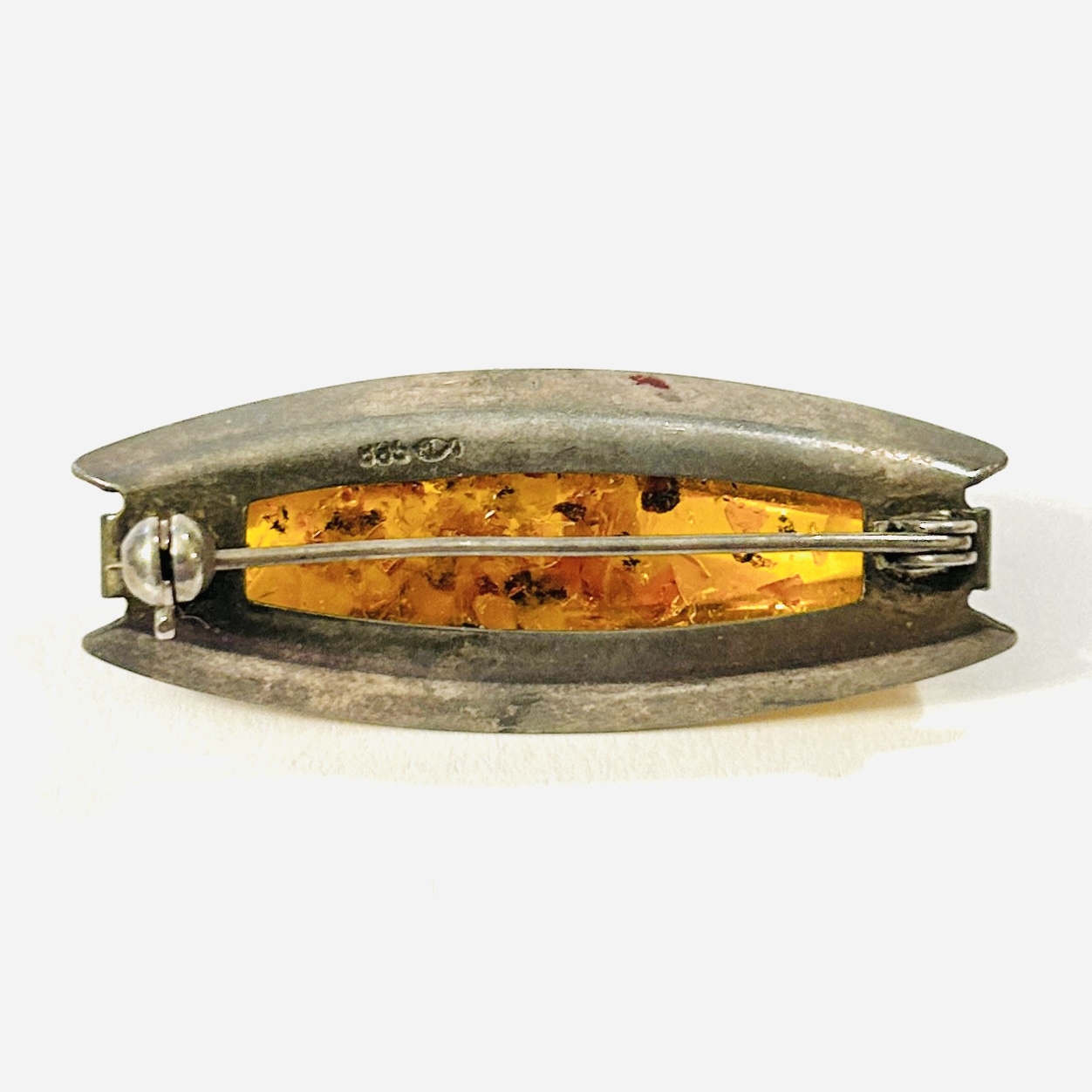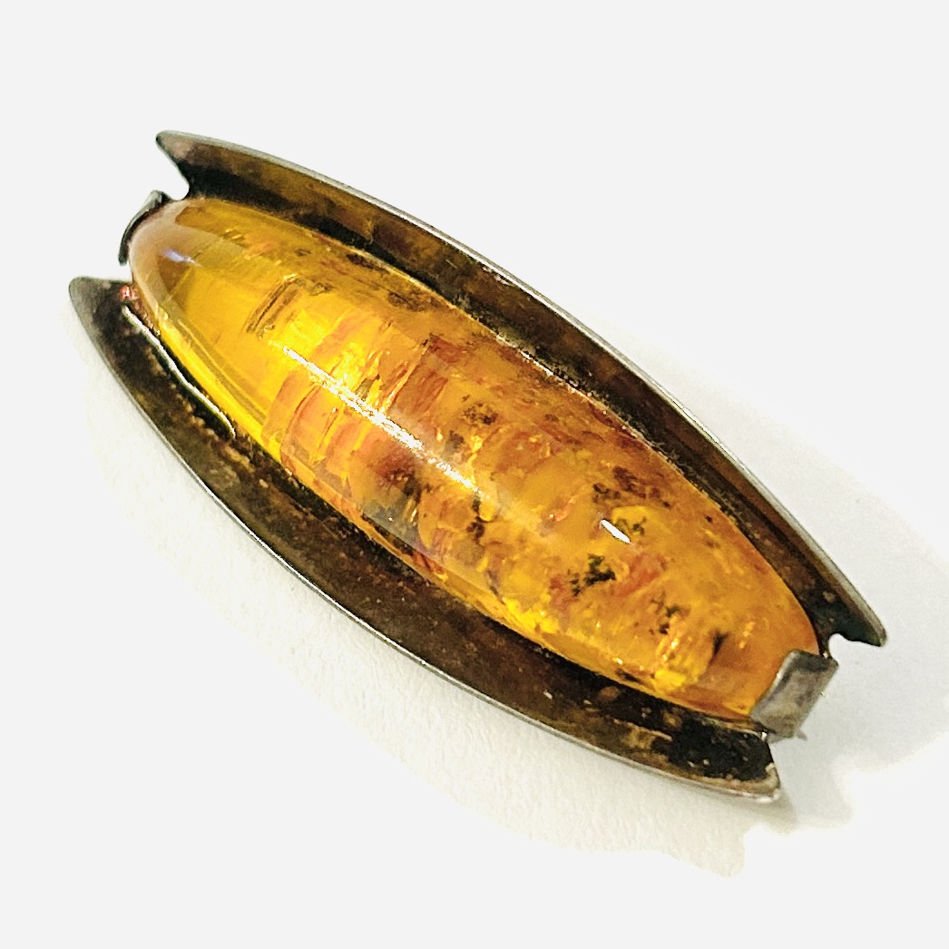 Vkusná, nadčasová brož osazená podlouhlou oválnou muglí přírodního jantaru, usazeno v efektně tvarované hlavici. Modernistický design, oblíbený vzor významného výrobce Fischland (založeno Georgem Kramerem) z 60. let 20. století.