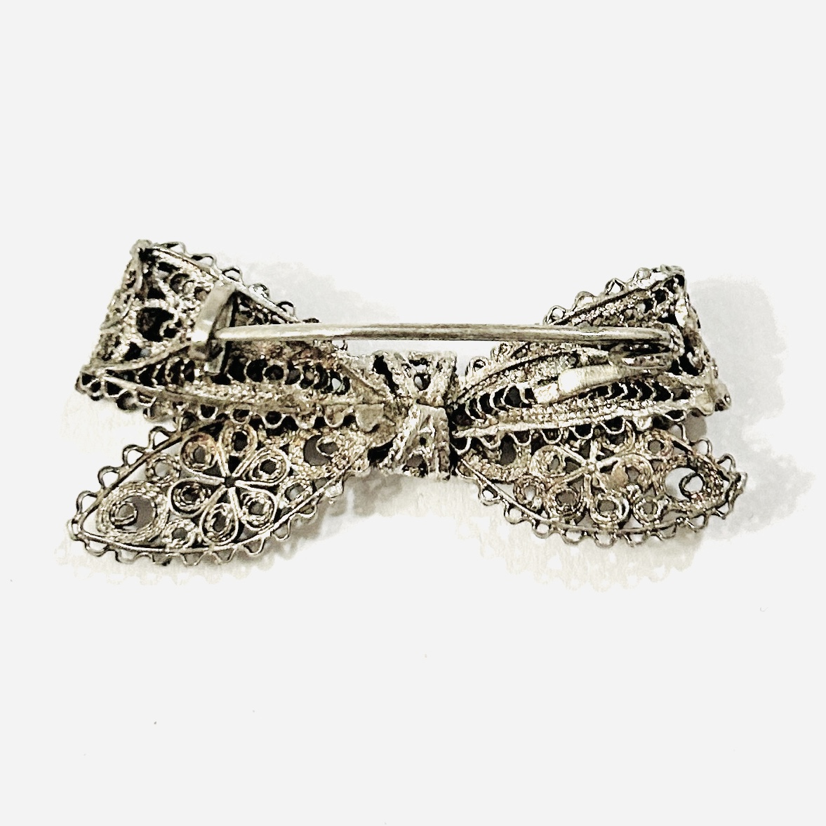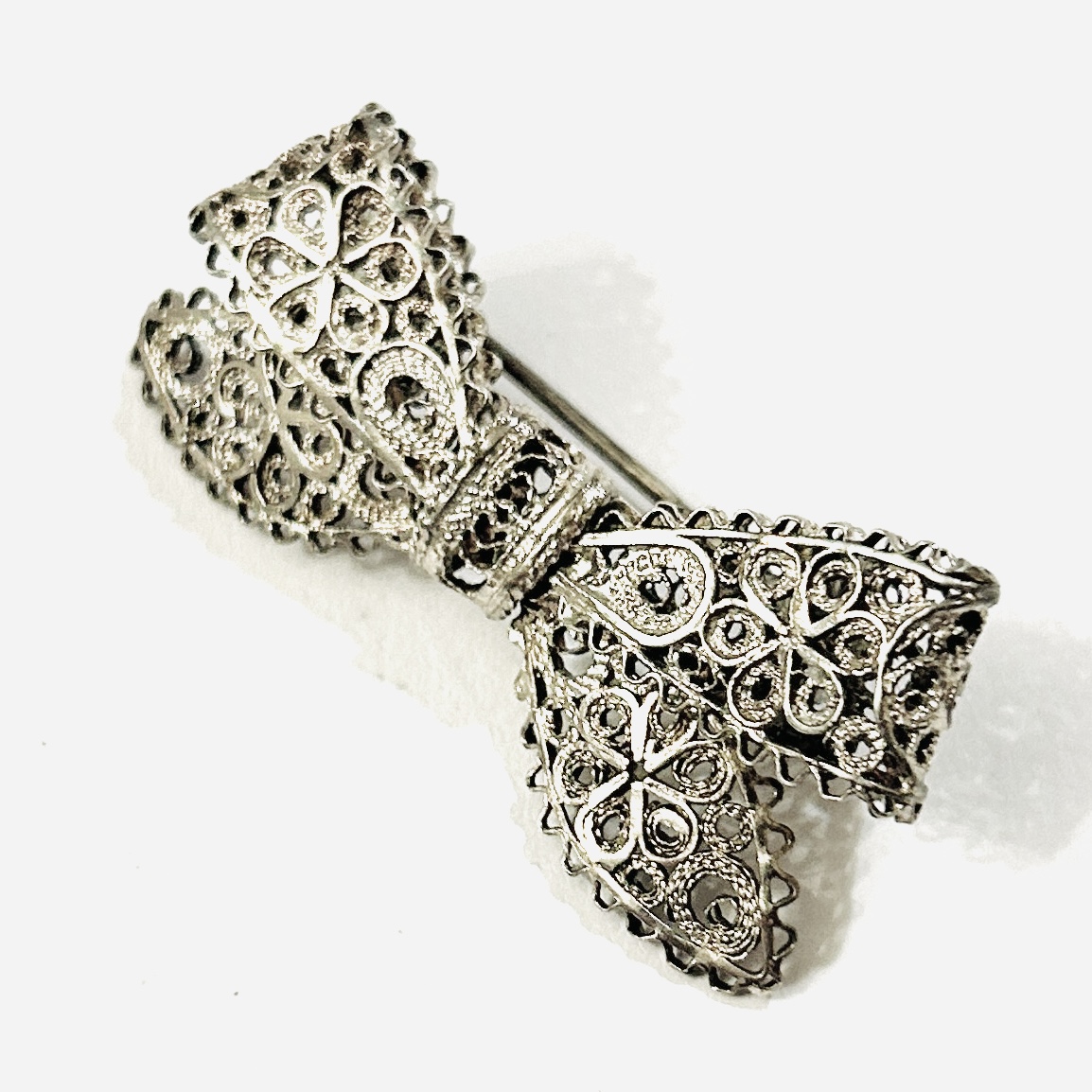 Půvabná starožitná brož ve tvaru mašle, jejíž tělo je vyplněno filigránovými volutami s vlnitým okrajem. Ruční filigránská, patrně balkánská práce z 2. třetiny 20. století.