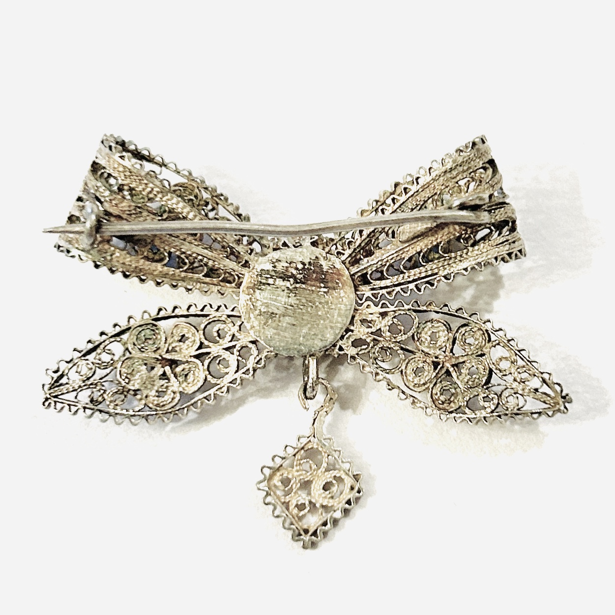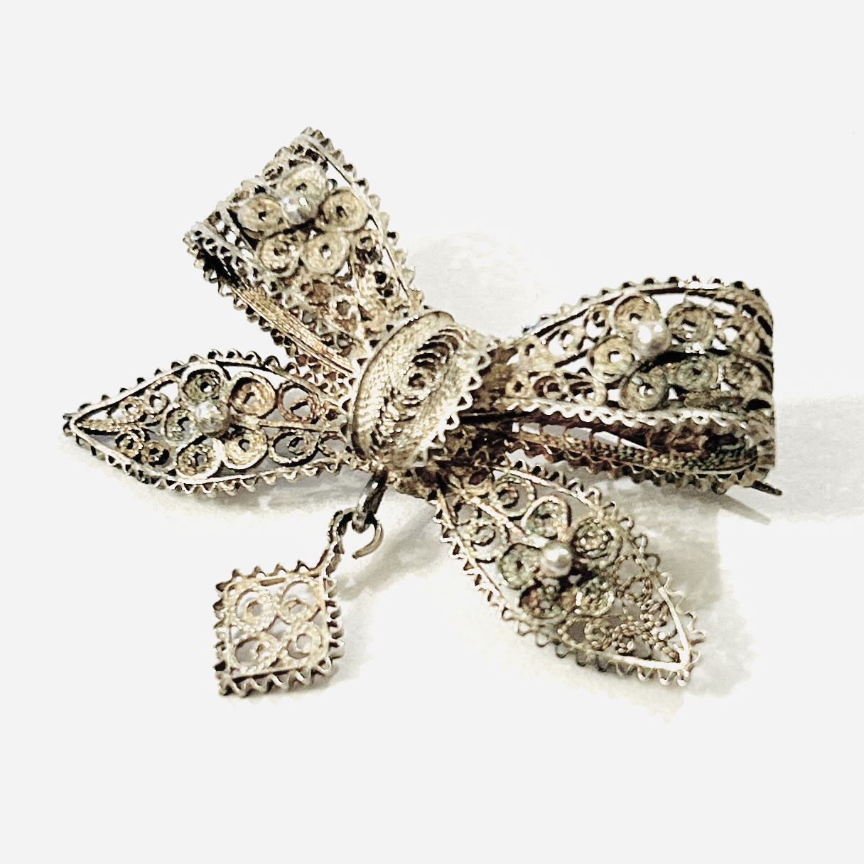 Půvabná starožitná brož ve tvaru mašle, ta je vyplněna filigránovými volutami a květy zdobených granulovanými kuličkami, připojen kosočtvercový ověsek. Mistrovská filigránská práce, patrně některé z moravských (často židovských) dílen, z konce 19. století.
