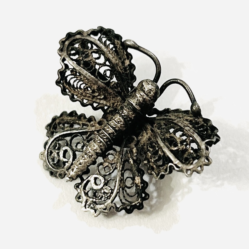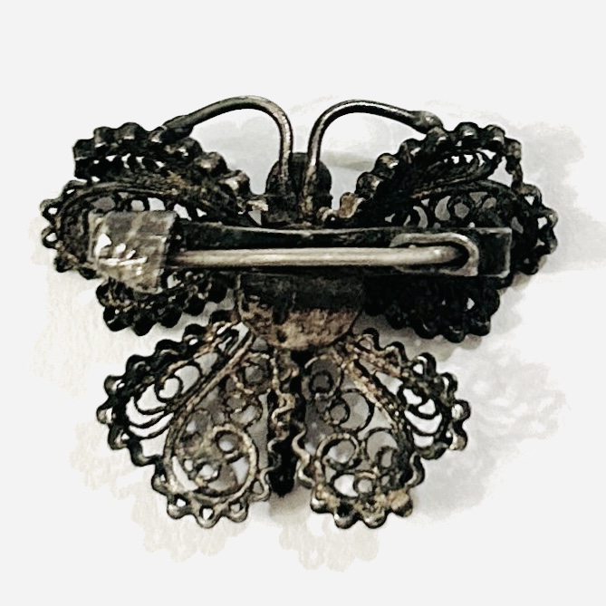 Půvabná menší brož ve tvaru motýla, vyplněno jemnými filigránovými volutami. Elegantní a hravý šperk, precizní, patrně balkánská filigránská práce z 2. třetiny 20. století.