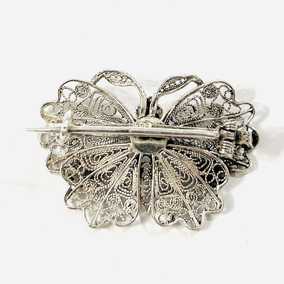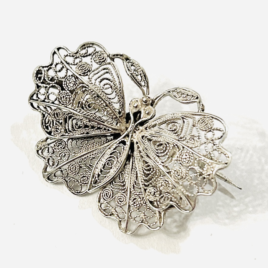 Dekorativní brož ve tvaru motýla, vyplněno jemnými filigránovými volutami a doplněno granulovanými kuličkami. Elegantní a hravý šperk, precizní, patrně německá (Schwäbisch Gmünd) práce ze 2. třetiny 20. století.
