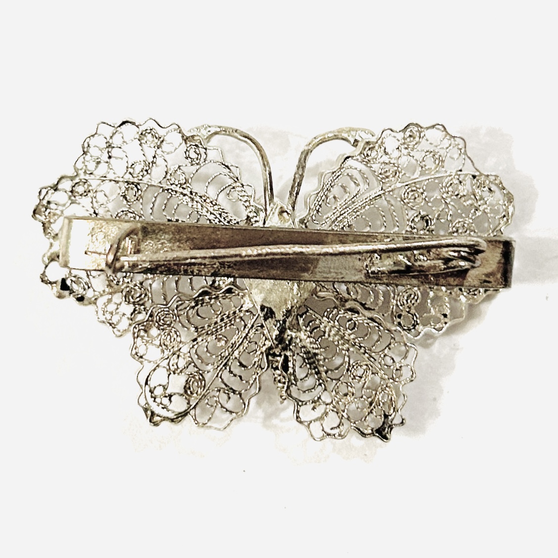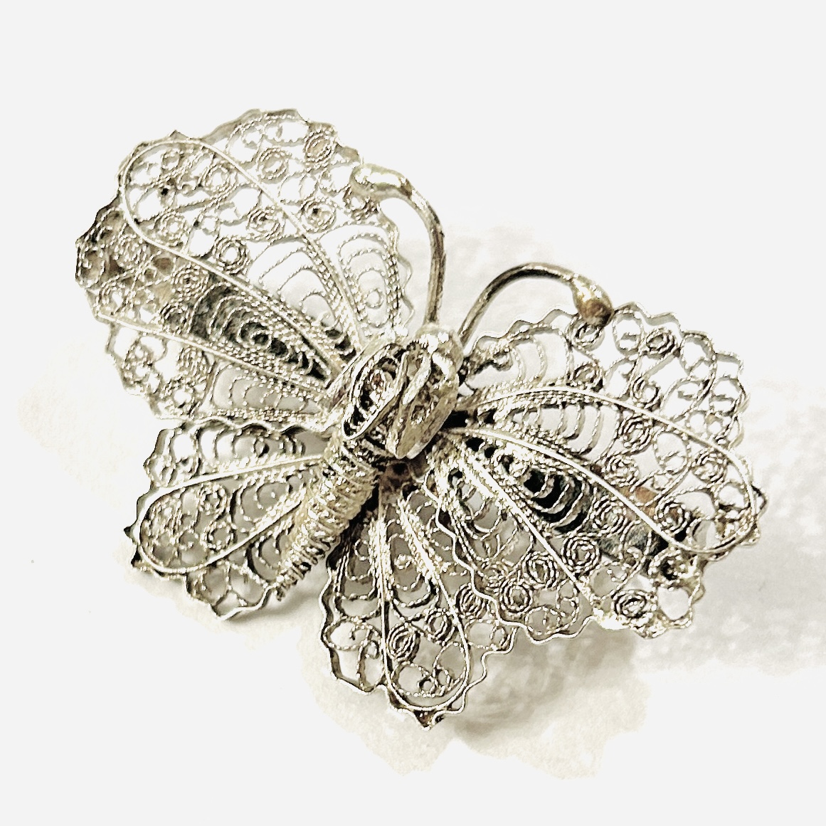 Dekorativní, větší brož ve tvaru motýla, vyplněno jemnými filigránovými volutami, tělo spirálovitě obtočeno. Elegantní a hravý šperk, solidní balkánská filigránská práce z 2. třetiny 20. století.