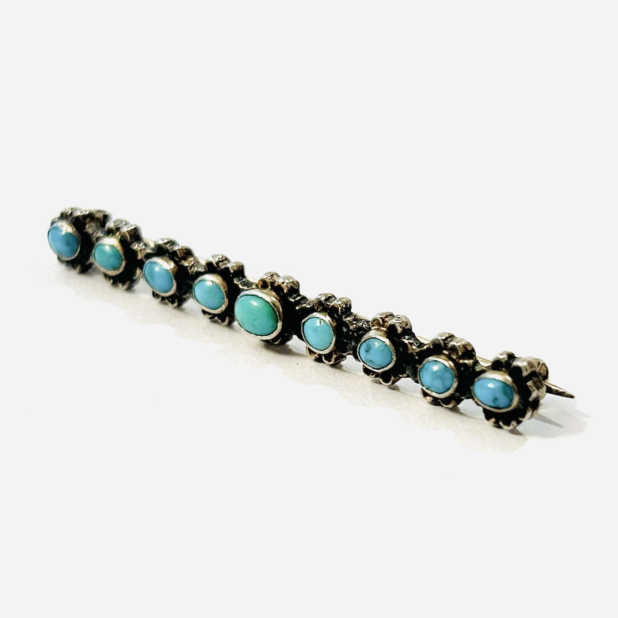 Elegantní, podlouhlá brož osazena v řadě 9 oválnými muglemi přírodního tyrkysu, prostřední lehce větší, fasováno v hladkých obrubách s květinovými rámečky, zadní strana zdobena ornamentálním rytím. Typická sedmihradská zlatnická práce z poslední třetiny 19. století.