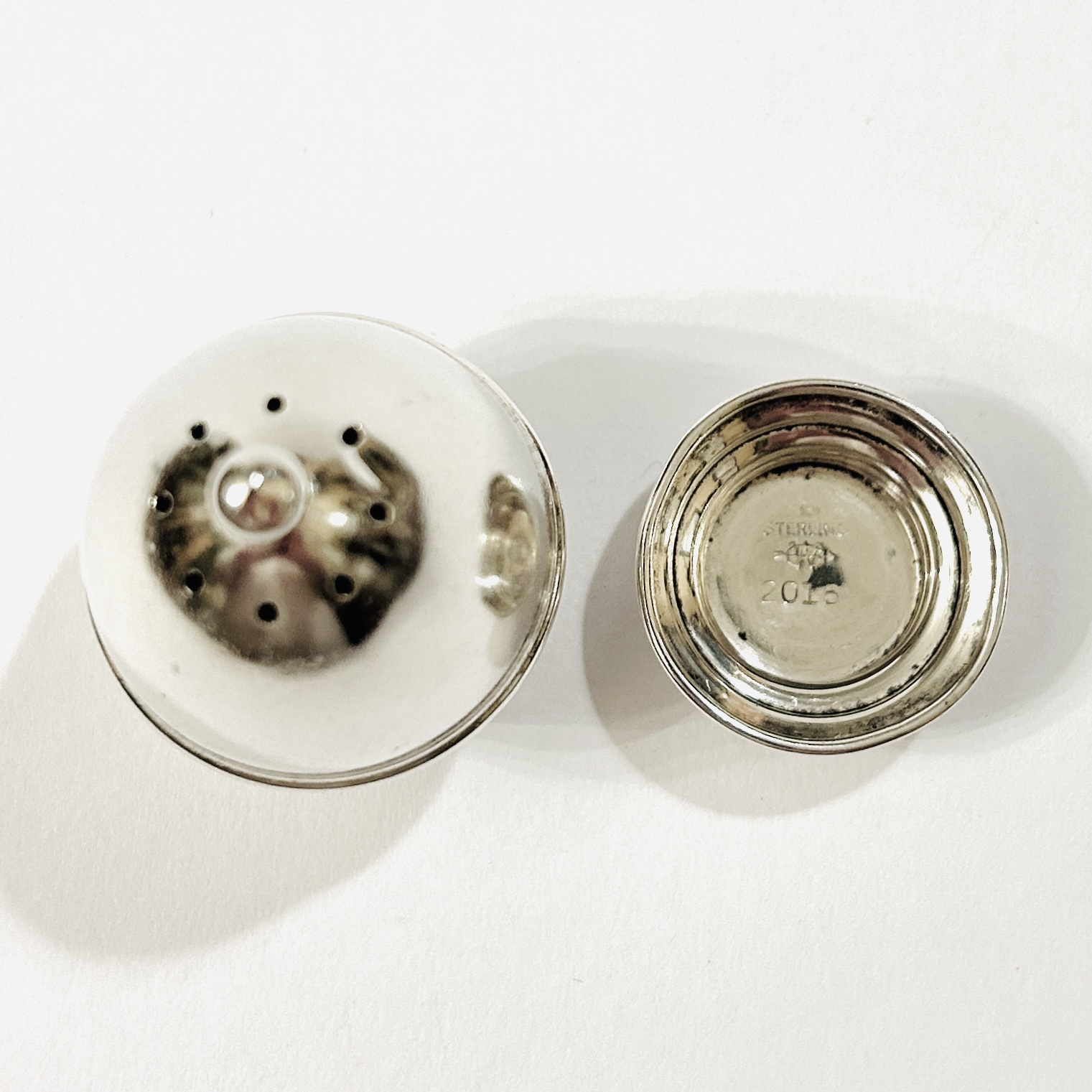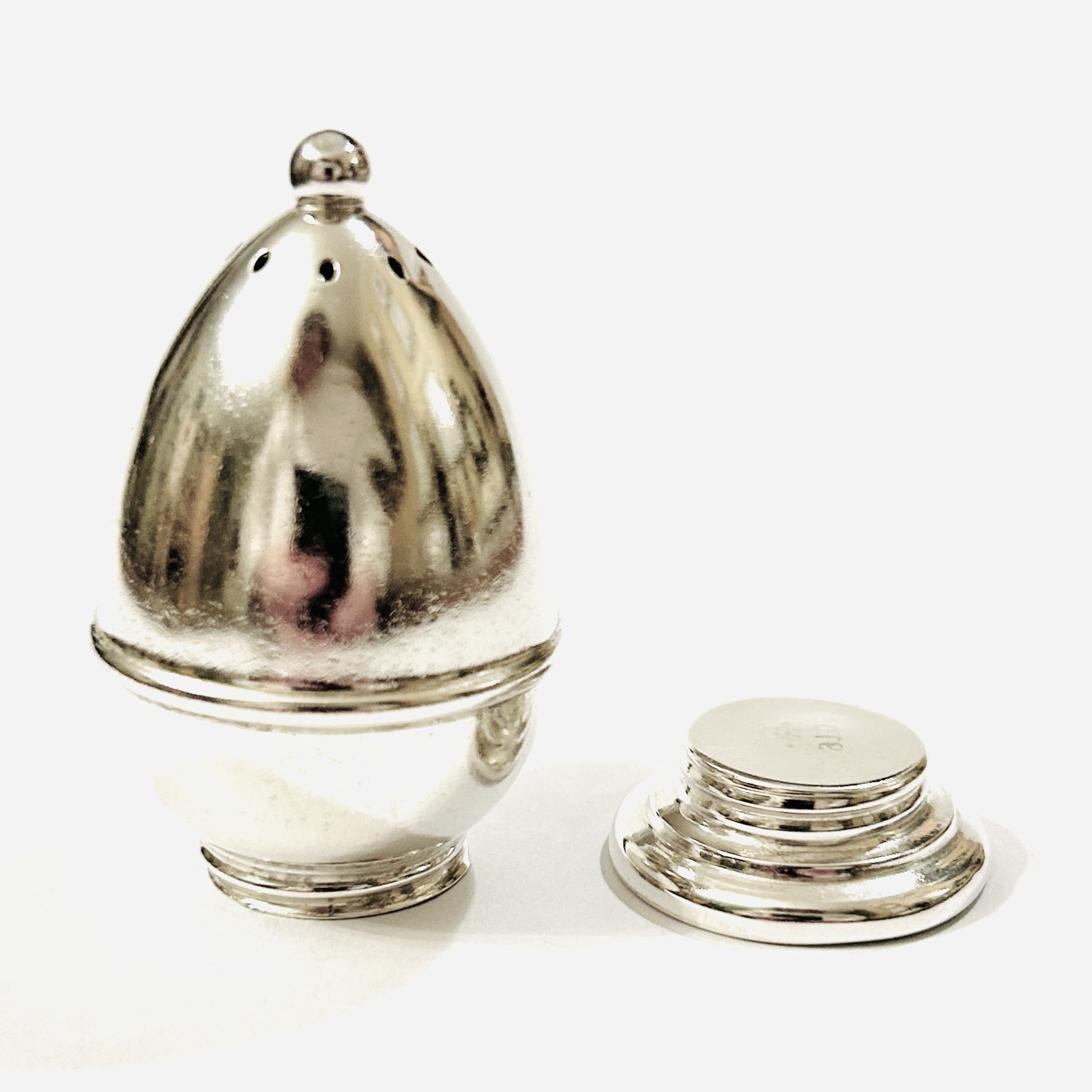 Elegantní slánka/pepřenka vejčitého tvaru, ustupující šroubovací noha, špička s otvory zakončena kuličkou. Minimalistický, nadčasový design z dílen severoamerické stříbrnického výrobce Webster Co. ze 30. až 50. let 20. století.