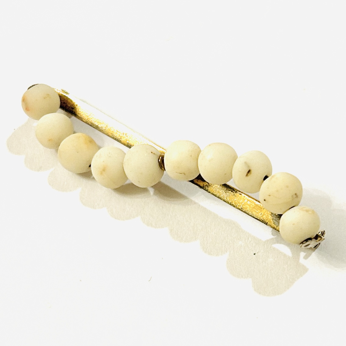 Elegantní, nadčasová brož z období art-deco, ryze geometrická kompozice z linie kovu s protínající zvlněnou křivkou z navlečených přírodních mořských bílých korálů. Kvalitní středoevropská zlatnická práce z 30. let 20. století.