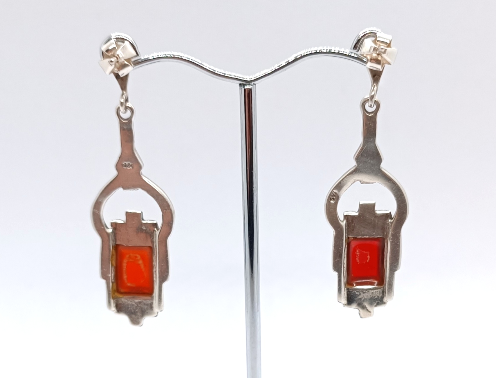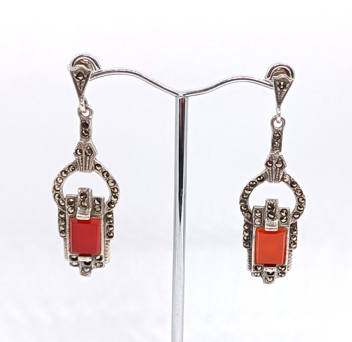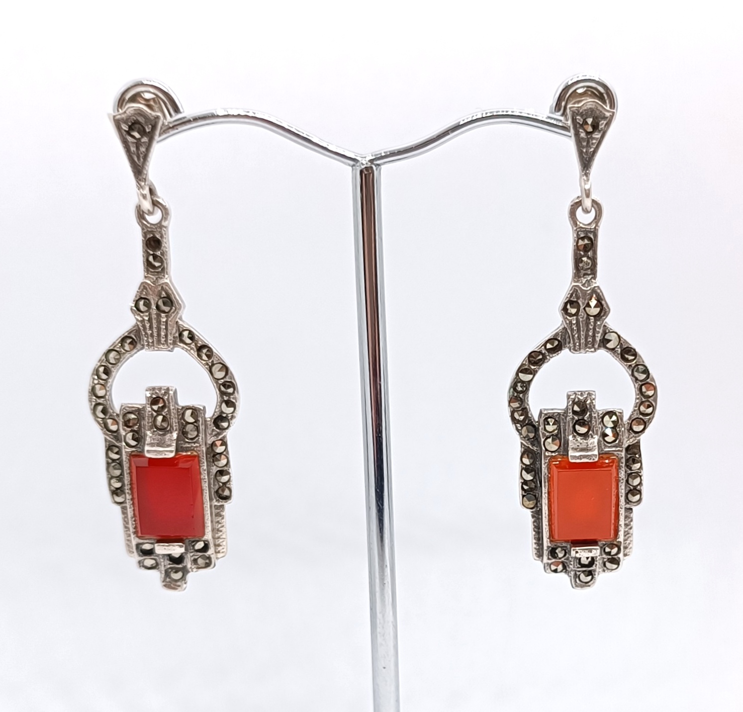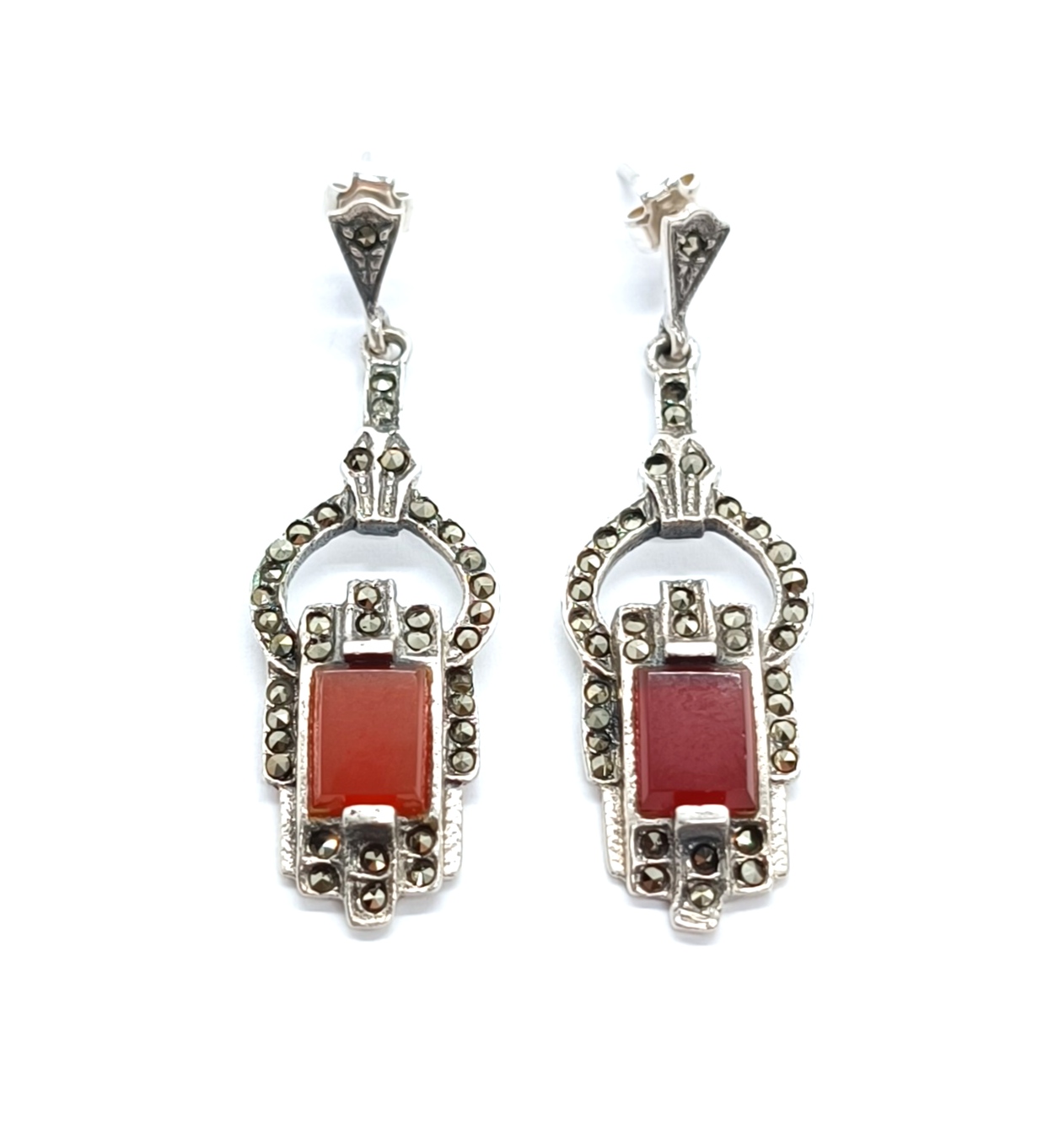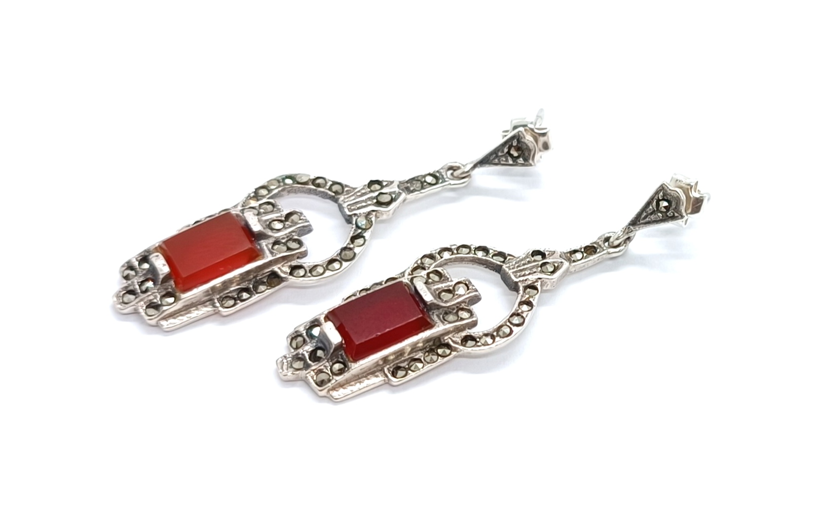 Art deco stříbrné náušnice s karneoly a markazity, Ag btto 7,30g/925/1000, Západní Evropa, 30. léta 20. století, atest puncovního úřadu; délka 4,7 cm, šířka 1,5 cm