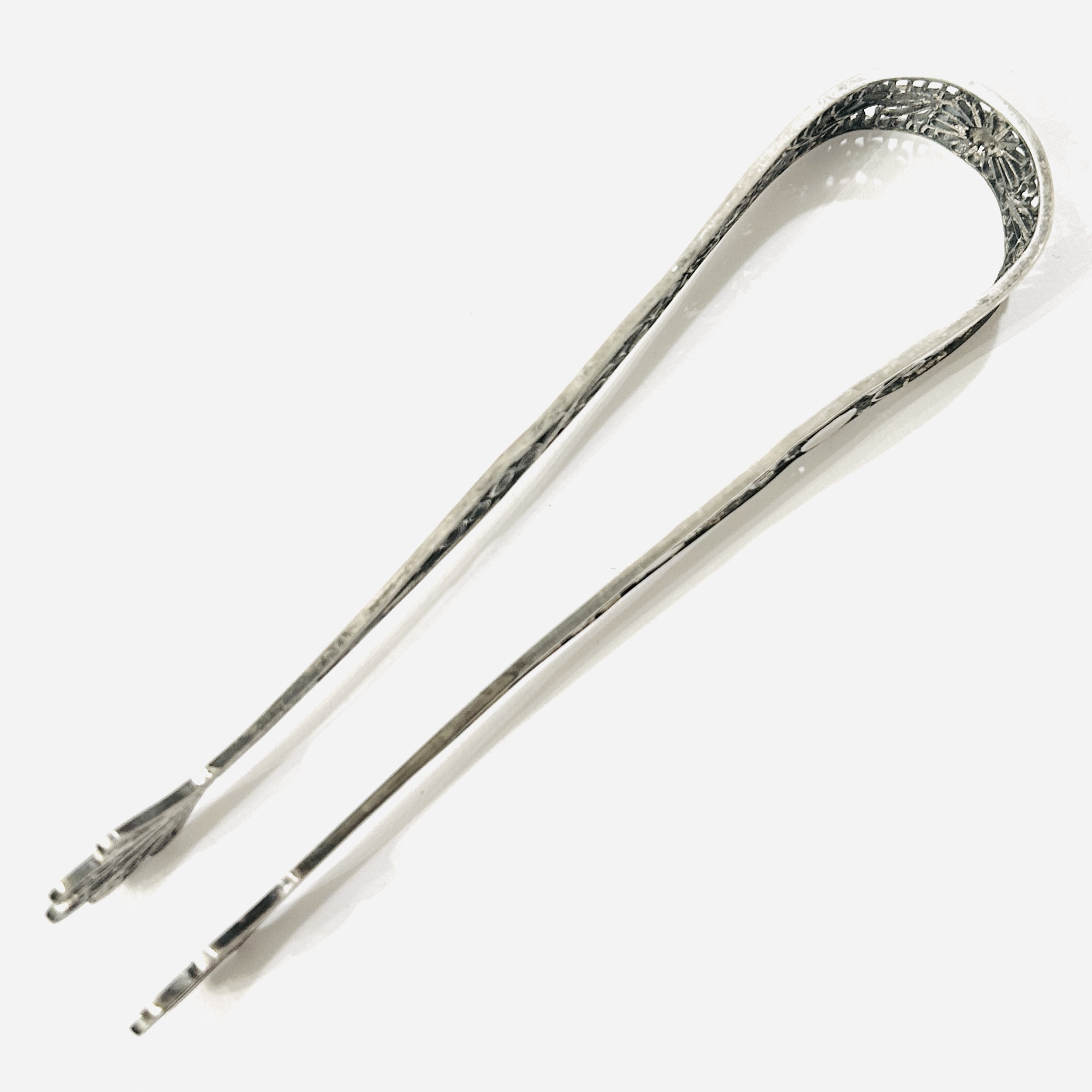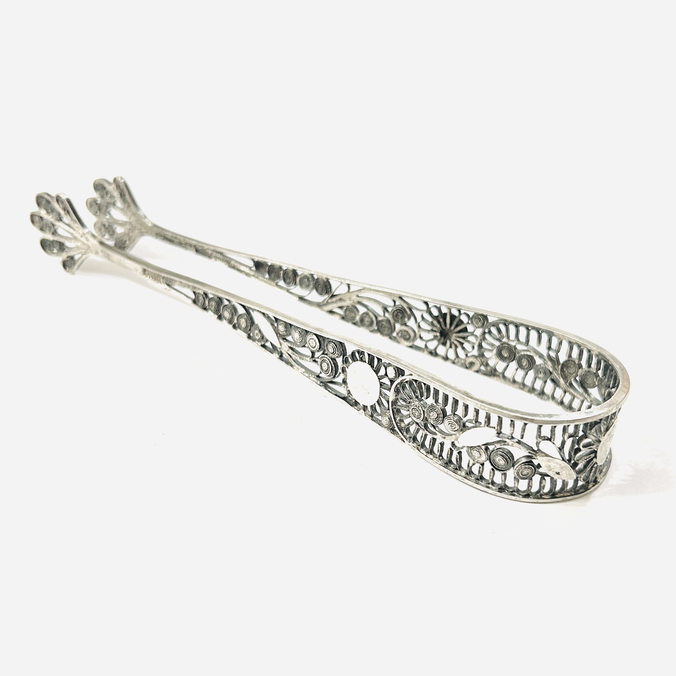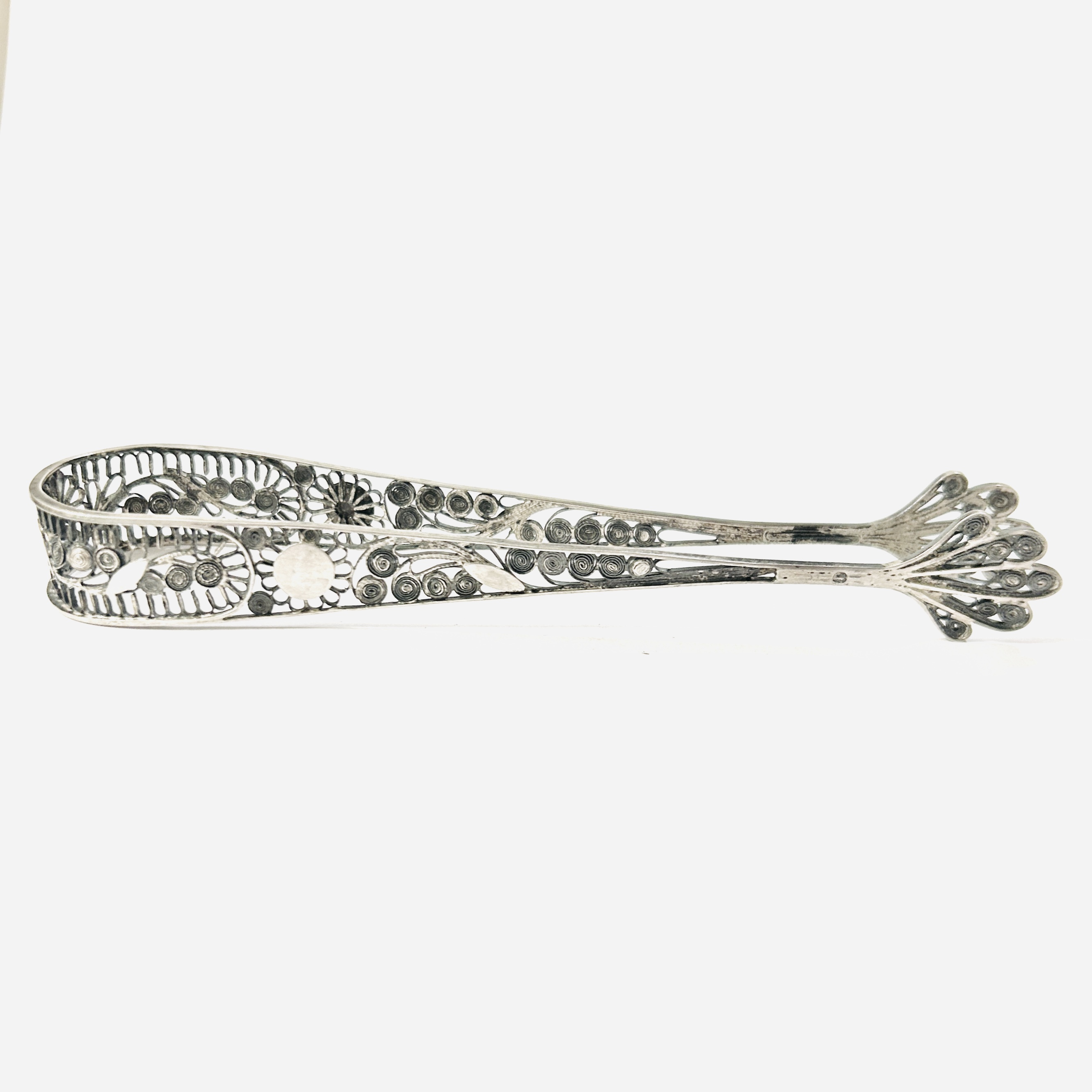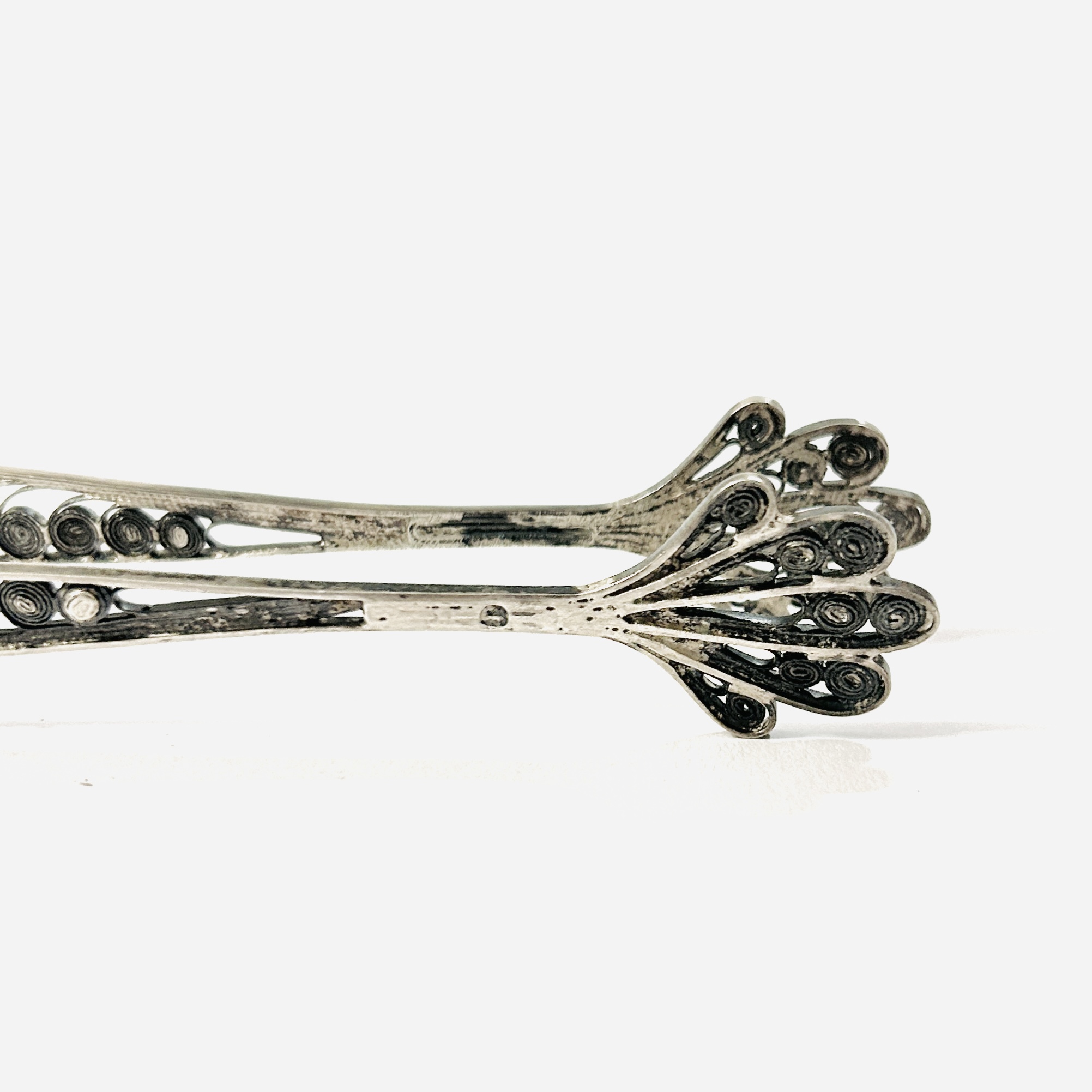 Dekorativní, velké kleštičky z období empíru, bohatě členěné tělo vyplněno filigránovámi volutami a kontrastními řezanými plíšky, ploché misky vzdáleně připomínající lasturu či paví peří. Precizní tuzemská stříbrnická práce z let mezi 1810-1824.