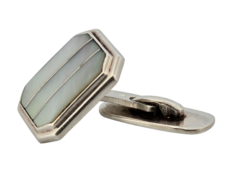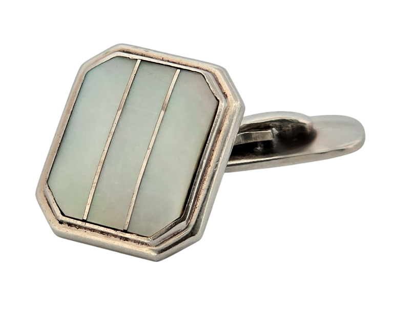 Popis: Stříbrné Art Deco manžetové knoflíčky s přírodní perletí, zdobeny vodorovnými stříbrnými pruhy.