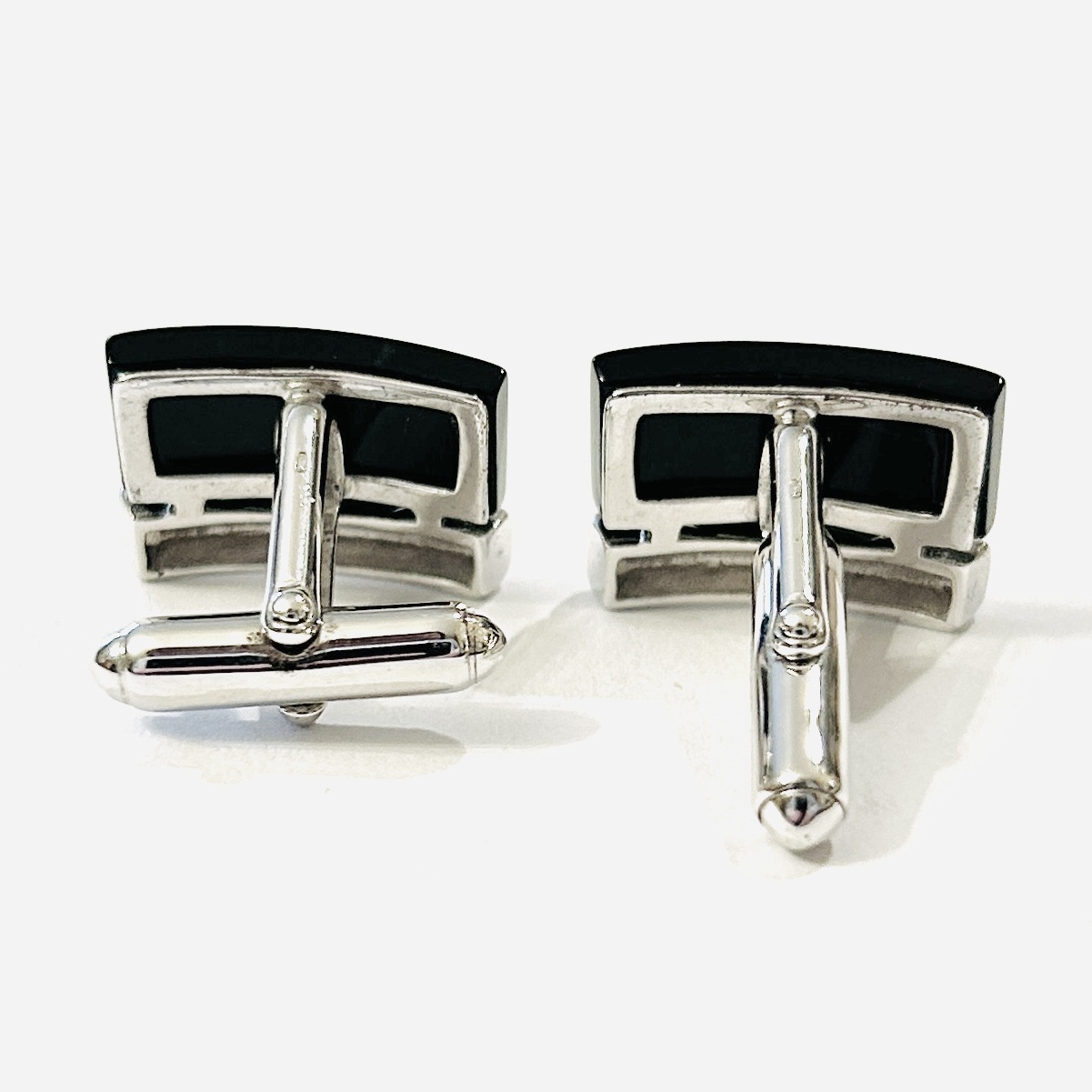 Moderní manžetové knoflíčky osazeny přírodními černými onyxy zakřiveného plochého obdélného brusu, linie kovu s jemně pískovaným povrchem. Evropská práce z 10. let 21. století.