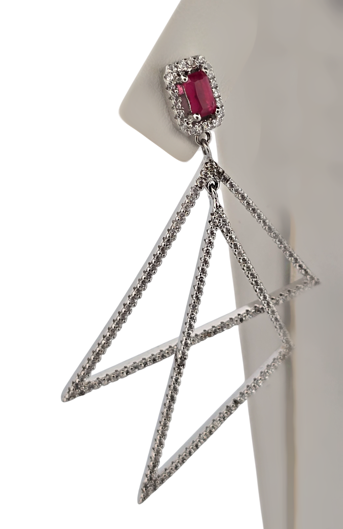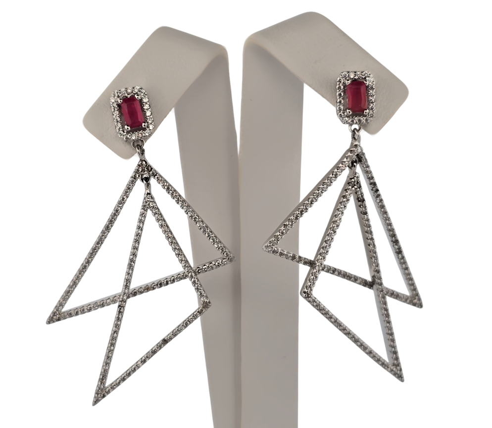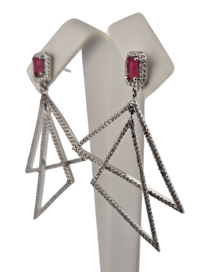 Popis: Stříbrné extravagantní náušnice ve tvaru dvou trojúhelníků. Čirý a starorůžový zirkon. Zapínání na puzetku.