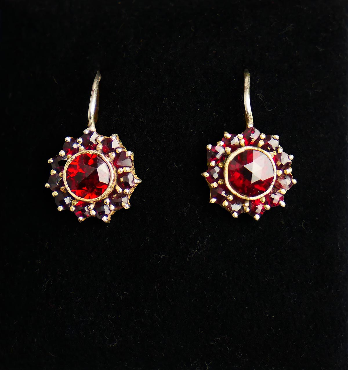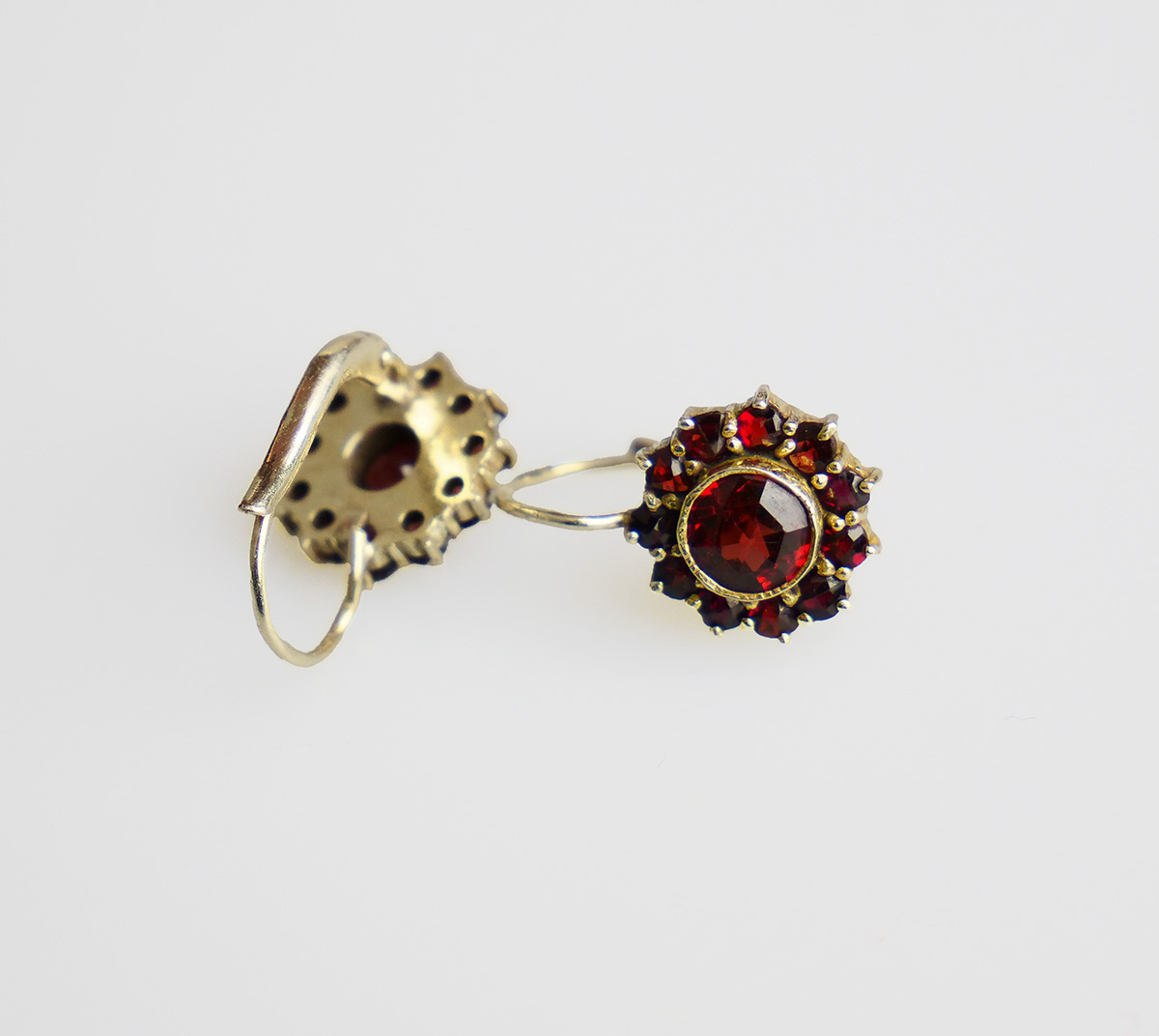 stříbrné zlacené náušnice s českými granáty a almandiny z období 1. republiky, Ag btto 2,72 g/800/1000, Československo, kolem r. 1930, punc, rozměry 1,8 x 1,2 x 1,2 cm