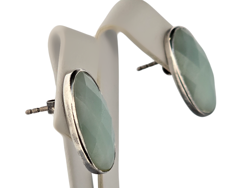 Popis: Stříbrné unikátí náušnice s fazetovaným (broušeným) modrým přírodním akvamarínem oválného tvaru. Zapínání na puzetku.