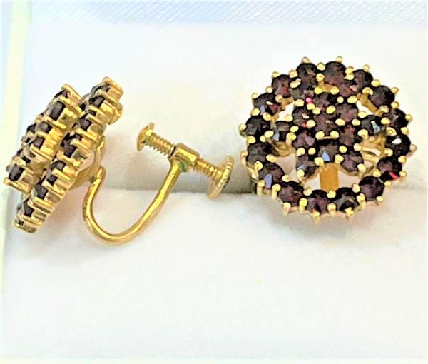 Pár krásných a originálních stříbrných náušnic s granáty, nýtková technika, speciální způsob zapínání, které je zhotovené na šroubky se závitem (není nutné mít otvory v uších). Ag 900/1000 5,6 gr. Průměr 18 mm. Perfektní stav