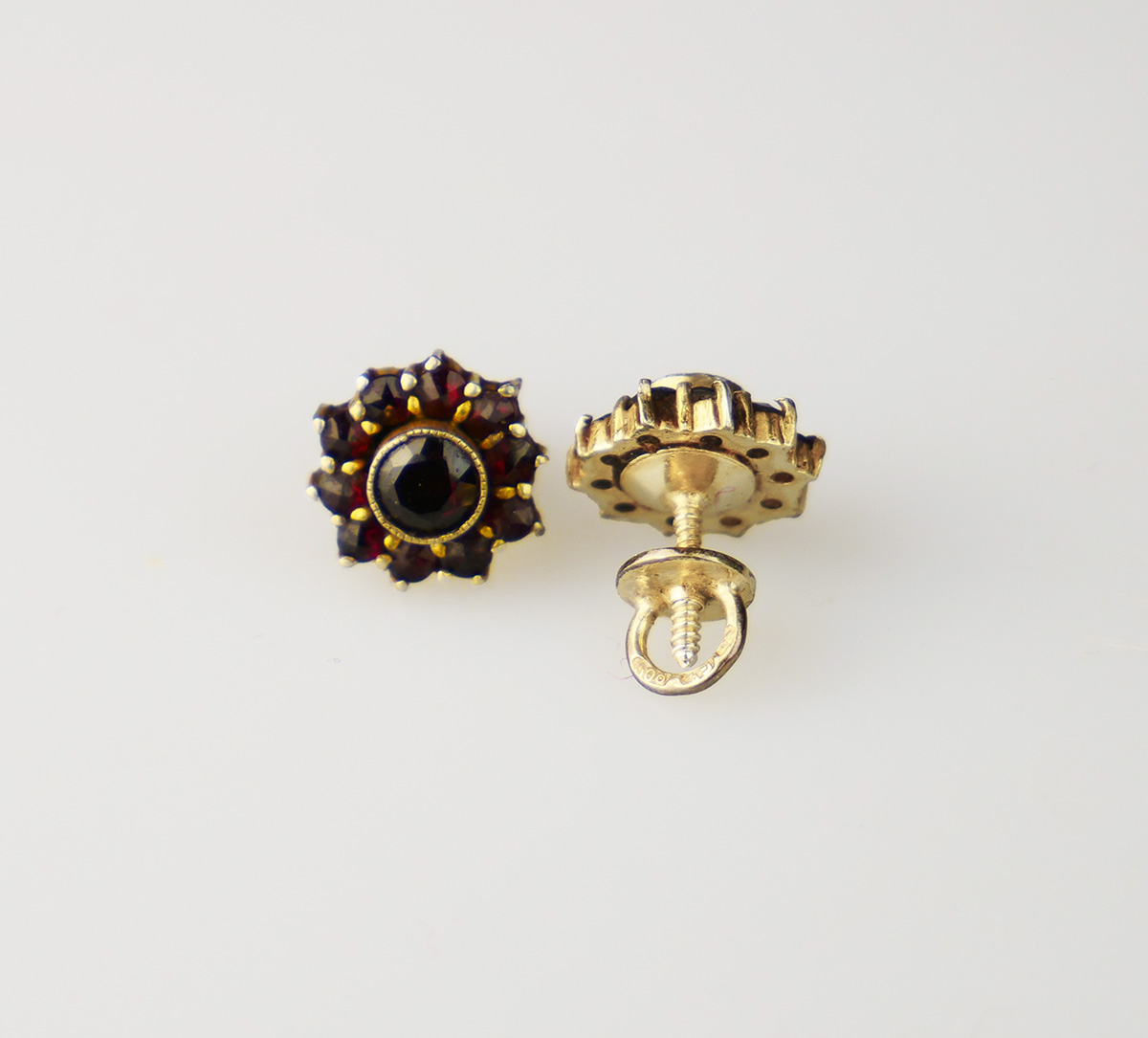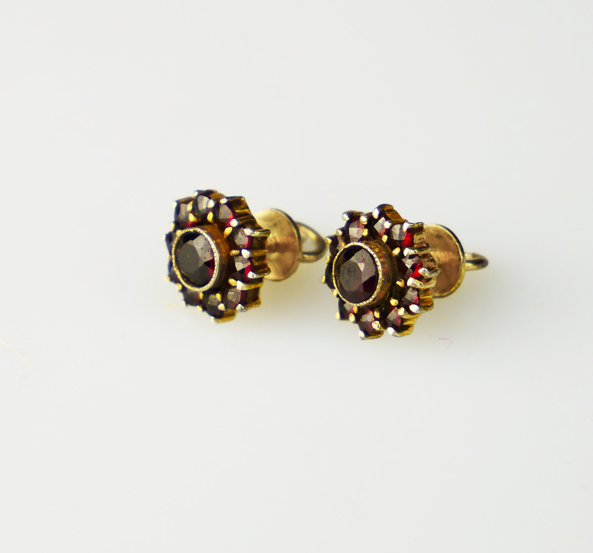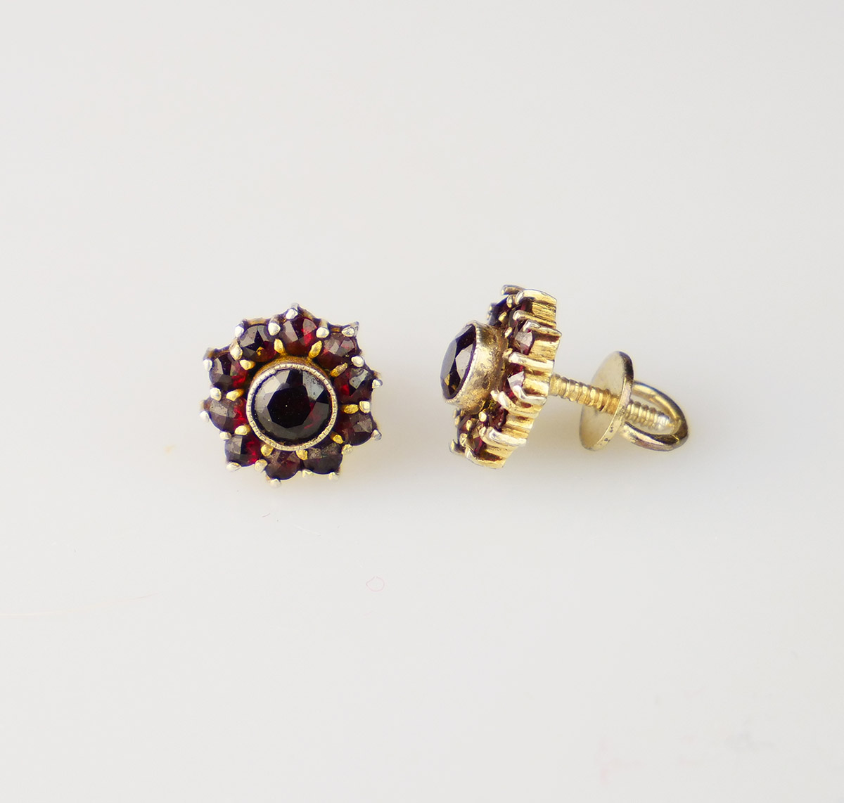 stříbrné zlacené náušnice s granáty, puzeta se závitem, z dílny Granát Turnov, Ag btto 2,37 g/900/1000, Čechy, kolem r. 1960, puncováno (kamzík), průměr 1 cm