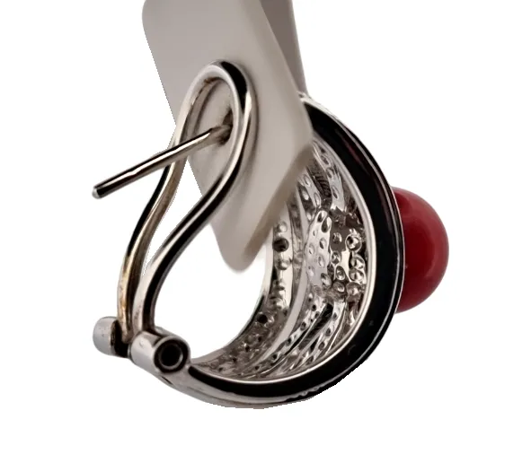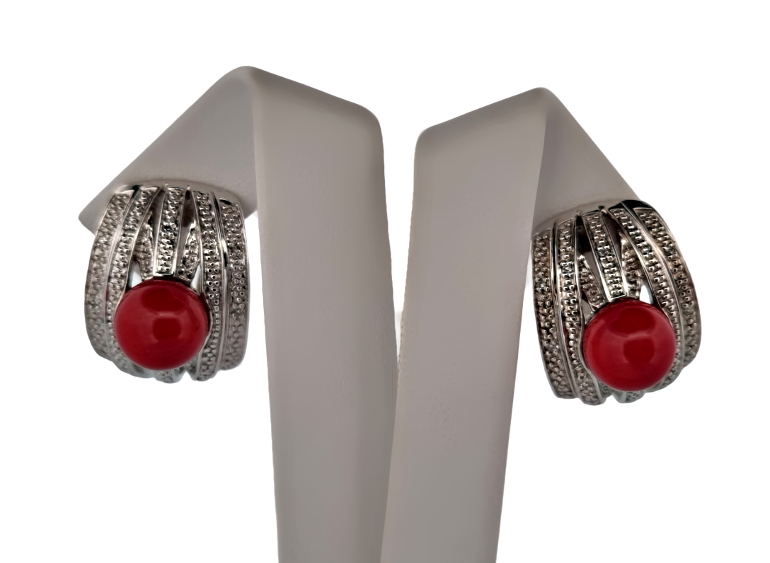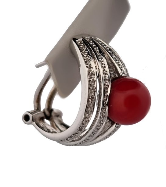 Popis: Stříbrné náušnice zdobené zirkony, s umělým korálem červené barvy. Zapínání je na klips s dříkem.