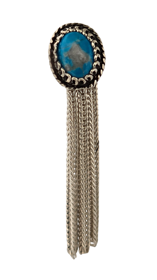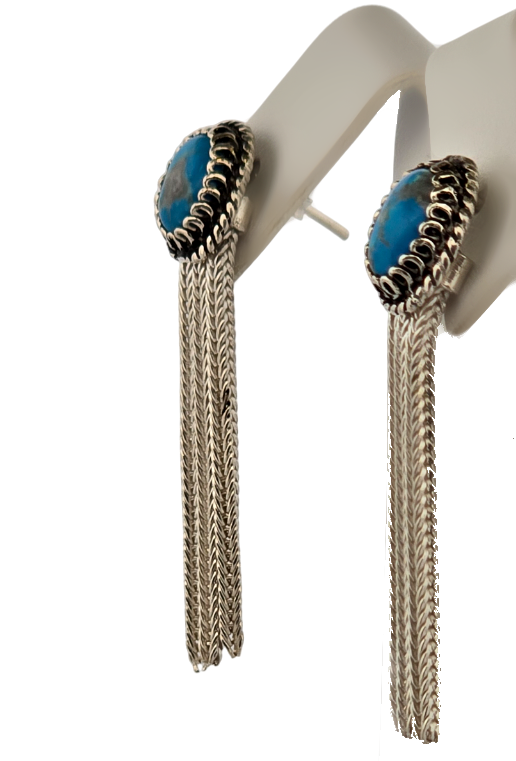 Popis: Stříbrné náušnice s tyrkysem a řetízky, zapínání na puzetku.