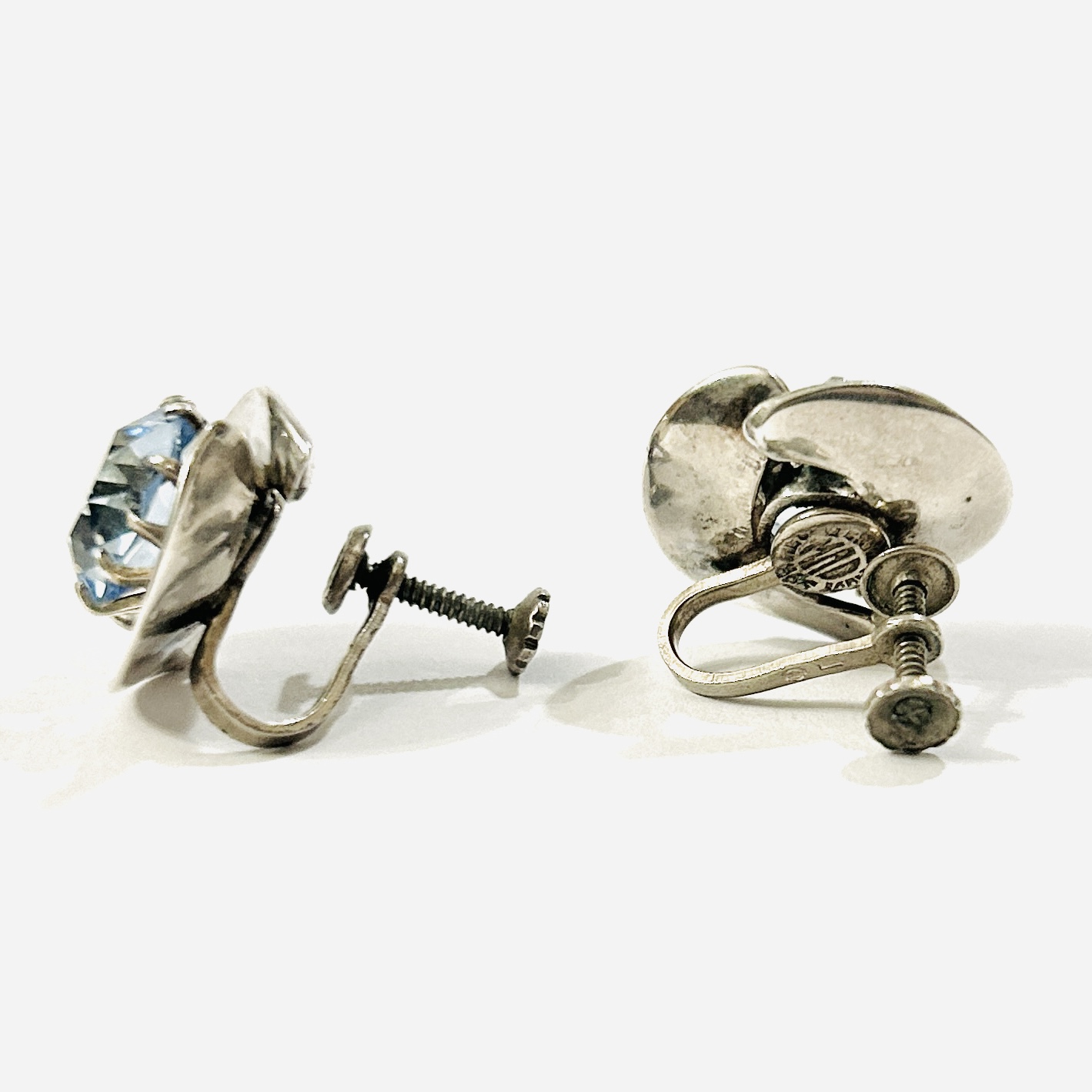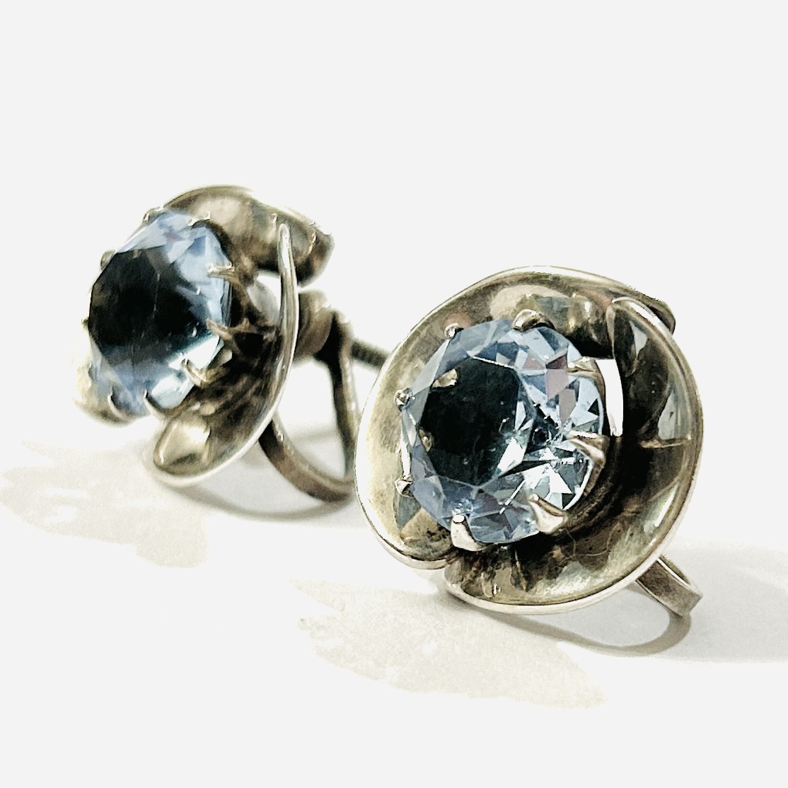 Elegantní, vkusné náušnice v bruselském stylu, spirálovitě tvarovaná hlavice ve středu s modrým kamenem kulatého brusu fasovaném v mnohokrapnové koruně. Kvalitní západoevropská či severoamerická práce z 60. let 20. století.