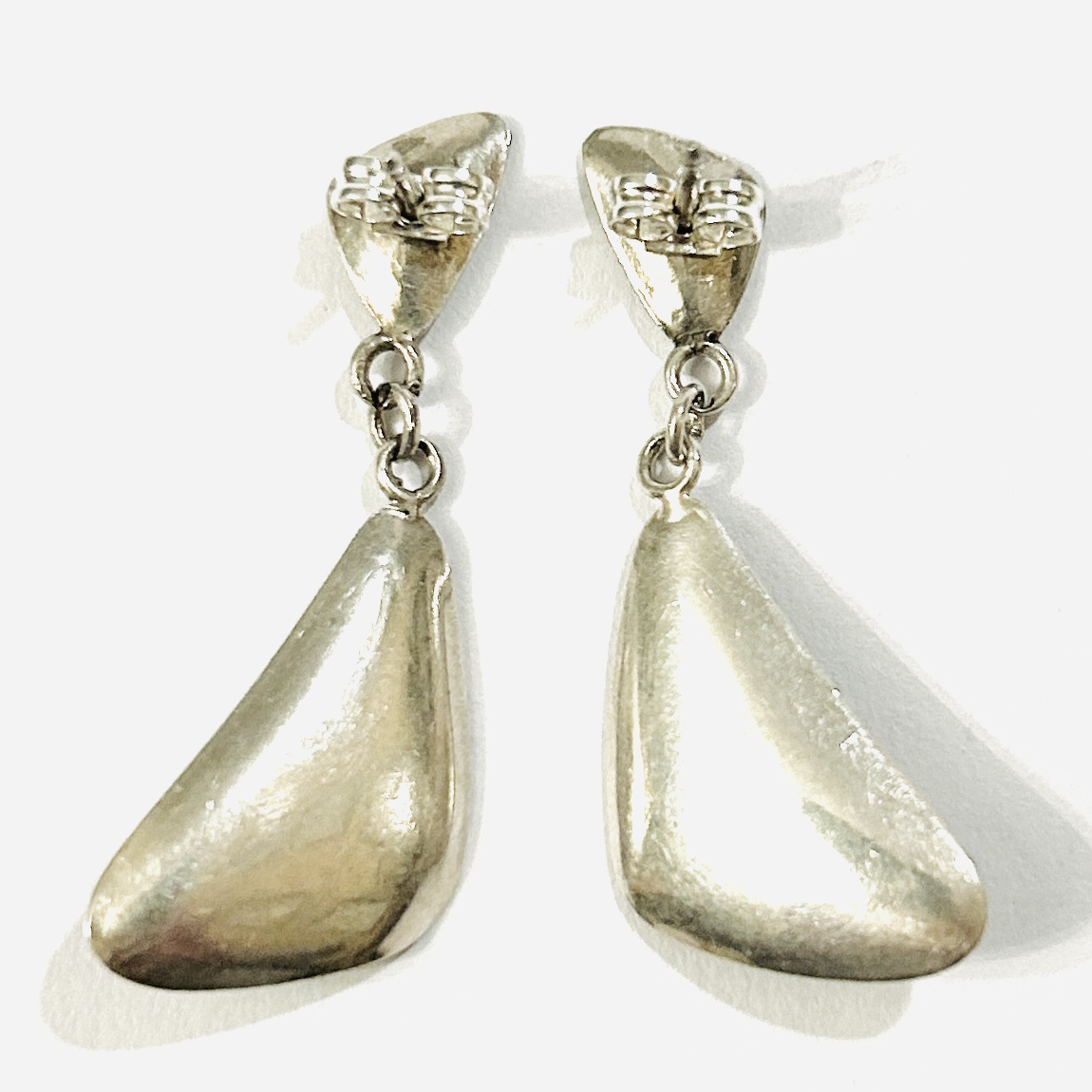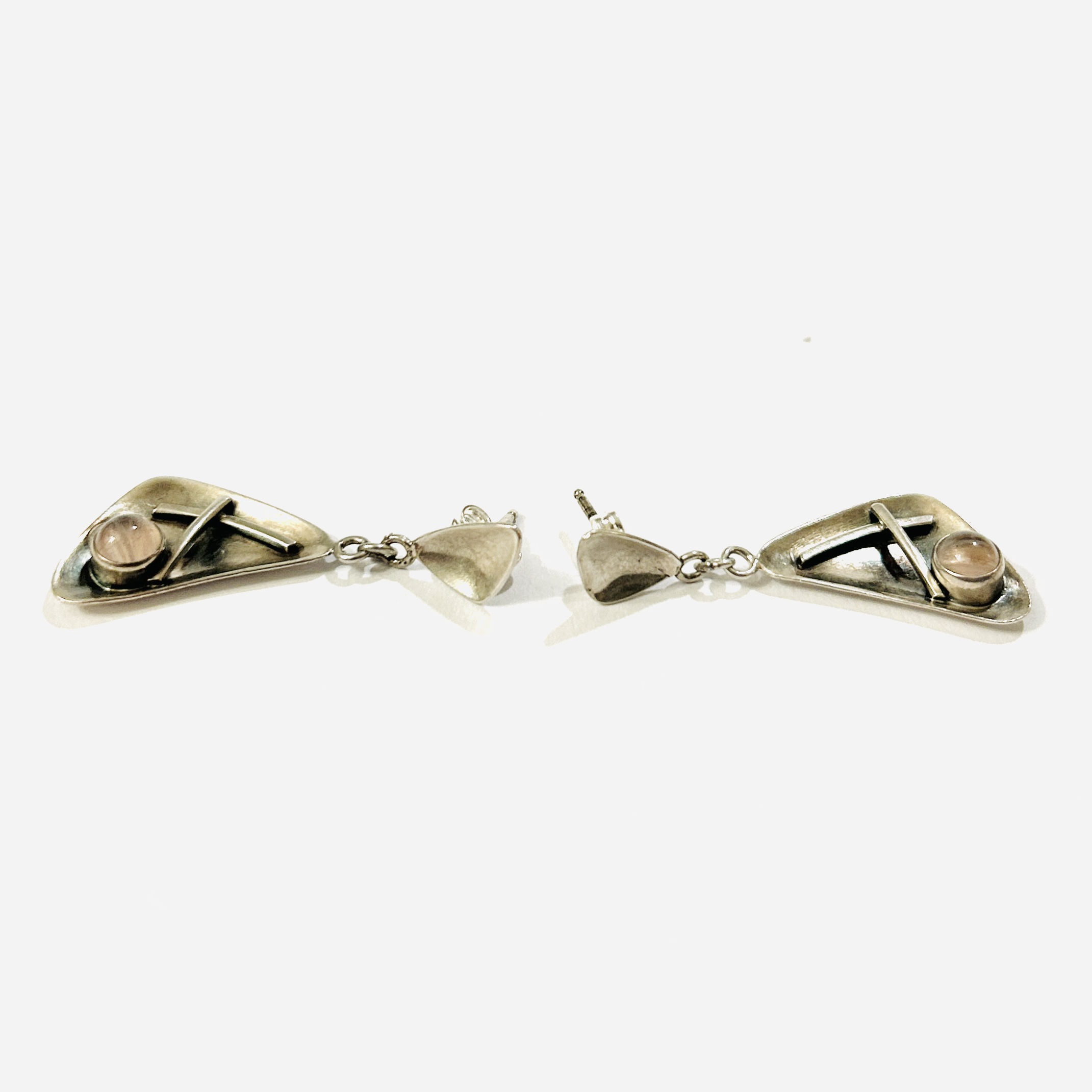 Elegantní, vkusné náušnice v bruselském stylu, ověsek i čelo u zapínání typického buněčného tvaru, miskovitá plocha s kulatou muglí přírodního inkludovaného růženínu, prostorově výraznější zakřivené linie. Patrně severoevropská ateliérová práce z 60. let 20. století.