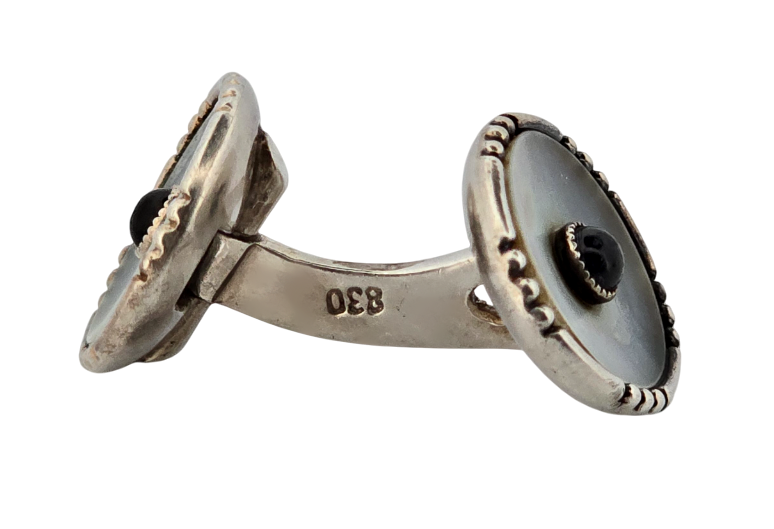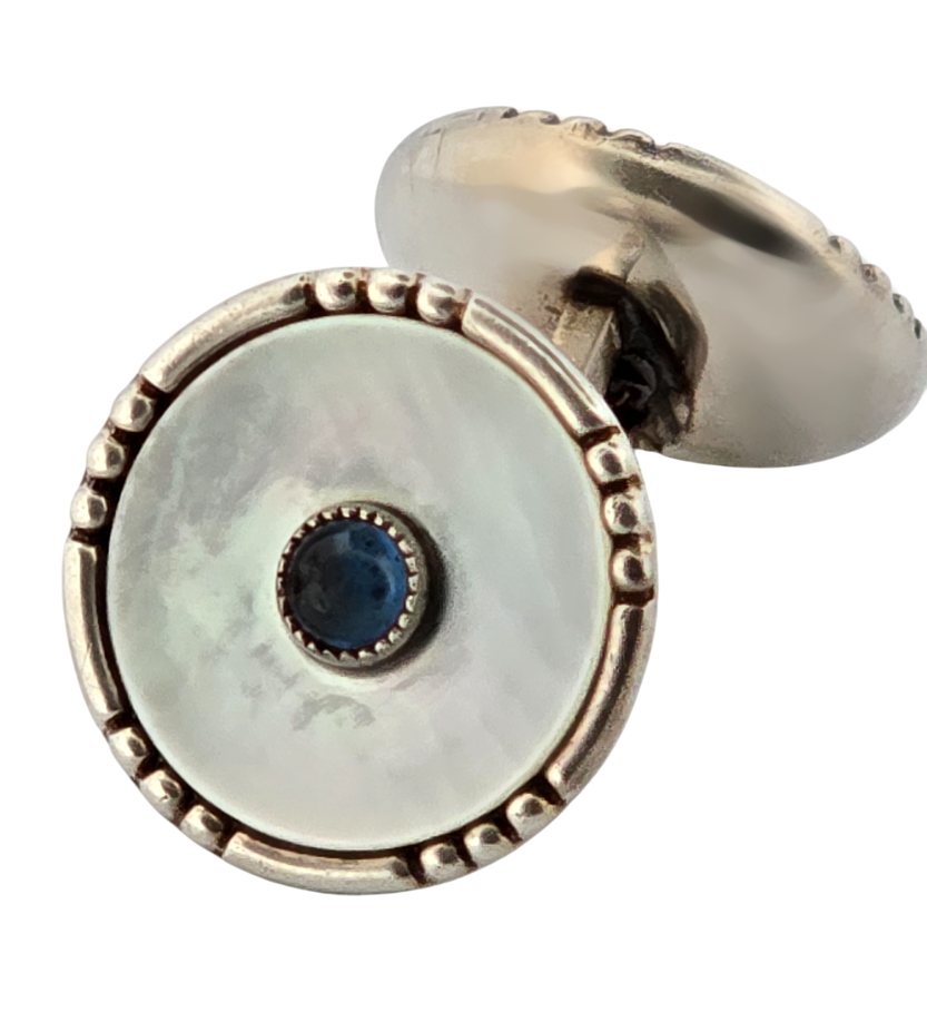 Popis: Stříbrné starožitné secesní manžetové knoflíčky, oboustranné, deailně propracované. Zdobené přírodní lesklou perletí a modrým kabošonošem safírového skla. Jedná se o výjimečný šperk netradičního designu.