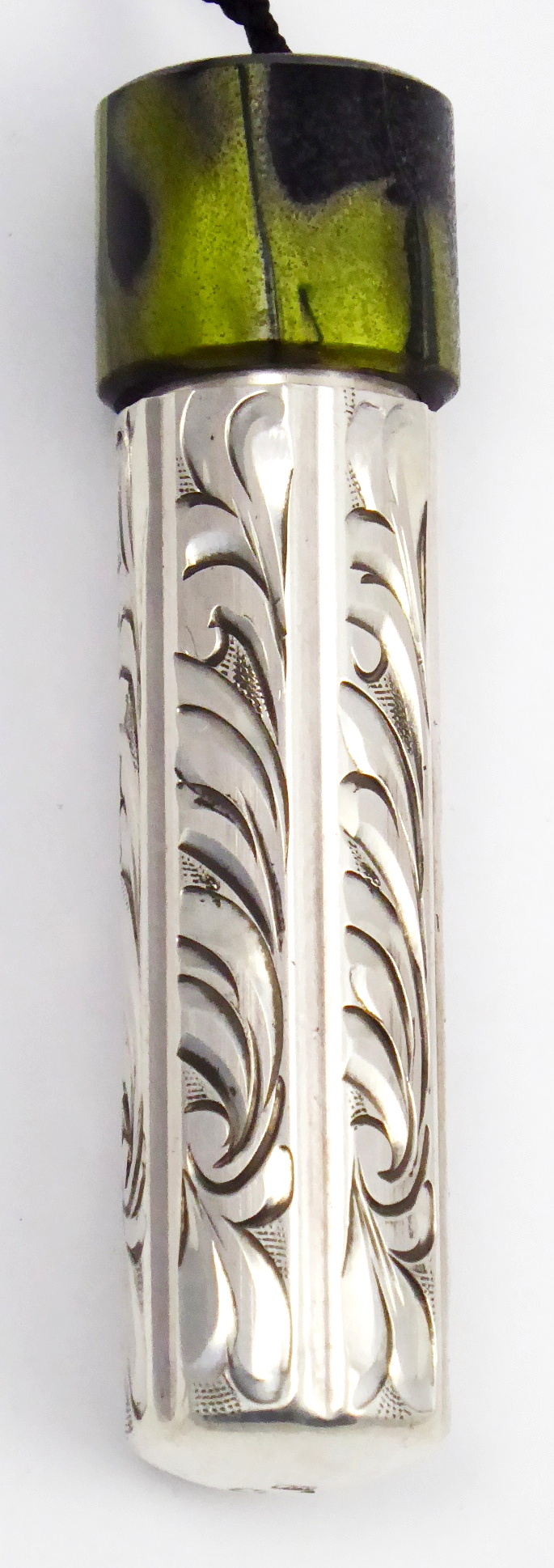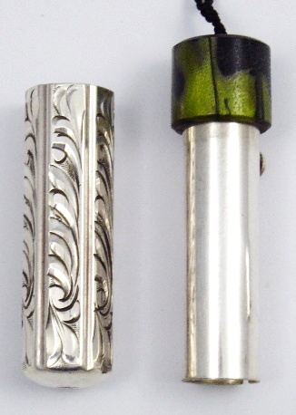 Stříbro, galalit, ozdobný střapec. Ryzost Ag 900/1000, celková hmotnost 14,2 g. Ozdobné stříbrné pouzdro na menší rtěnku dekorované gravírováním se zavíráním z galalitu v efektní barevnosti polární záře za tmavé noci. Dekorativní černý střapec. Pouzdro ve výborném stavu kdysi nechybělo v žádné z luxusnějších kabelek. Značeno: československý punc šachovnice, mistrovská značka a ryzost 900. Československo 1941 – 1949. Délka bez střapce 5,5 cm, průměr 1,2 cm.