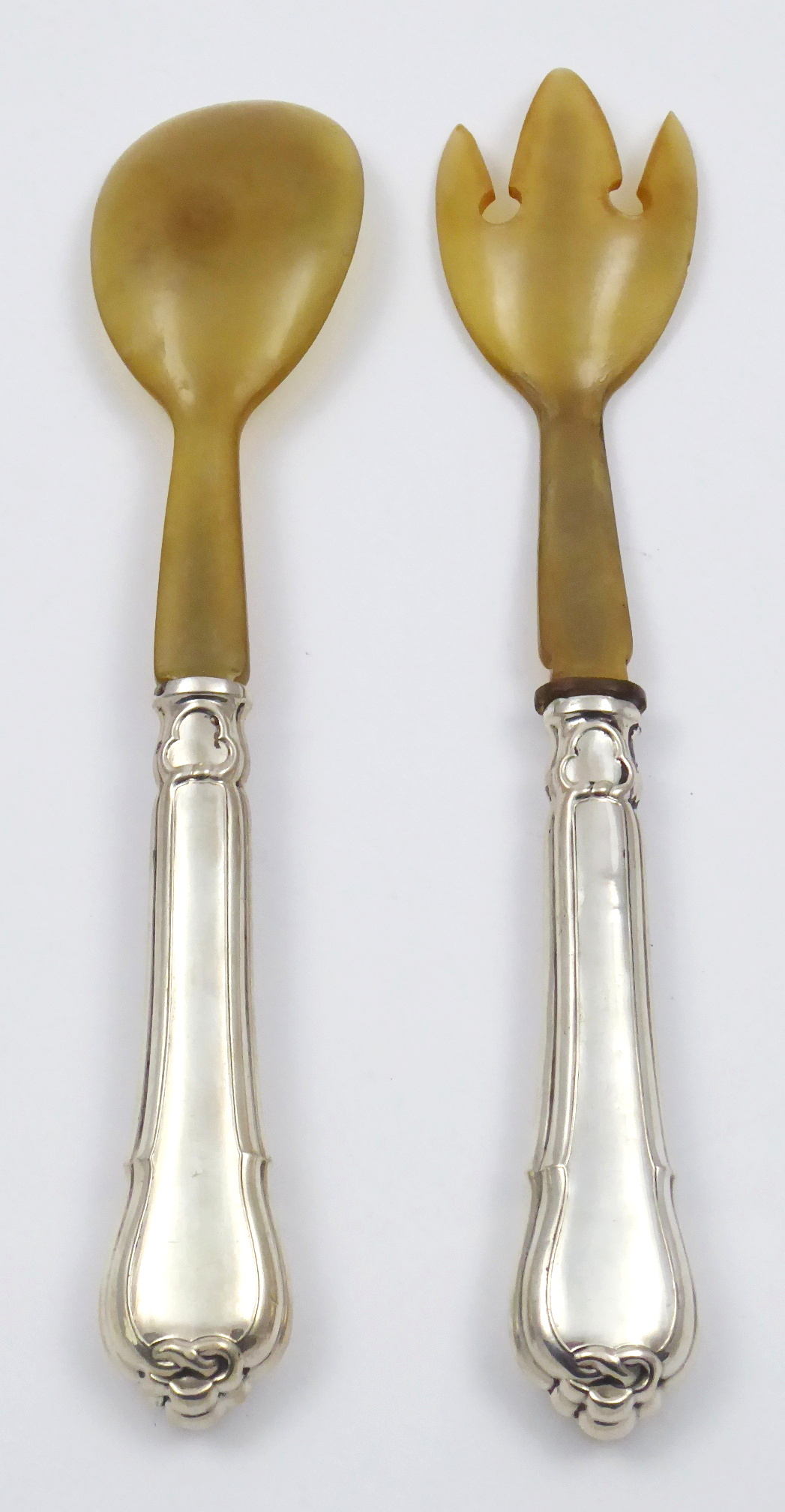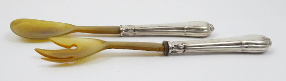 Stříbro, rohovina. Ryzost Ag 750/1000, celková hmotnost 150,35 g. Přiloženo osvědčení Puncovního úřadu České republiky. Příbory na salát se stříbrnou rukojetí zdobenou reliéfními linkami, pletenci a symbolem trojlistu. Horní části z rohoviny. Značeno: ryzost 750. Německo 1870 – 1900. Délka vidlice 26,5 cm, délka lžíce 25,5 cm.