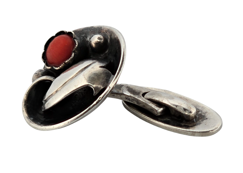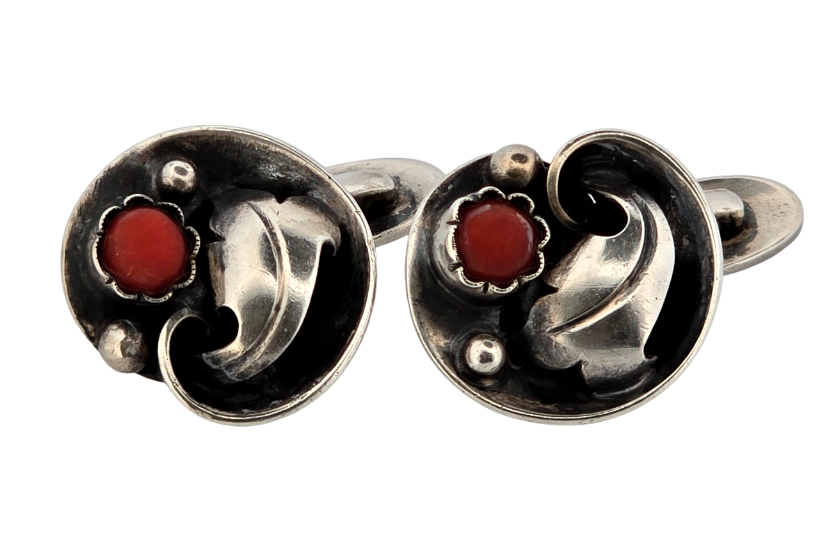 Popis: Výjimečné stříbrné starožitné secesní manžetové knoflíčky s přírodním červeným mořským korálem. Zdobené florálními secesními motivy. Na manžetových knoflíčcích jsou celkem 2 kusy přírodního mořského korálu dobré kvality o průměru cca 9 mm. Elegantní nadčasový secesní šperk.