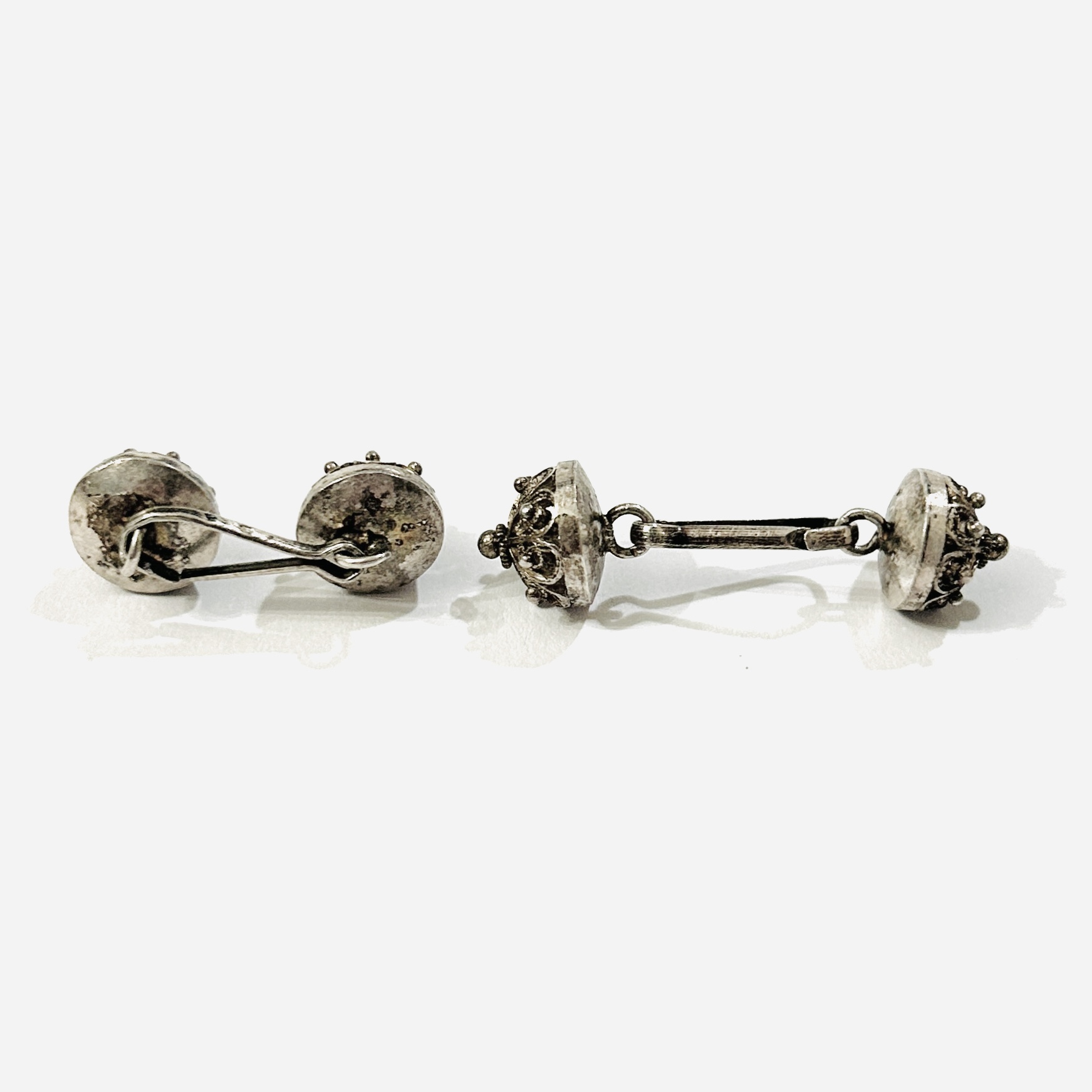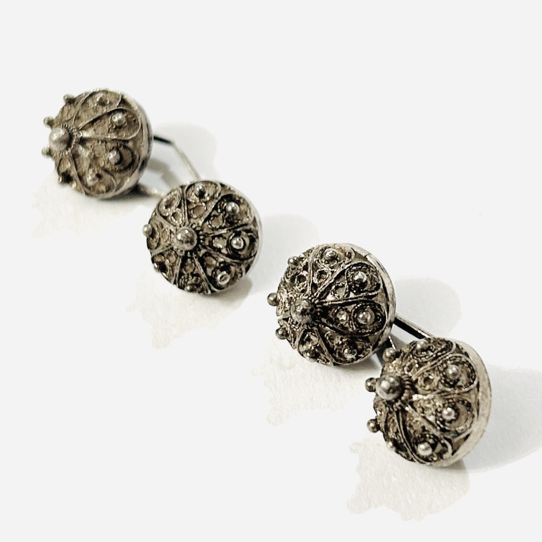 Vytříbené, archaicky působící manžetové knoflíčky z hlavicemi v podobě gombíků zdobených filigránem a granulovanými kuličkami. Neotřelý, dekorativní šperk odkazující ke starověkým zlatnickým technikám, precizní patrně balkánská práce z konce 19. či 1. poloviny 20. století.
