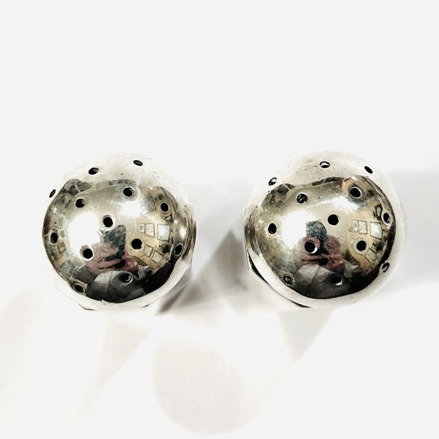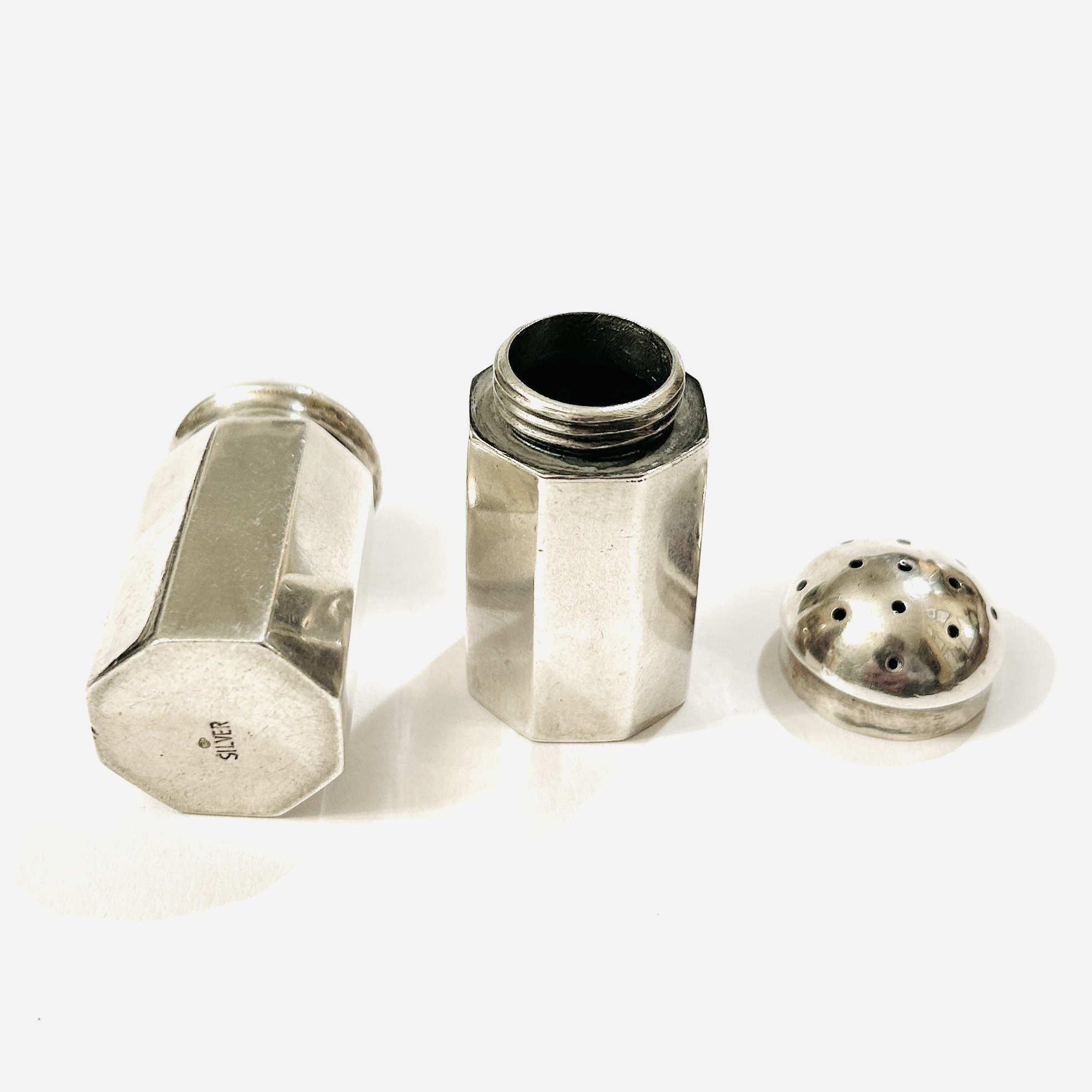 Designem nadčasové párové slánky (sůl a pepř), válcovité zahraněné fazetované tělo s kupolovitým víčkem. Solidní netuzemská stříbrnická práce z 2. třetiny 20. století.