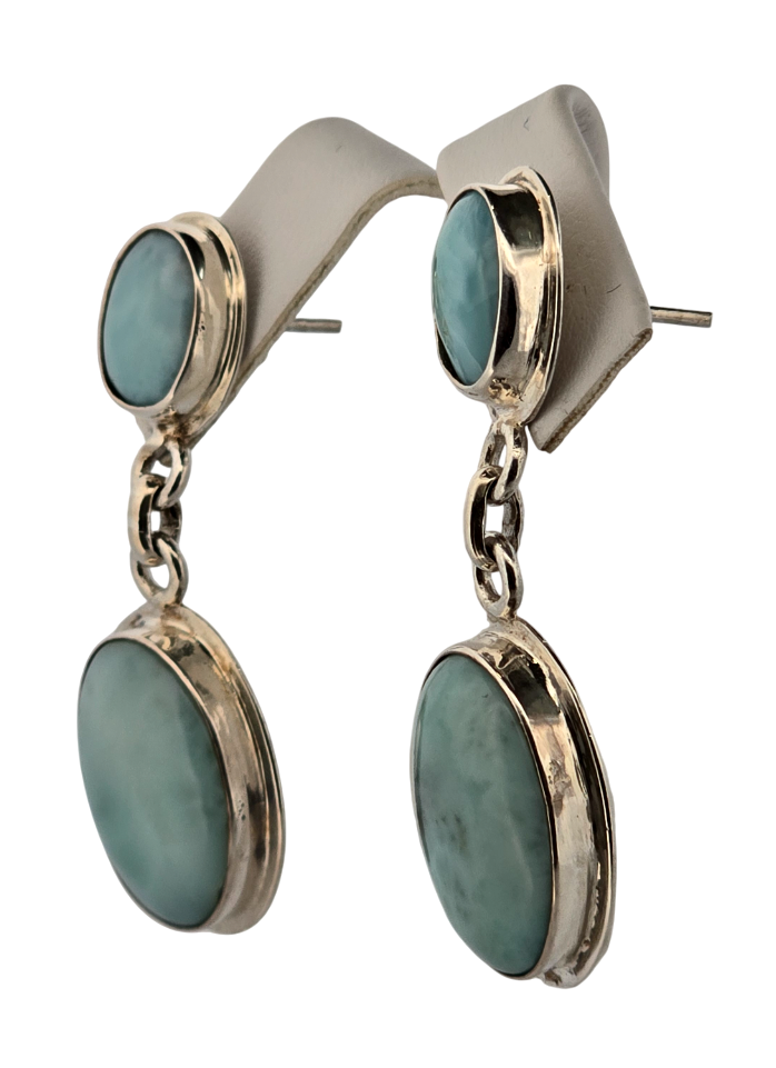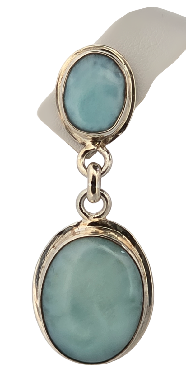 Popis: Stříbrné masivní visací náušnice s přírodním modrým larimarem. Zapínání na puzetku.