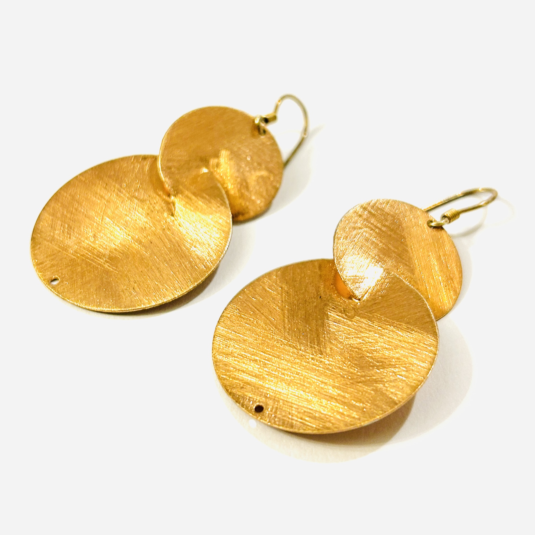 Extravagantní visací náušnice, tělo tvořeno prostorově výraznými propojenými kruhy. Celý povrch zušlechtěn efektním ručním broušením, potaženo červeným zlatem. Patrně evropská ateliérová práce z první pětiny 20. století.