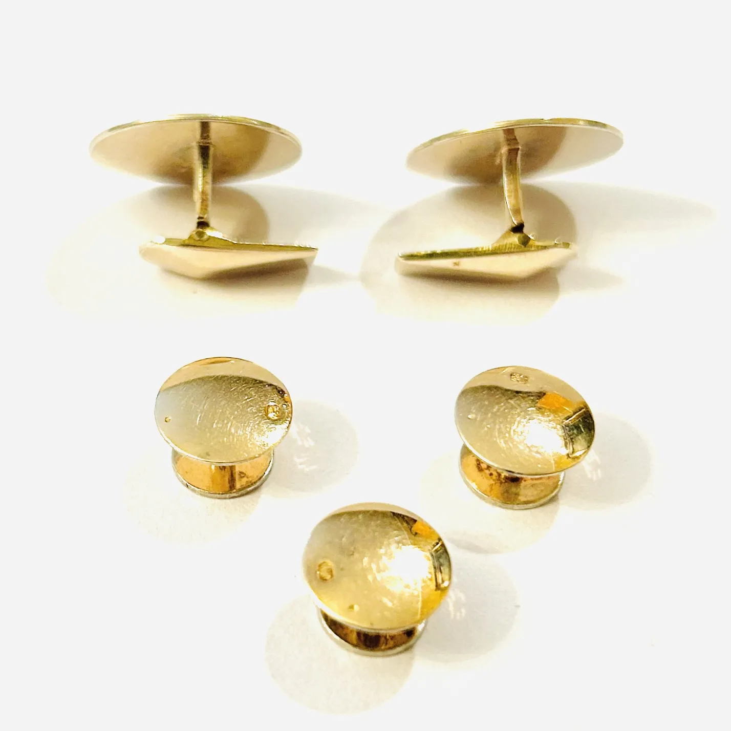 Elegantní souprava manžetových a náprsenkových knoflíčků, kulatá hlavice zušlechtěna jemným kruhovým gilošováním s centrálním motivem šestihroté hvězdy. Designem nadčasový pánský šperk, kvalitní západoevropská zlatnická práce ze 4. čtvrtiny 19. století dovezená na naše území ve stejném období.