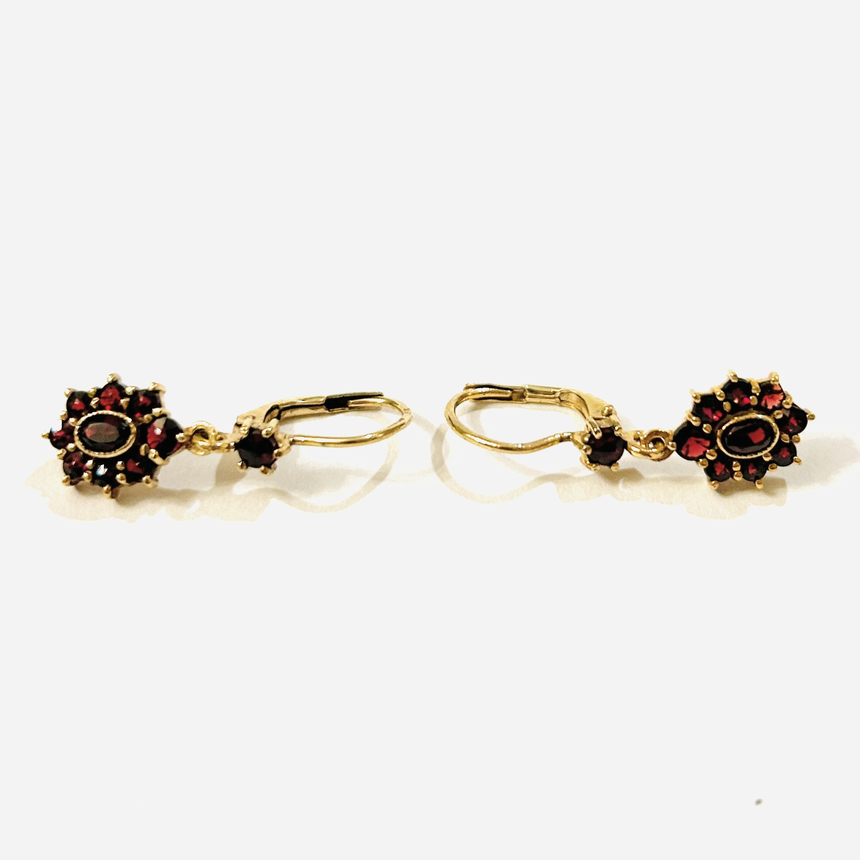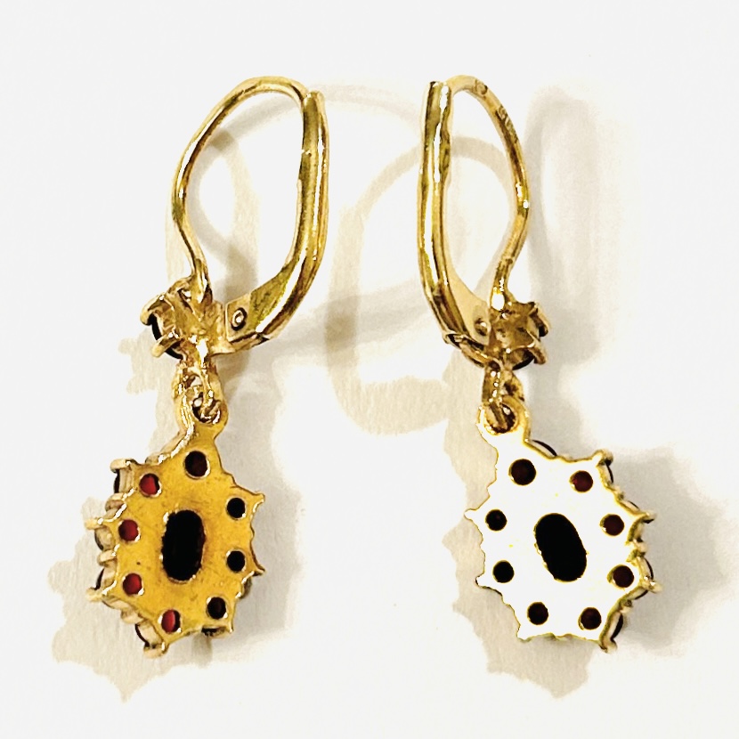 Elegantní, tradičně pojaté visací náušnice s oválným ověskem osazeným českými granáty kulatého hvězdicového a oválného brusu, fasováno zrnkovou technikou. Kvalitní práce DUV Granát v Turnově z 80. až první poloviny 90. let 20. století.